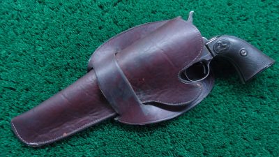C412 COLT FIRST GENERATION SINGLE ACTION ARMY IN CALIBER 38 COLT; 5-1/2 inch barrel with a good shiny bore. Overall metal has turned a plum/grey color with some light pitting. Good traces of original finish in protected areas. “38 Colt” is faintly visible on left side of the barrel. Rampant Colt insignia on the left side of the frame. Nice action. Replacement Colt grips. Comes with an unmarked leather holster in good condition. The 38 Colt caliber was first introduced in 1886 and was discontinued in 1914. This example was manufactured in 1912. A scarce Colt as only 1,011 Standard Frames were made in this caliber.