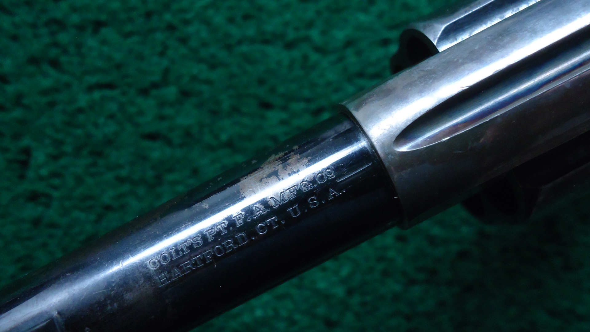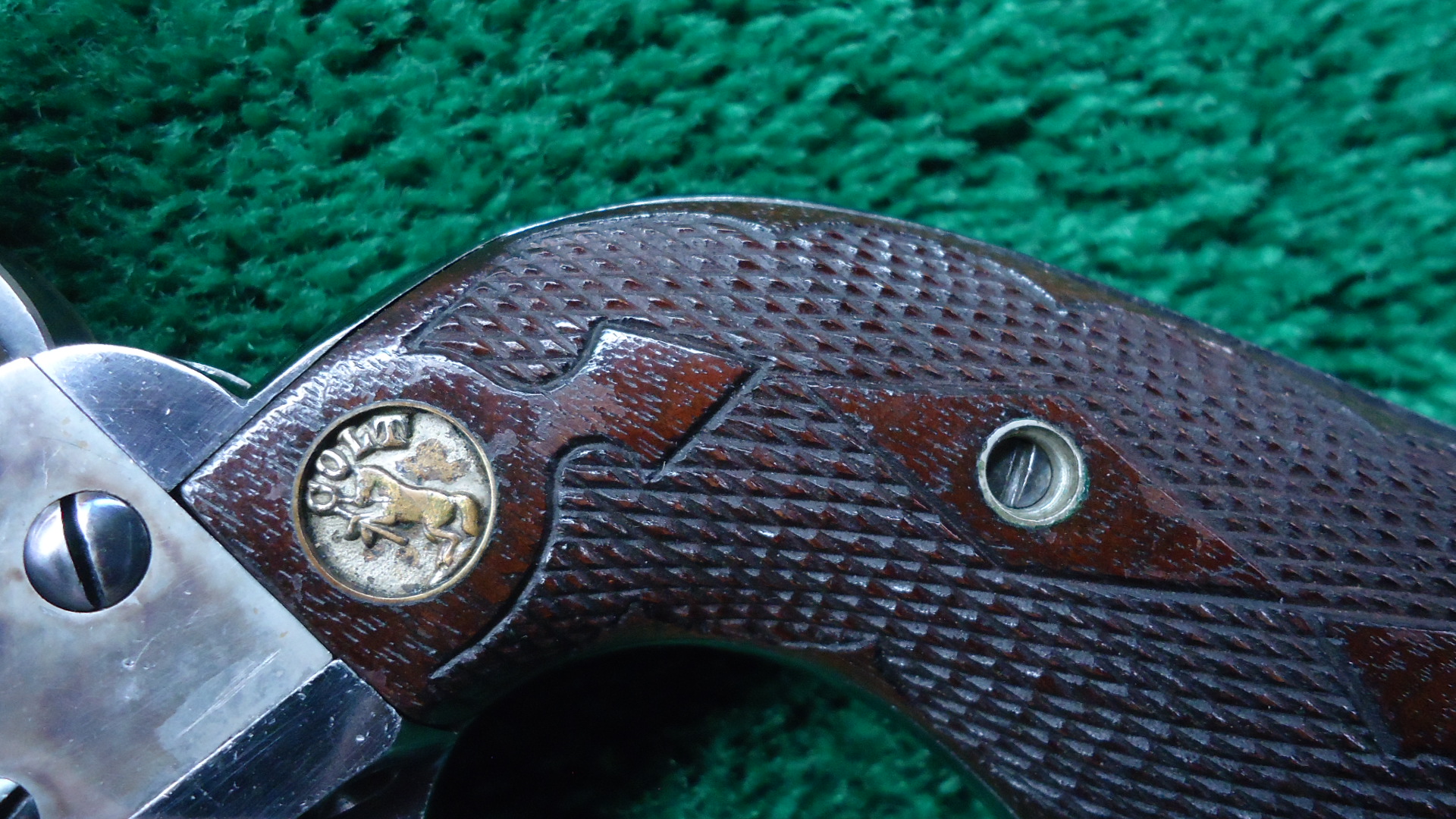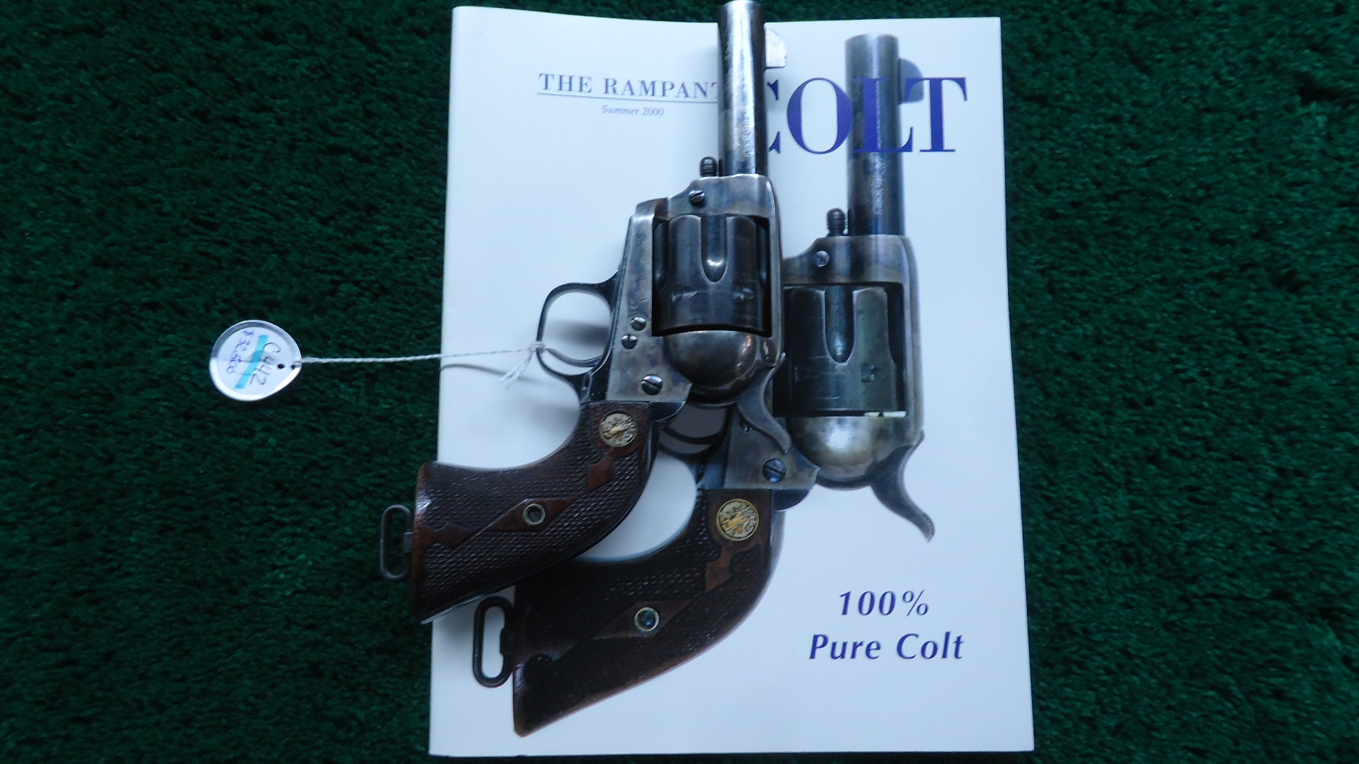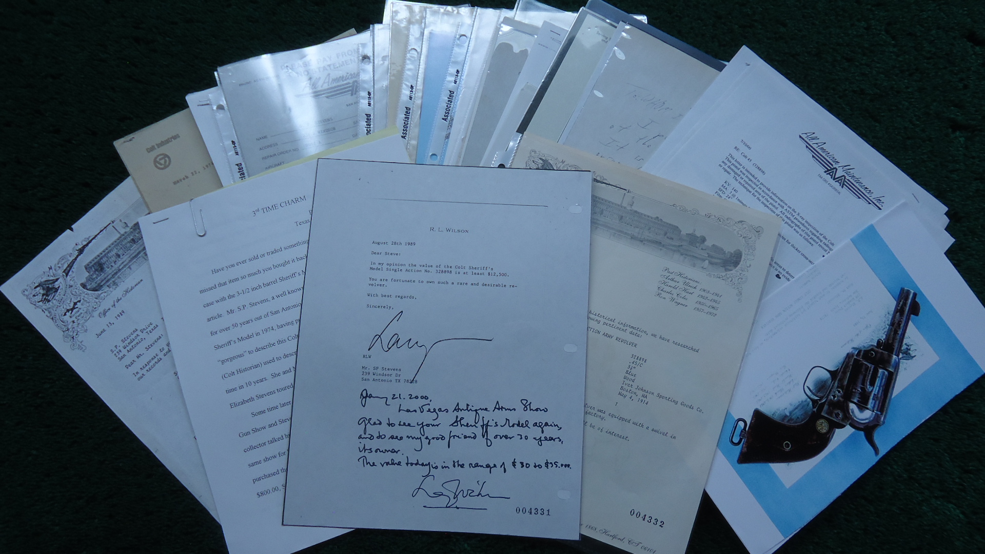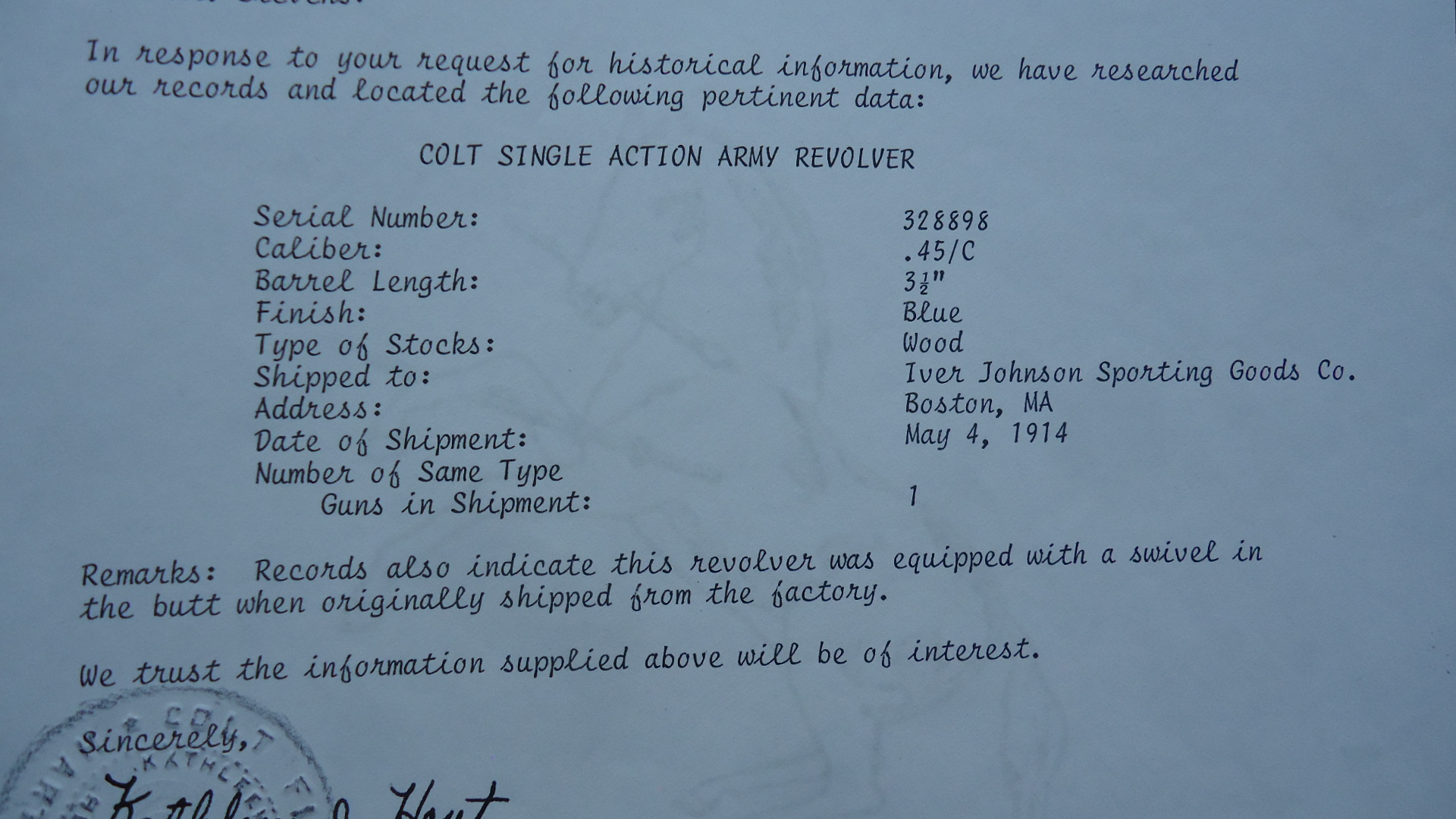 C442 VERY NICE COLT SHERIFFS MODEL IN 45 LC WITH DOCUMENTATION; Colt revolver features a 3-1/2 inch round barrel chambered in 45 LC caliber with a bright shiny excellent bore. The Sheriff’s Model came without ejectors and ejector housings. Most were produced in 45 LC as was this one. The metal surfaces retain much of the original high polish blue finish on the barrel and cylinder with a gray patina on the balance. Vivid case colors remain on the frame and hammer. Walnut grips feature highly attractive checkered fleur-de-lis with Colt medallions. This revolver is also equipped with a swivel in the butt when originally shipped from the factory. Crisp action functions properly. Serial number manufacture date of 1914. Comes with a factory letter stating the caliber and barrel length and shipped to Iver Johnson Sporting Goods Co. in Boston, MA on May 4, 1914 as the only gun in the shipment. This special order Colt that was custom built and produced very late in the Sheriff’s Model run. It has no assembly number on the loading gate as it was a one of a kind special order. This exact revolver is featured on the cover of the included Summer 2000 issue of “The Rampant Colt” magazine. There is a folder full of paperwork and letters about the gun. Under 600 ejector-less Single Action Army revolvers were produced in all calibers from 1882 to the 1930s. This is an opportunity to add this famous well documented one of a kind Colt to your collection.