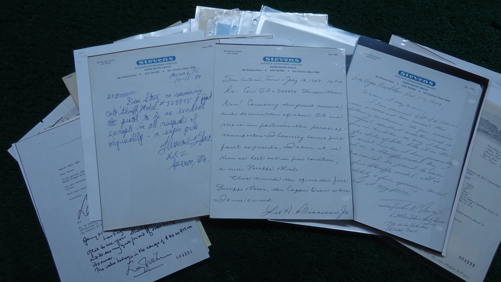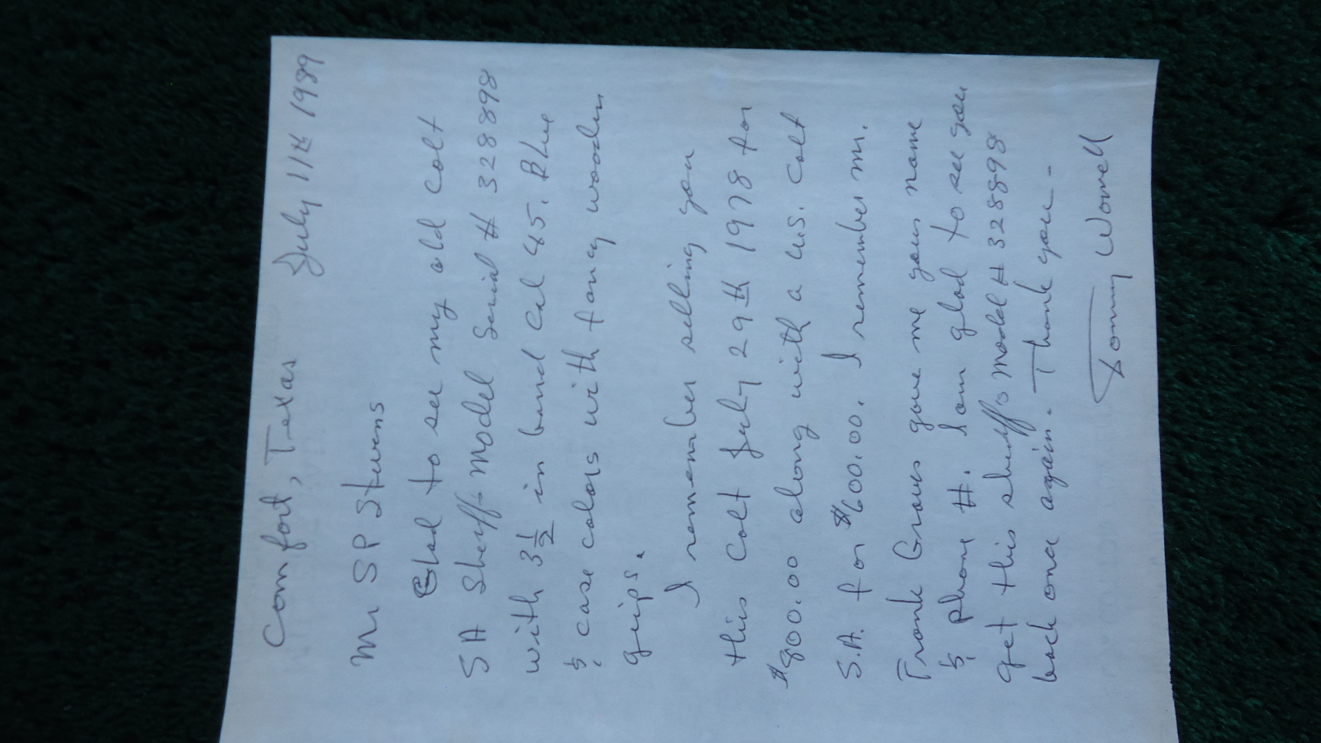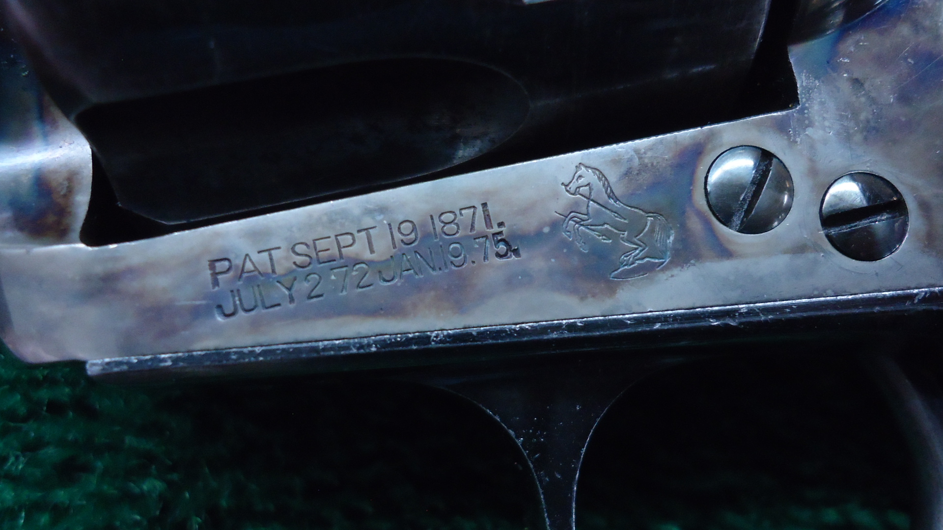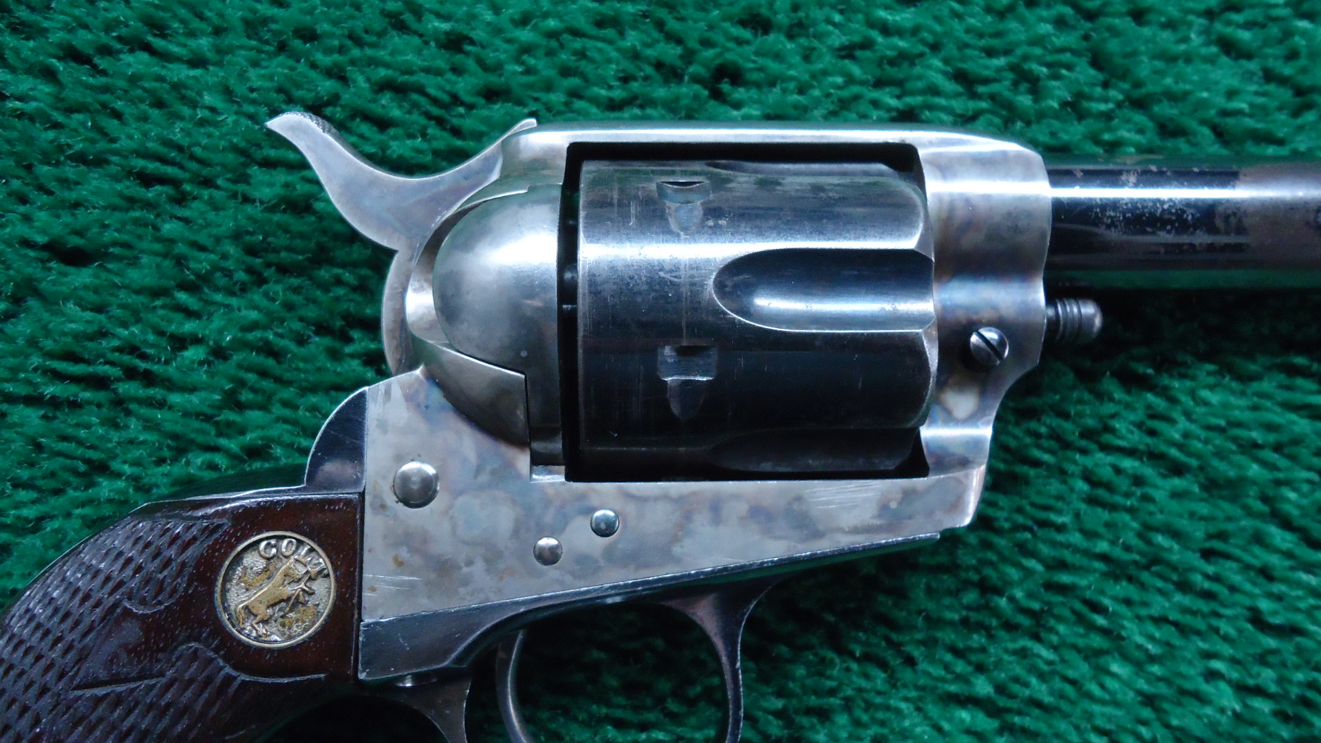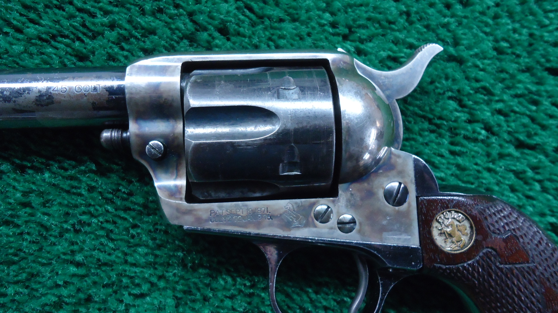 C442 VERY NICE COLT SHERIFFS MODEL IN 45 LC WITH DOCUMENTATION; Colt revolver features a 3-1/2 inch round barrel chambered in 45 LC caliber with a bright shiny excellent bore. The Sheriff’s Model came without ejectors and ejector housings. Most were produced in 45 LC as was this one. The metal surfaces retain much of the original high polish blue finish on the barrel and cylinder with a gray patina on the balance. Vivid case colors remain on the frame and hammer. Walnut grips feature highly attractive checkered fleur-de-lis with Colt medallions. This revolver is also equipped with a swivel in the butt when originally shipped from the factory. Crisp action functions properly. Serial number manufacture date of 1914. Comes with a factory letter stating the caliber and barrel length and shipped to Iver Johnson Sporting Goods Co. in Boston, MA on May 4, 1914 as the only gun in the shipment. This special order Colt that was custom built and produced very late in the Sheriff’s Model run. It has no assembly number on the loading gate as it was a one of a kind special order. This exact revolver is featured on the cover of the included Summer 2000 issue of “The Rampant Colt” magazine. There is a folder full of paperwork and letters about the gun. Under 600 ejector-less Single Action Army revolvers were produced in all calibers from 1882 to the 1930s. This is an opportunity to add this famous well documented one of a kind Colt to your collection.