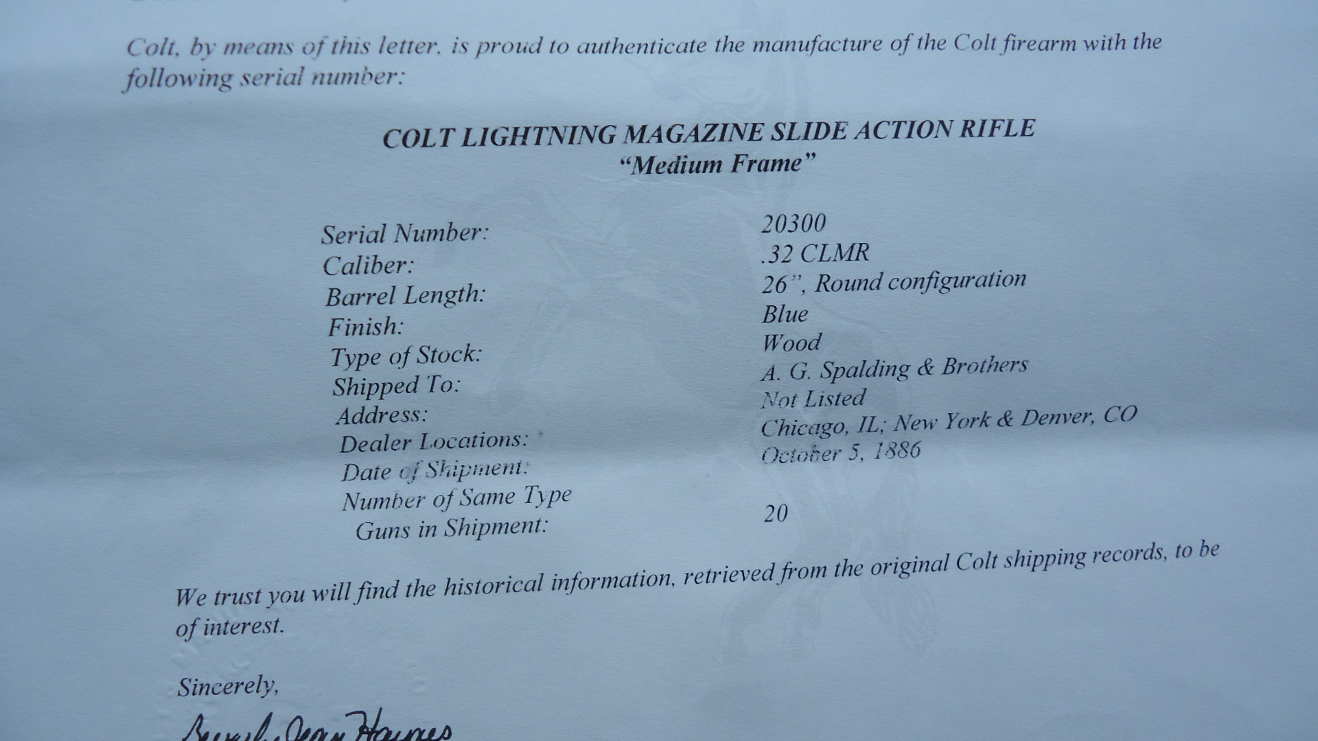 C449 MEDIUM FRAME COLT LIGHTNING RIFLE IN 32 WCF ; 26 inch round barrel rifle chambered in 32 WCF caliber with a bright shiny near excellent bore. Sights include a blade front and flattop sporting rear. Barrel and full length magazine tube are a gray/brown patina with some blue in the protected areas. This is the First Type Receiver with the partial exposed bolt visible through the open ejection port on the top. It has traces of blue in the protected areas with some thinning and fading to a gray/brown. More gray on the right side and more brown on the left side. Loading gate is gray. Hammer has traces of case colors. There are a couple buggered screws. Walnut stocks are in good condition with some minor handling mars. This has the early type checkered forearm with worn checkering. Crescent rifle style buttplate. Nice functioning action. Complete with Colt Factory Letter stating 1886 manufacture date.
