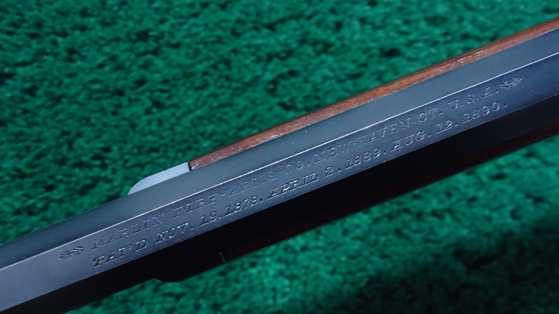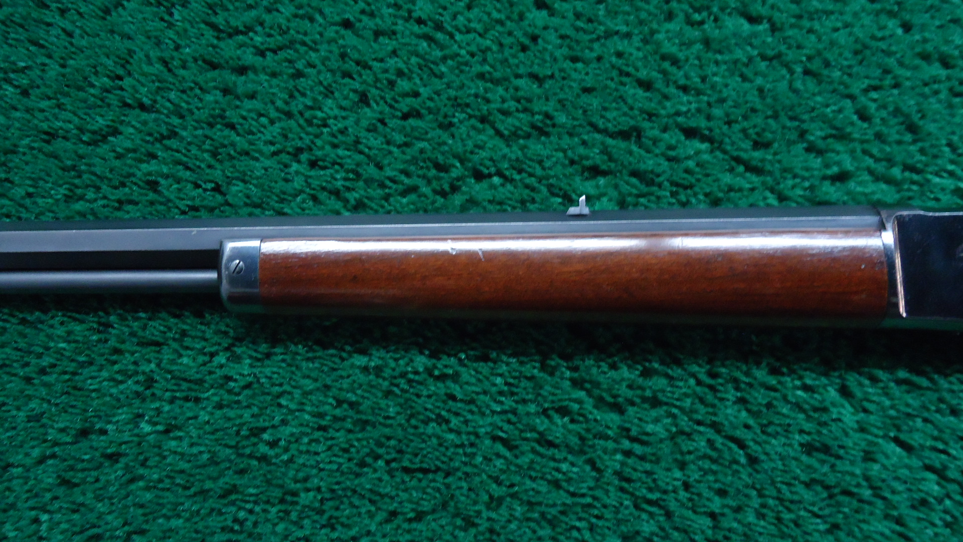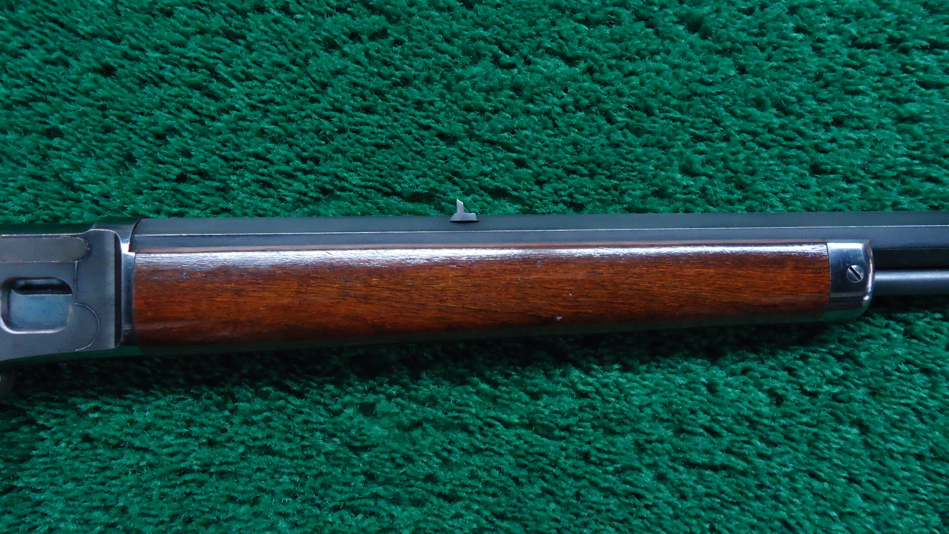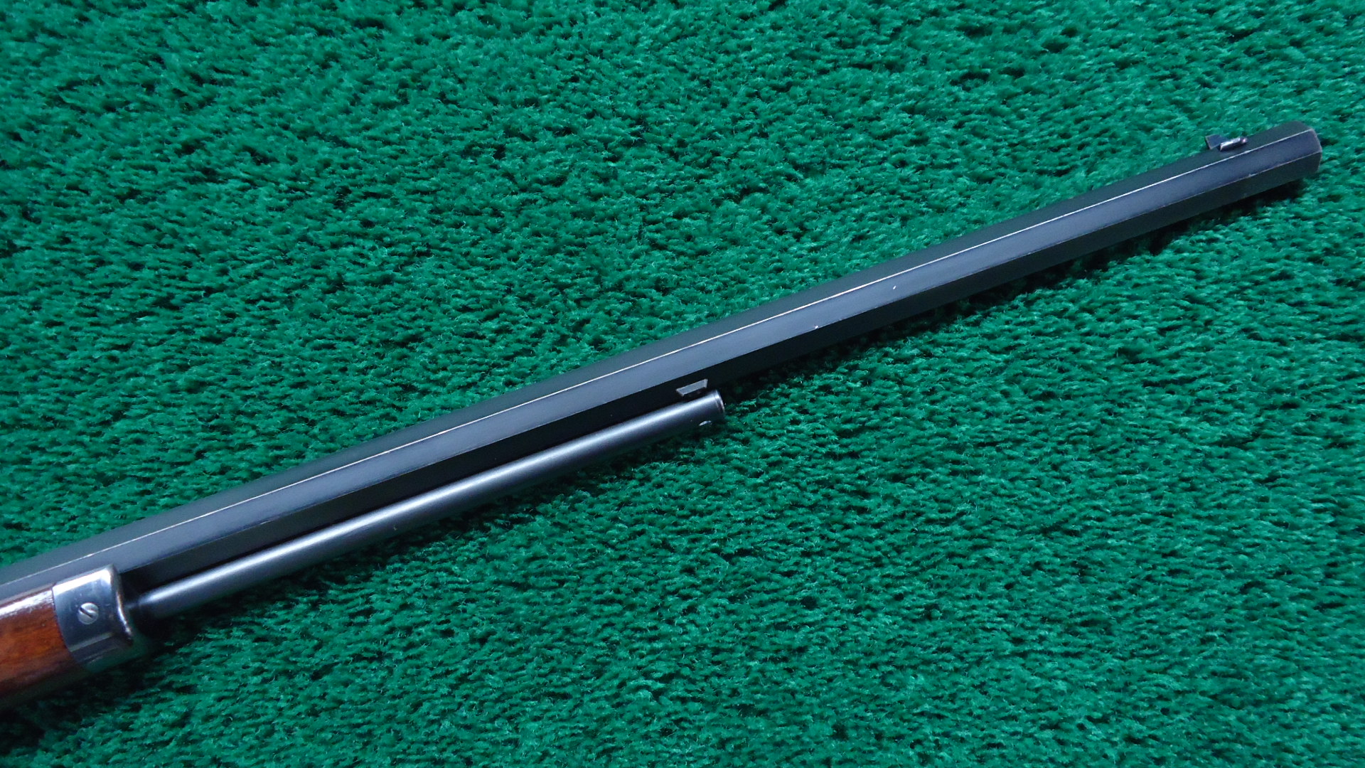 JM1579 VERY FINE MARLIN MODEL 1891 FIRST VARIATION 22 CALIBER RIFLE; 24 inch octagon barrel with a plain blade front sight and v-notch rear sight. This gun is in beautiful condition ; the barrel and magazine tube retaining most all original glossy blue with just some sharp edge wear and sparsely scattered tiny dings. All markings are crisp and clear. The action has most blue as well with some minor light flaking. Case colors on the trigger, hammer, lever and buttplate. Wood stocks are in very good condition and fit well. This is a Dandy Marlin side-loader that would be hard to improve upon. Only about 5000 first variation rifles were manufactured and they are difficult to find in any condition.