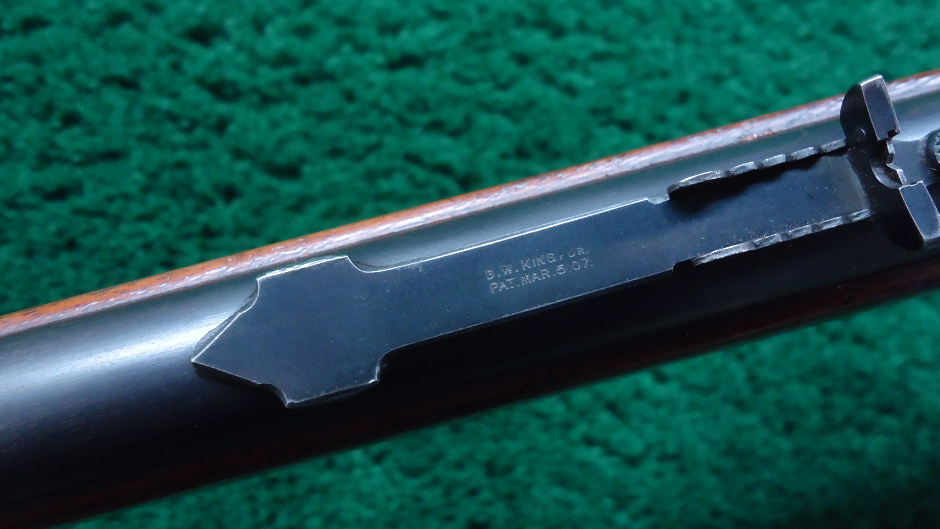 JM1580 MARLIN MODEL ’92 RIFLE IN 32 RF; 28 inch round barrel chambered in 32 RF caliber with a bright shiny excellent bore. Sights include a Lyman beaded blade front and King flattop sporting rear. Barrel and tubular magazine tube retain most all original blue with some light scratches. Receiver retains about 95% original blue with light wear and flaking and toning to brown. Hammer and lever retain good traces of case colors. Walnut stocks are very good with an added coat of finish over light dings and minor handling marks. Wood fits well and is proud to the metal. Crescent buttplate. Nice smooth functioning action. Comes with an additional rimfire firing pin. The Model 1892 was made from 1892-1916 and was later renamed the Model 92 in 1905. This fine example was likely manufactured between late 1907-1909.