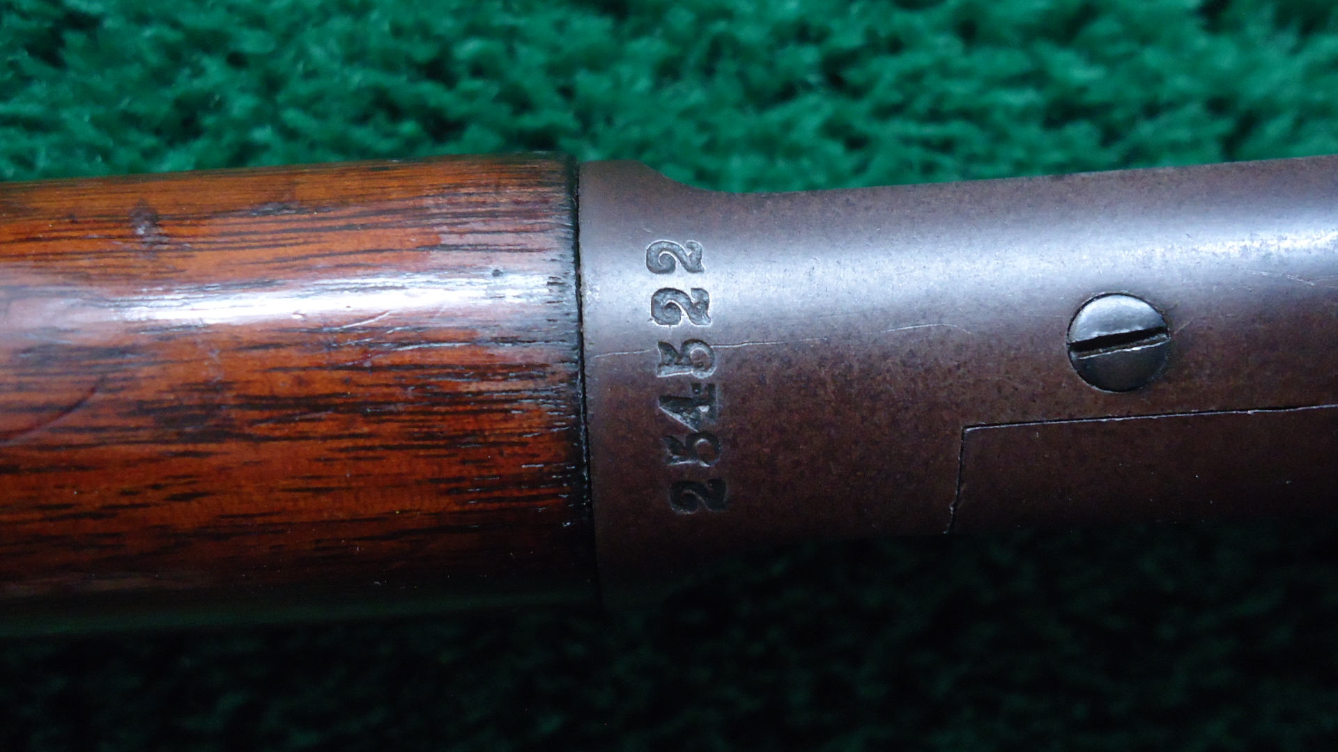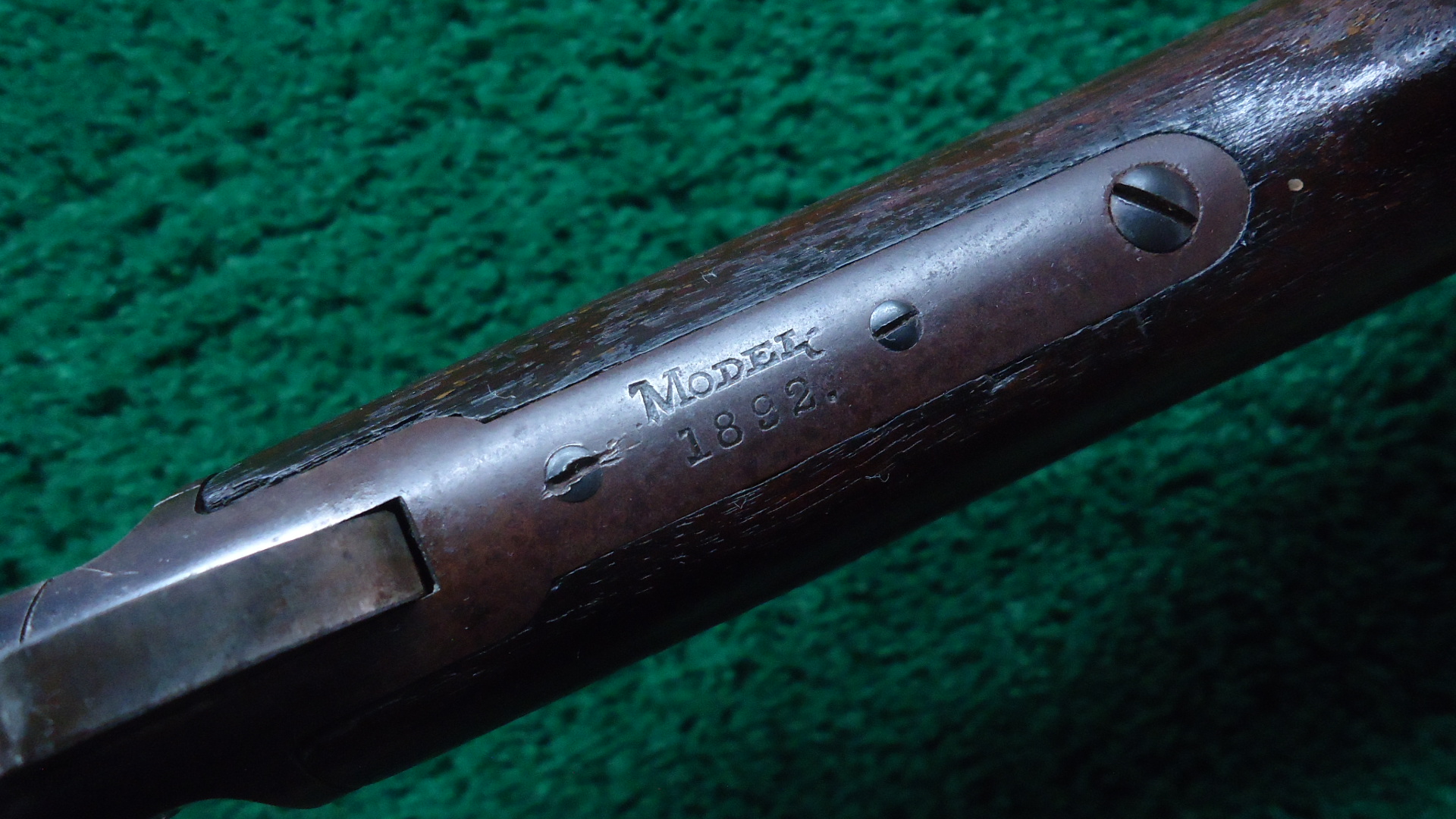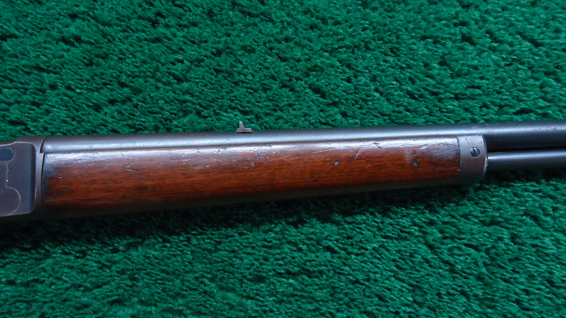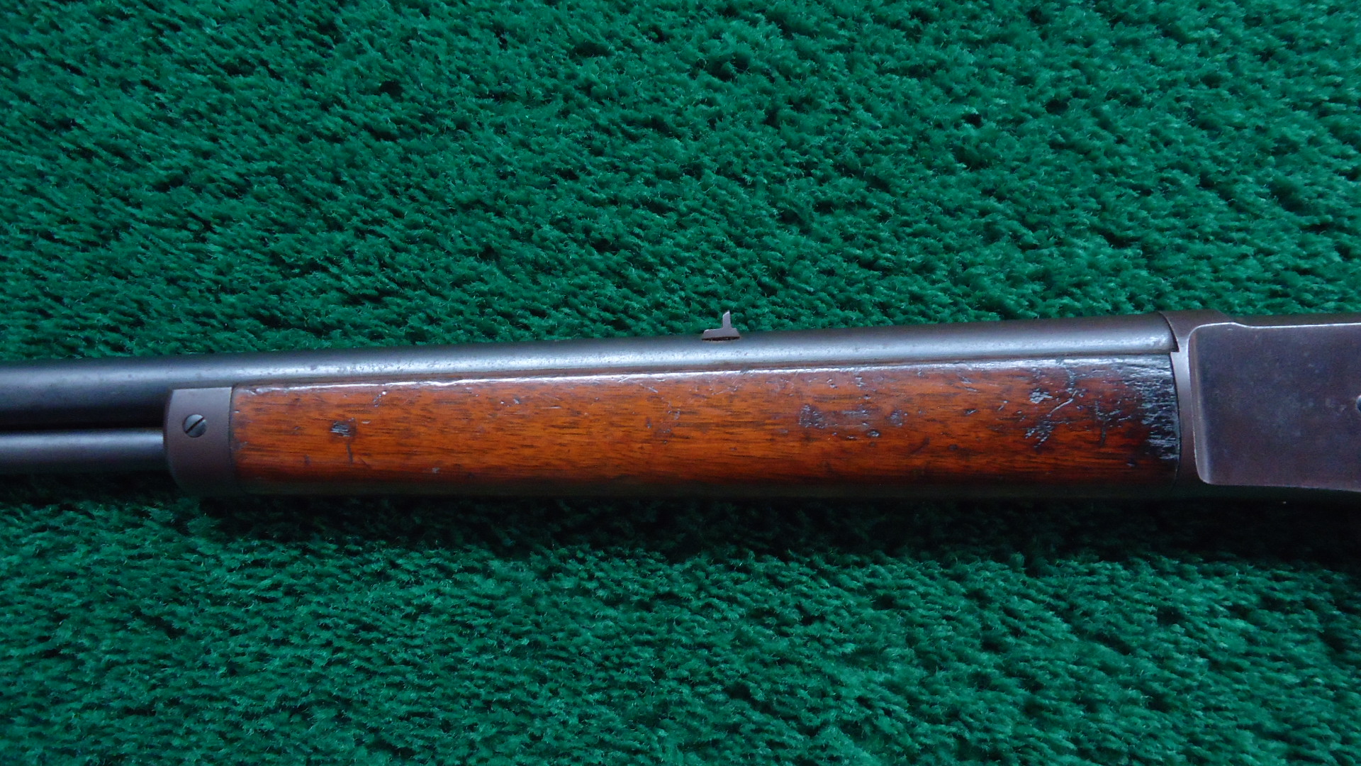 JM1582 MARLIN MODEL 1892 RIFLE IN 22 RF; 24 inch round barrel chambered in 22 LR caliber with a very good bore with some light roughness and good rifling. Sights include a plain blade front and a standing v-notch rear. Barrel and full length magazine tube are a mix of original blue and gray/brown patina showing some old surface oxidation. Receiver has a similar appearance with original bright blue in the protected areas. Hammer and lever retain good traces of darkened case colors. Walnut stocks are remain in very good condition with some original varnish showing some light handling and usage mars. A repaired chip at the toe. The buttplate is a plastic reproduction. Nice smooth functioning action. The Model 1892 was made from 1892-1916 and was later renamed the Model 92 in 1905. This rifle was manufactured between late 1903-1904.