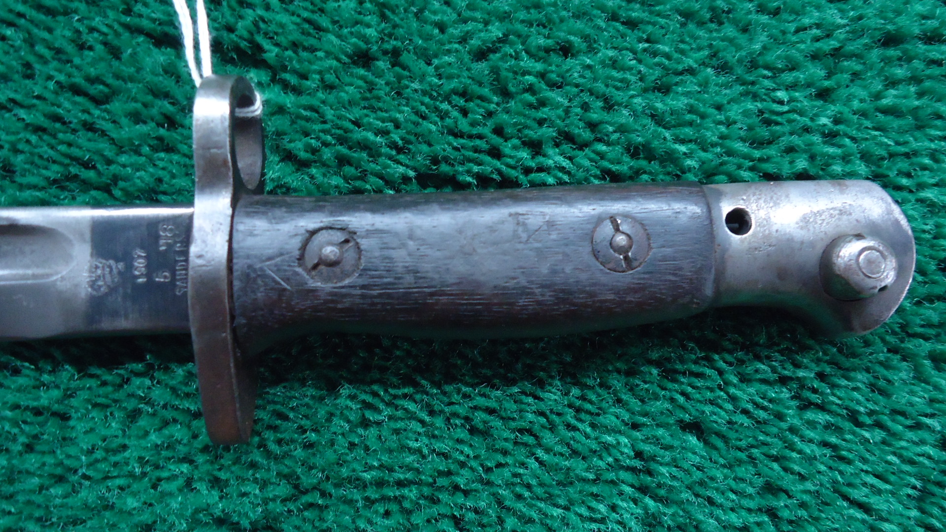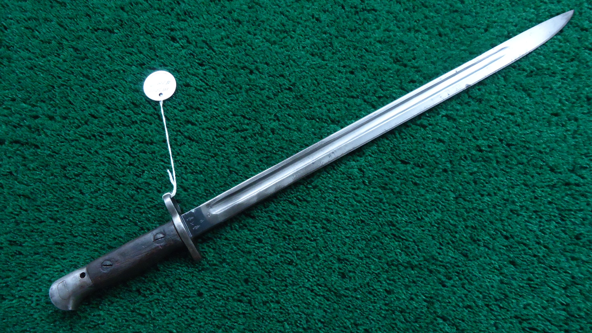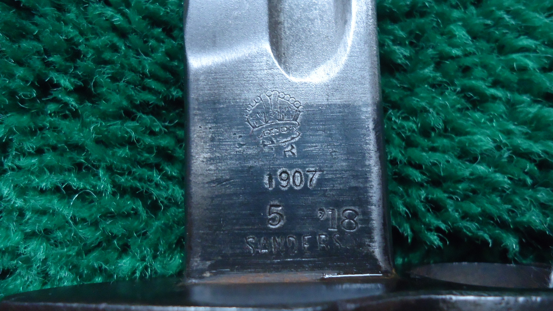 M2045 WW1 BRITISH P14 ENFIELD BAYONET; Blade is 17 inches with overall length of 21-1/2 inches. No scabbard. Left side of the blade is marked with the English Crown and “1907 5 ’18 Sanderson” Right side has proof marks and army units. Metal is grey/brown with some oxidation. Wood handle is in good condition. Lug latch works.
