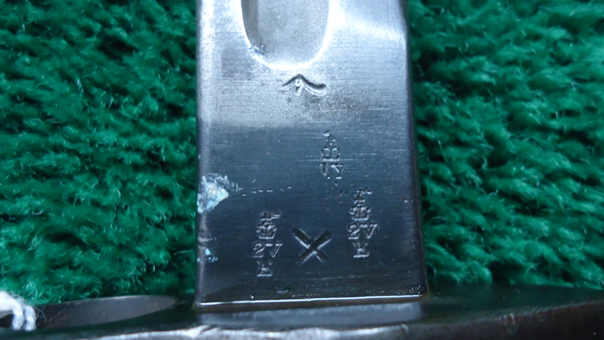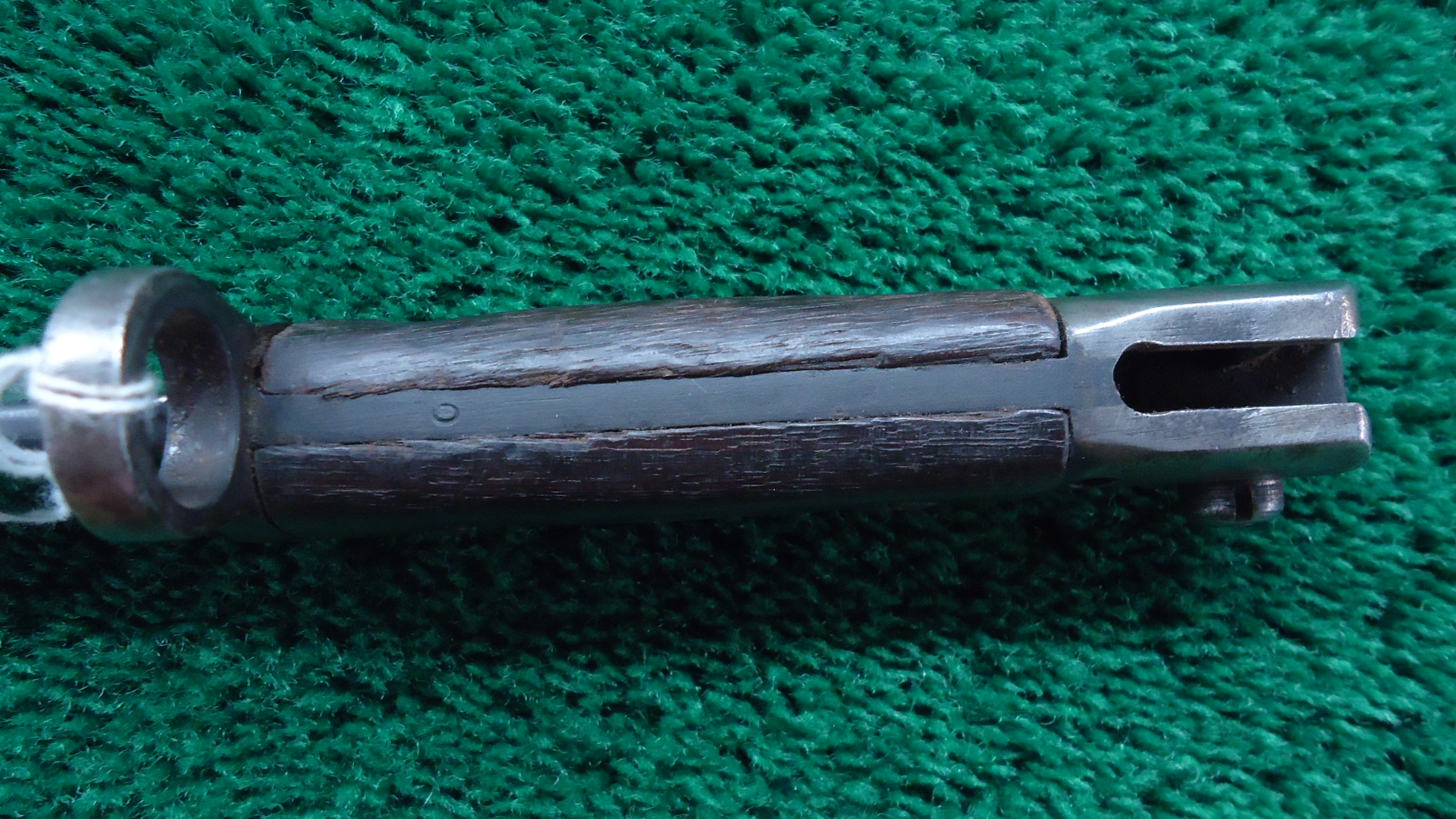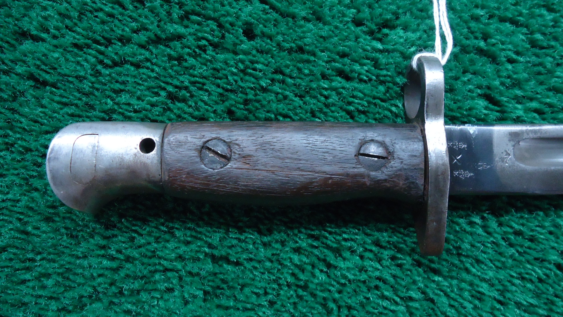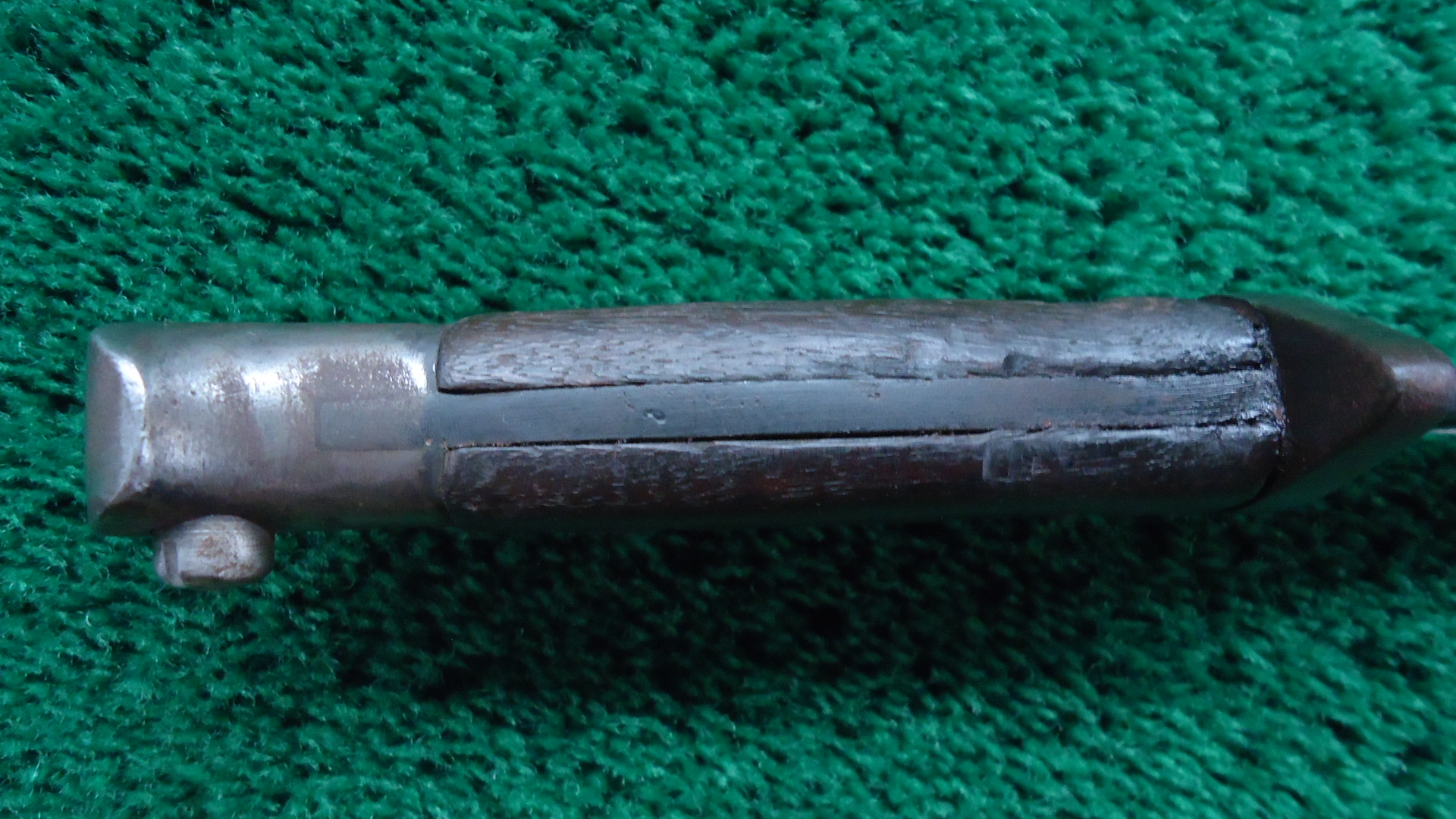 M2045 WW1 BRITISH P14 ENFIELD BAYONET; Blade is 17 inches with overall length of 21-1/2 inches. No scabbard. Left side of the blade is marked with the English Crown and “1907 5 ’18 Sanderson” Right side has proof marks and army units. Metal is grey/brown with some oxidation. Wood handle is in good condition. Lug latch works.