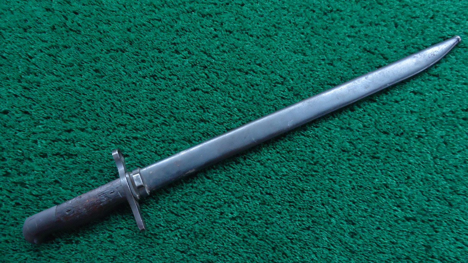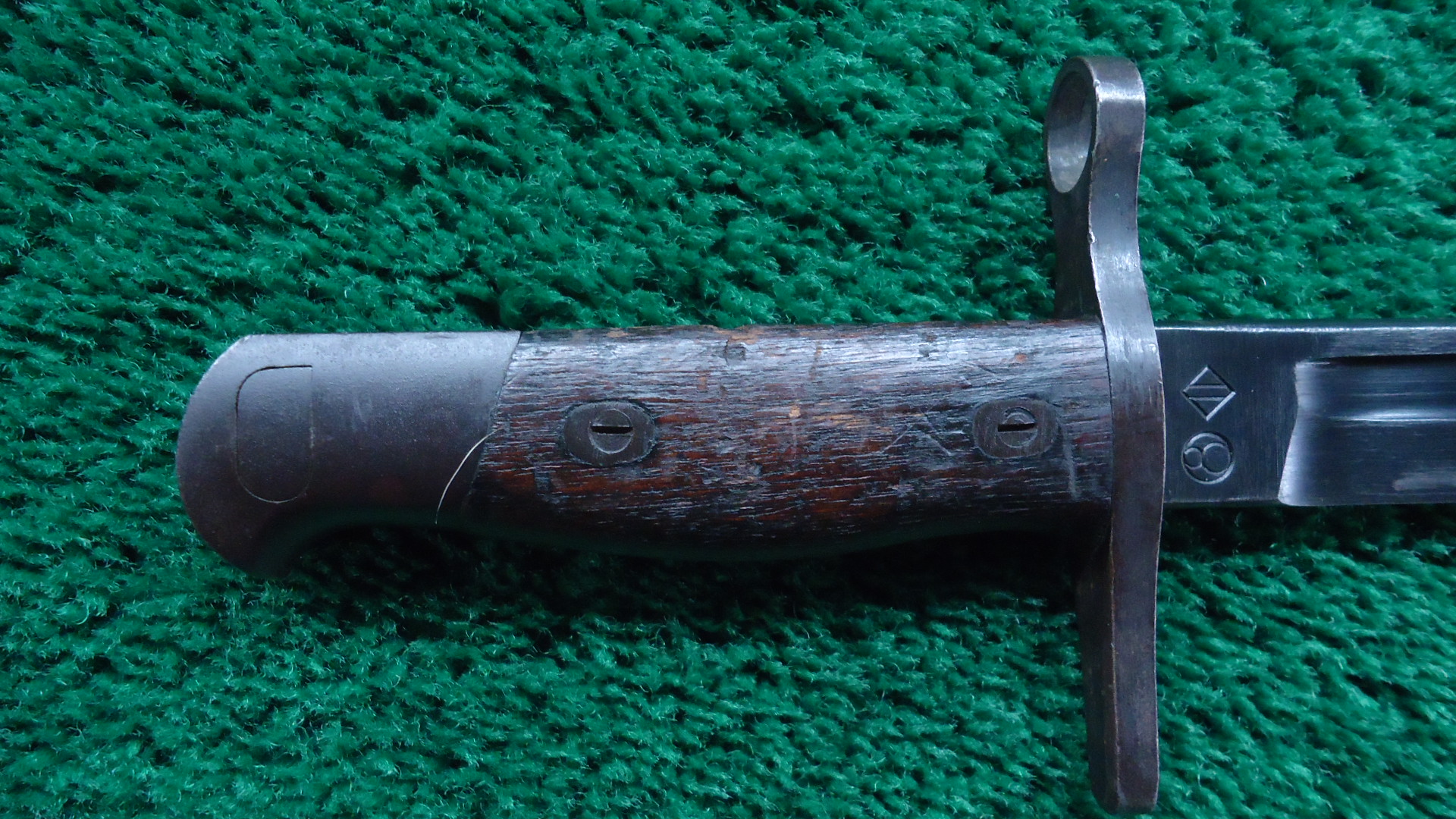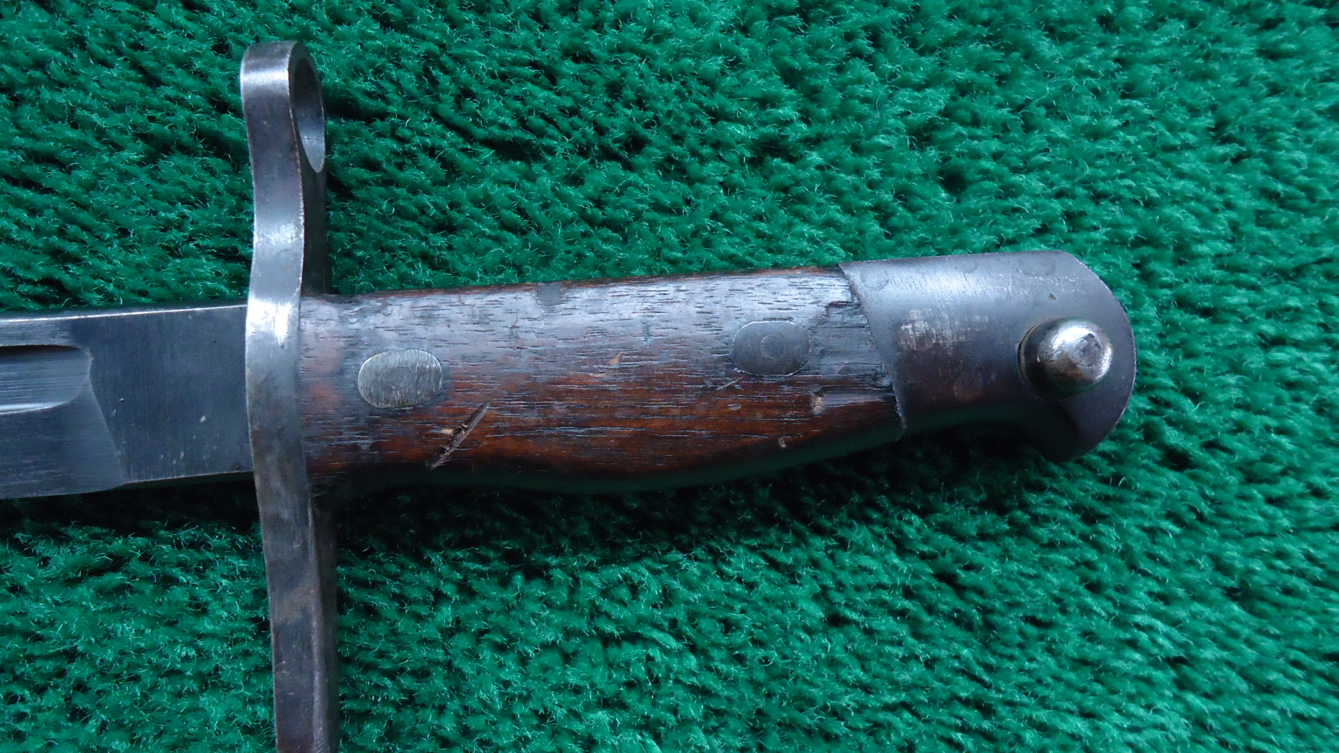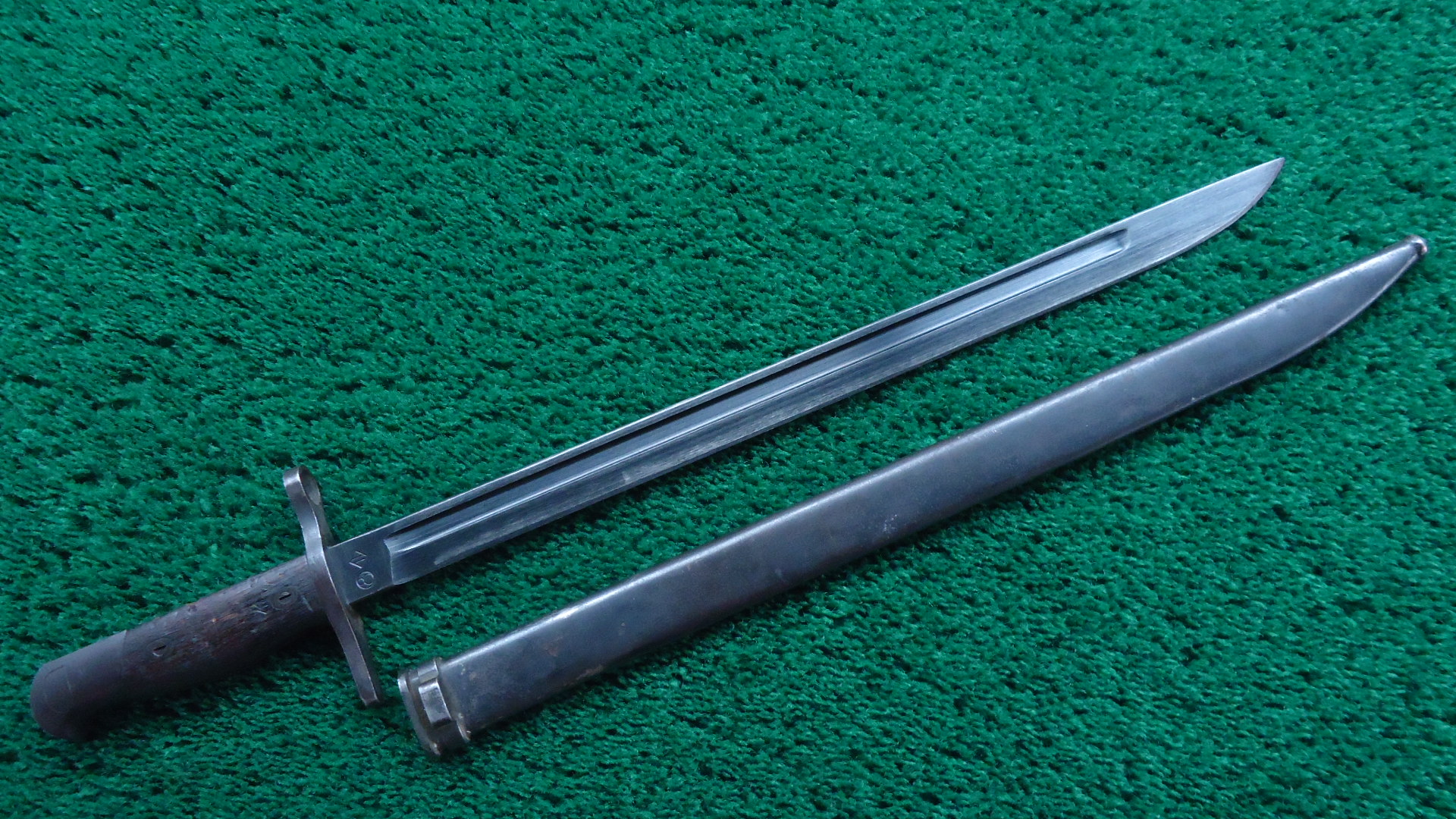 M2047 WW2 JAPANESE ARISAKA BAYONET WITH SCABBARD; Blade is 16 inches with an overall length of 20 inches. This is a type 30 bayonet made 1930-1945. The right side is marked with Riken Kozai KK arsenal stamps.