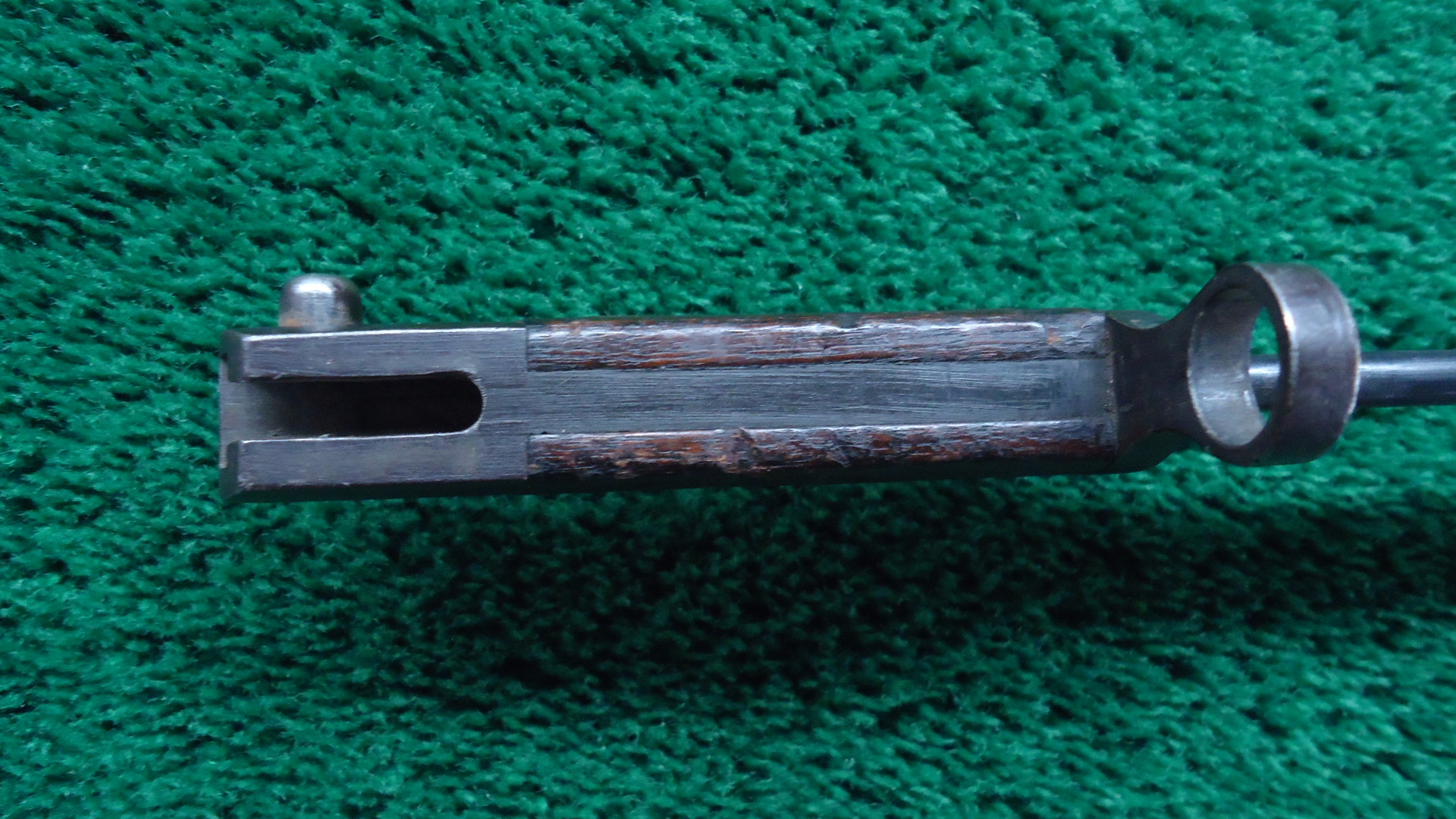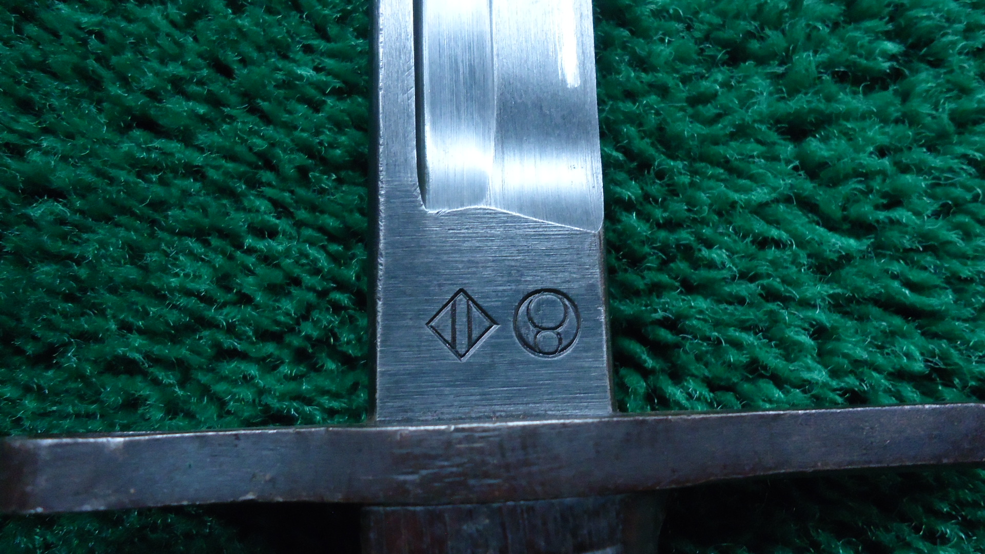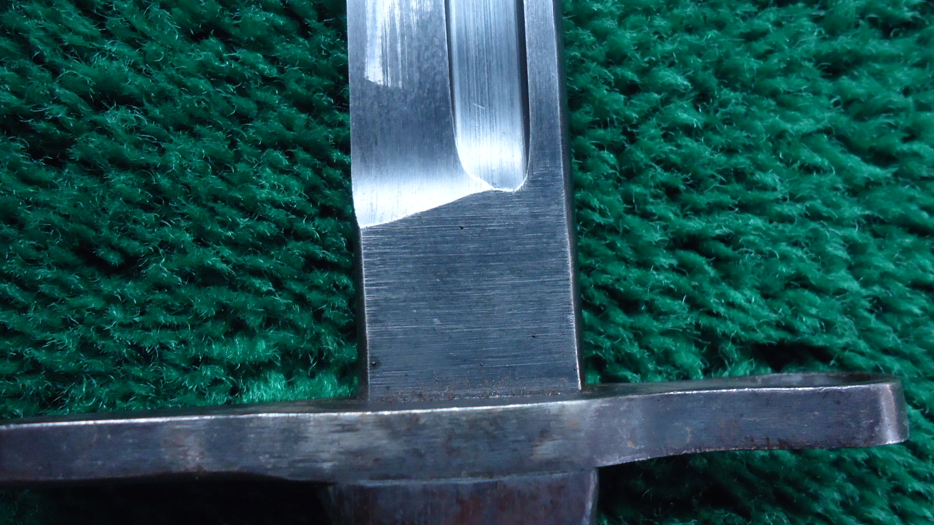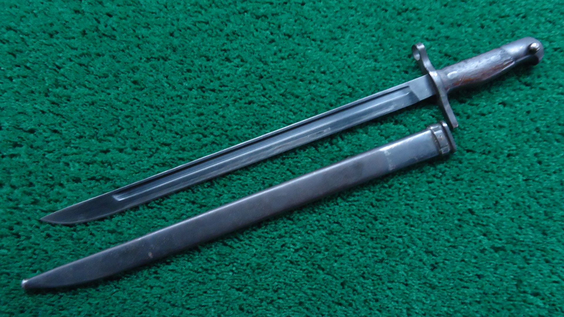 M2047 WW2 JAPANESE ARISAKA BAYONET WITH SCABBARD; Blade is 16 inches with an overall length of 20 inches. This is a type 30 bayonet made 1930-1945. The right side is marked with Riken Kozai KK arsenal stamps.