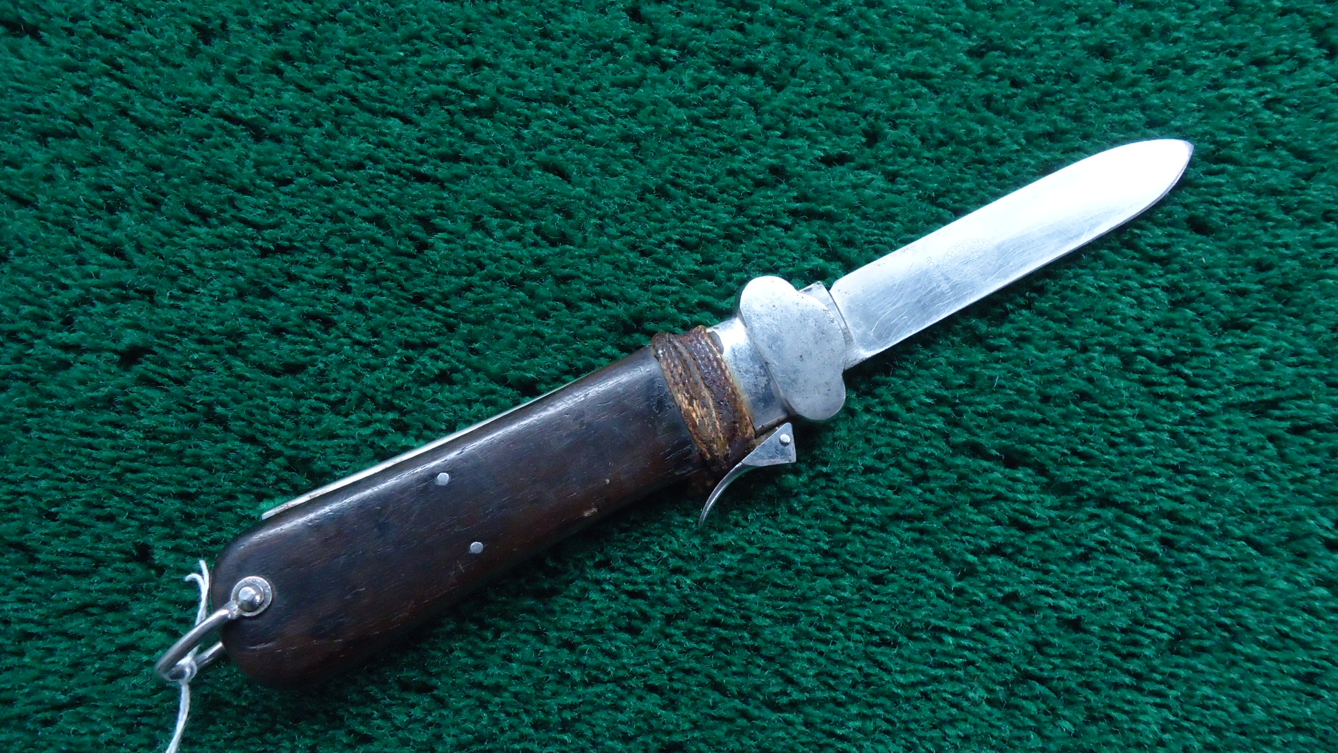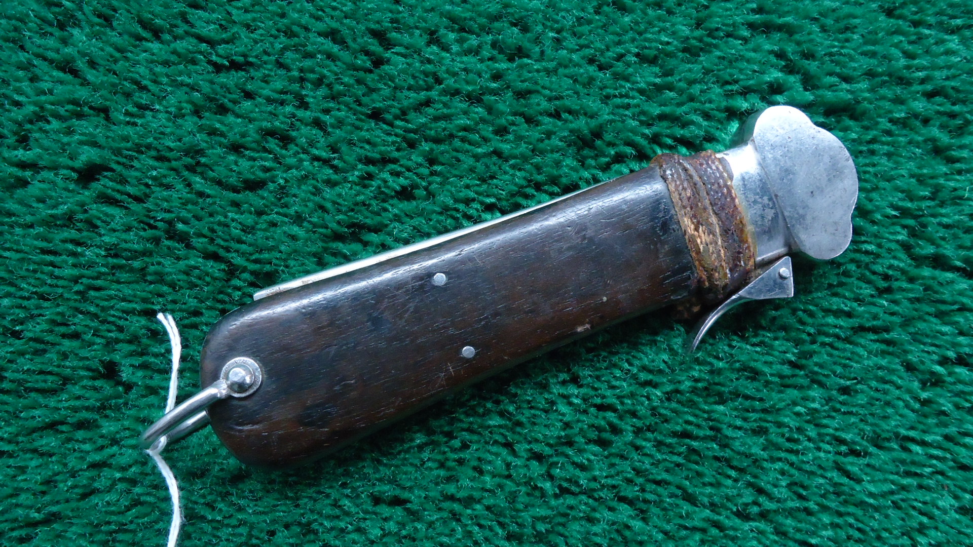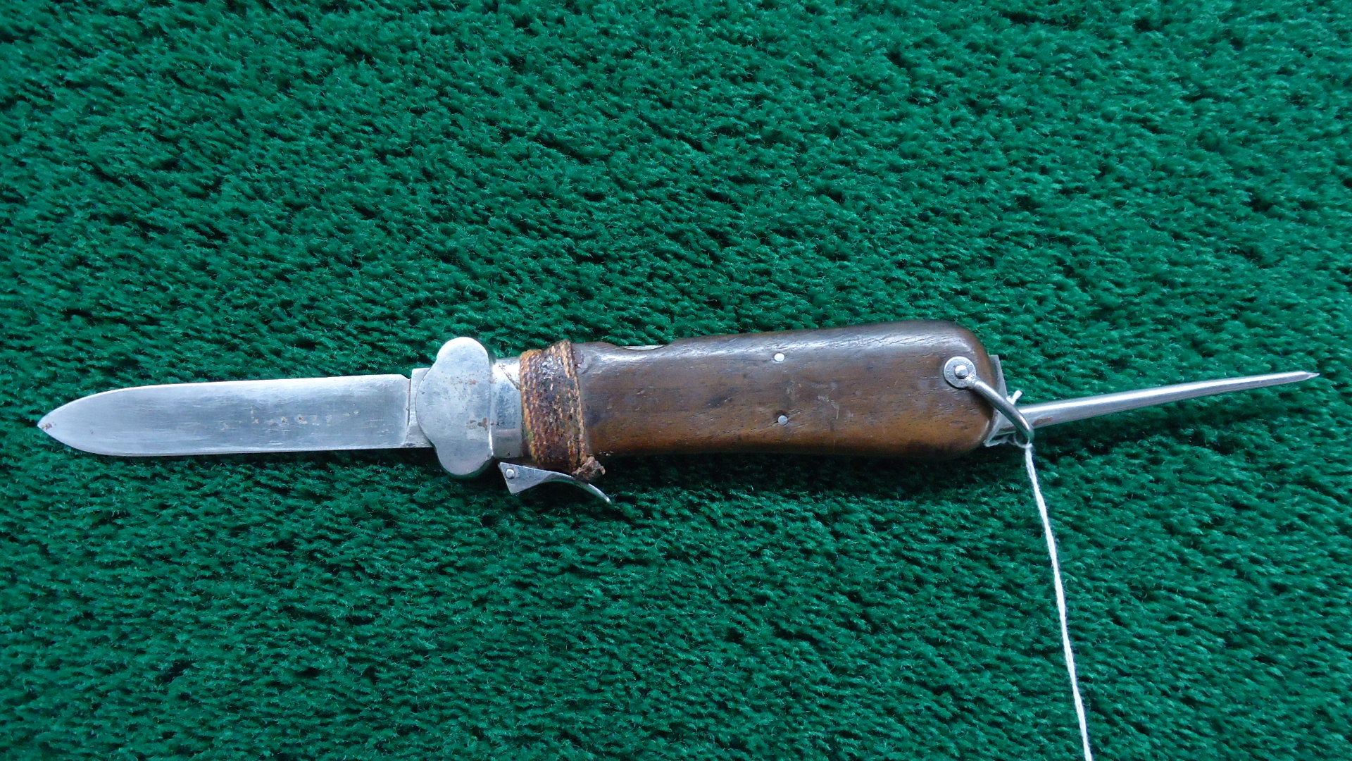 M2055 WW2 1939-1945 GERMAN PARATROOPER GRAVITY KNIFE; Paul Weyersberg & Co. maker’s mark stamp and the Solingen mark. Blade length 4 inches, spike is 3-1/2 inches and an overall length 10 inches. Some cordage is wrapped near the top. This knife is in good condition except the blade will not lock in place.
