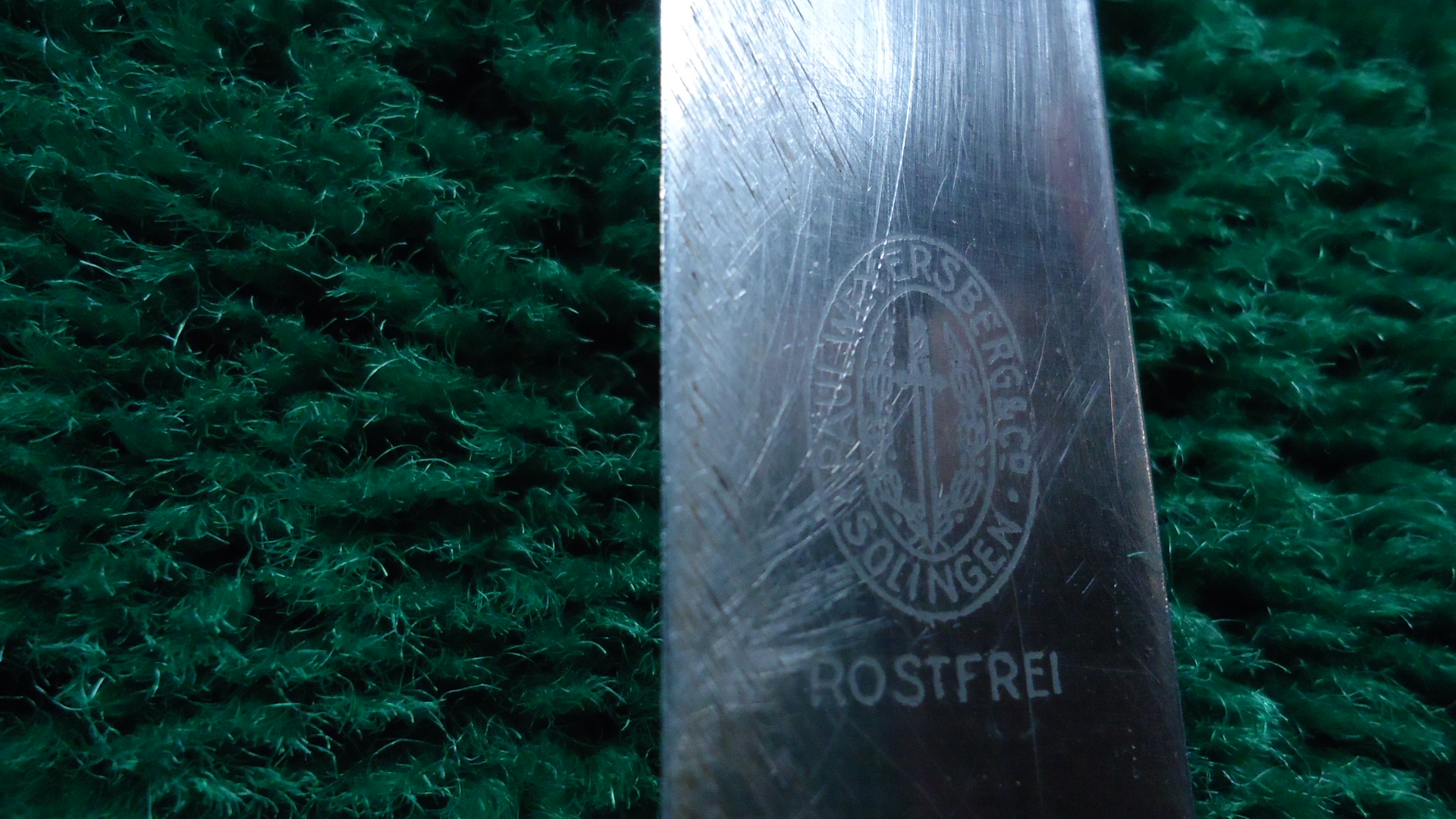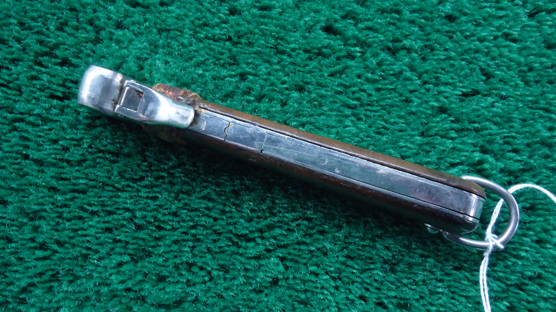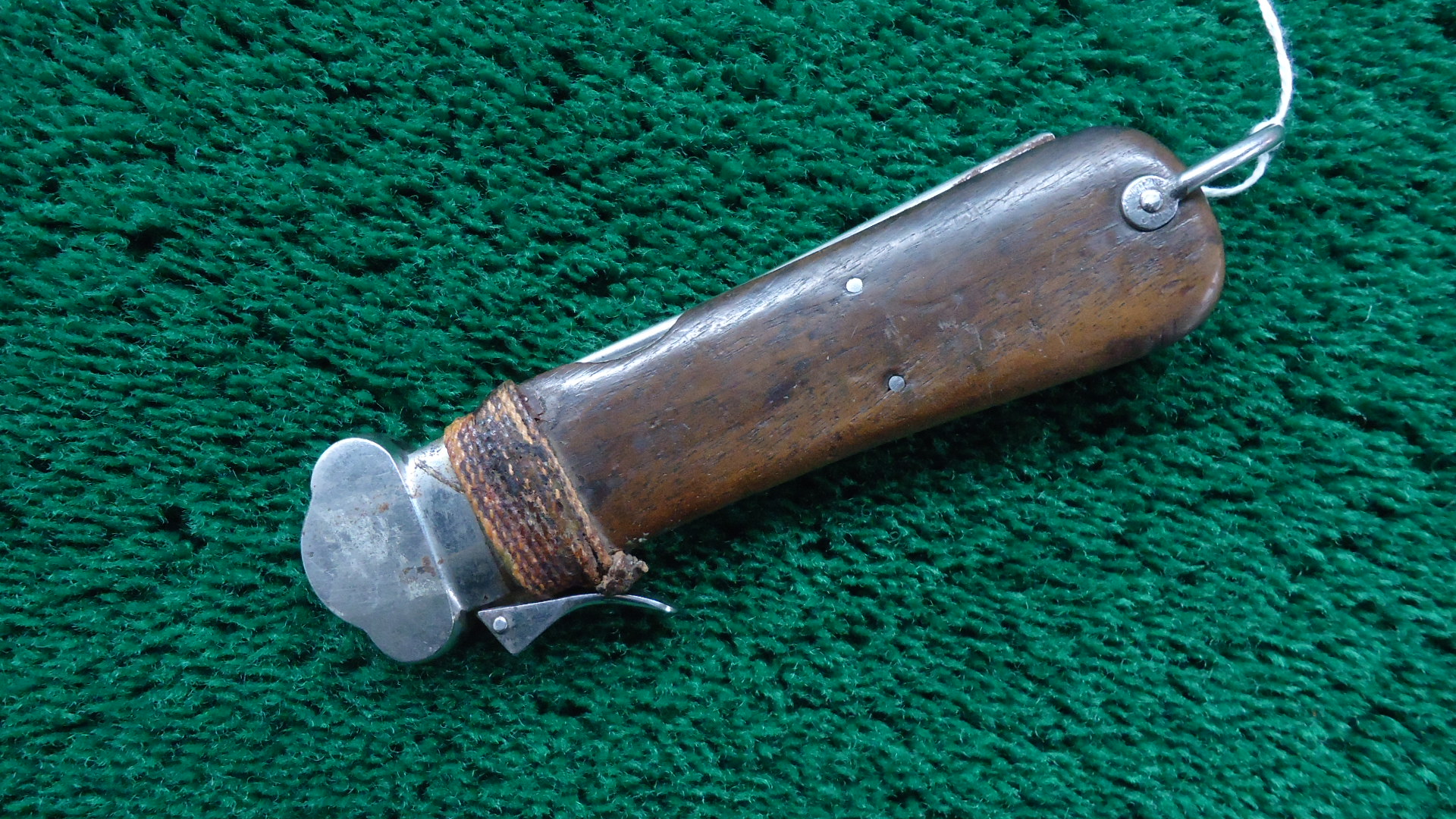 M2055 WW2 1939-1945 GERMAN PARATROOPER GRAVITY KNIFE; Paul Weyersberg & Co. maker’s mark stamp and the Solingen mark. Blade length 4 inches, spike is 3-1/2 inches and an overall length 10 inches. Some cordage is wrapped near the top. This knife is in good condition except the blade will not lock in place.