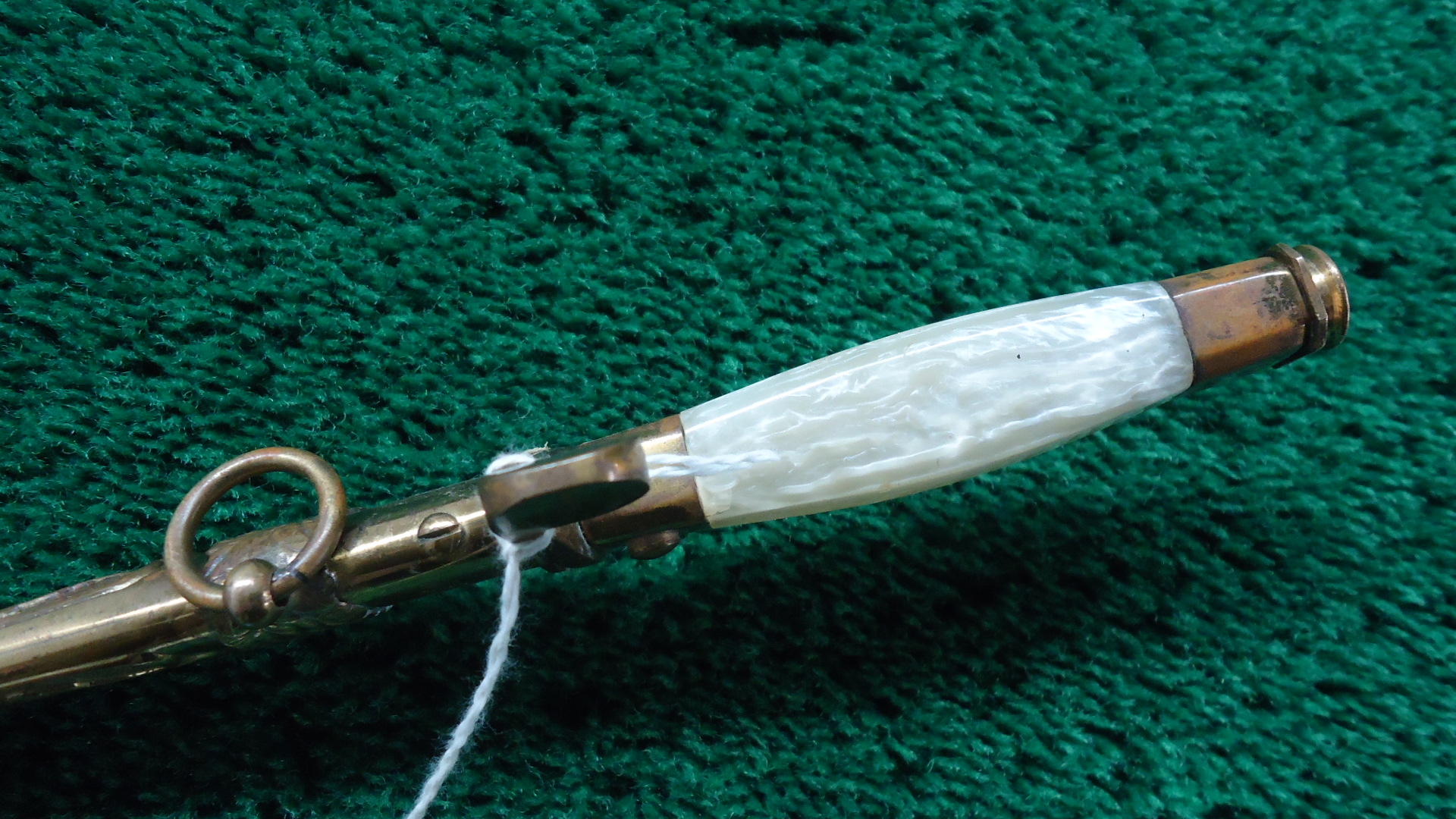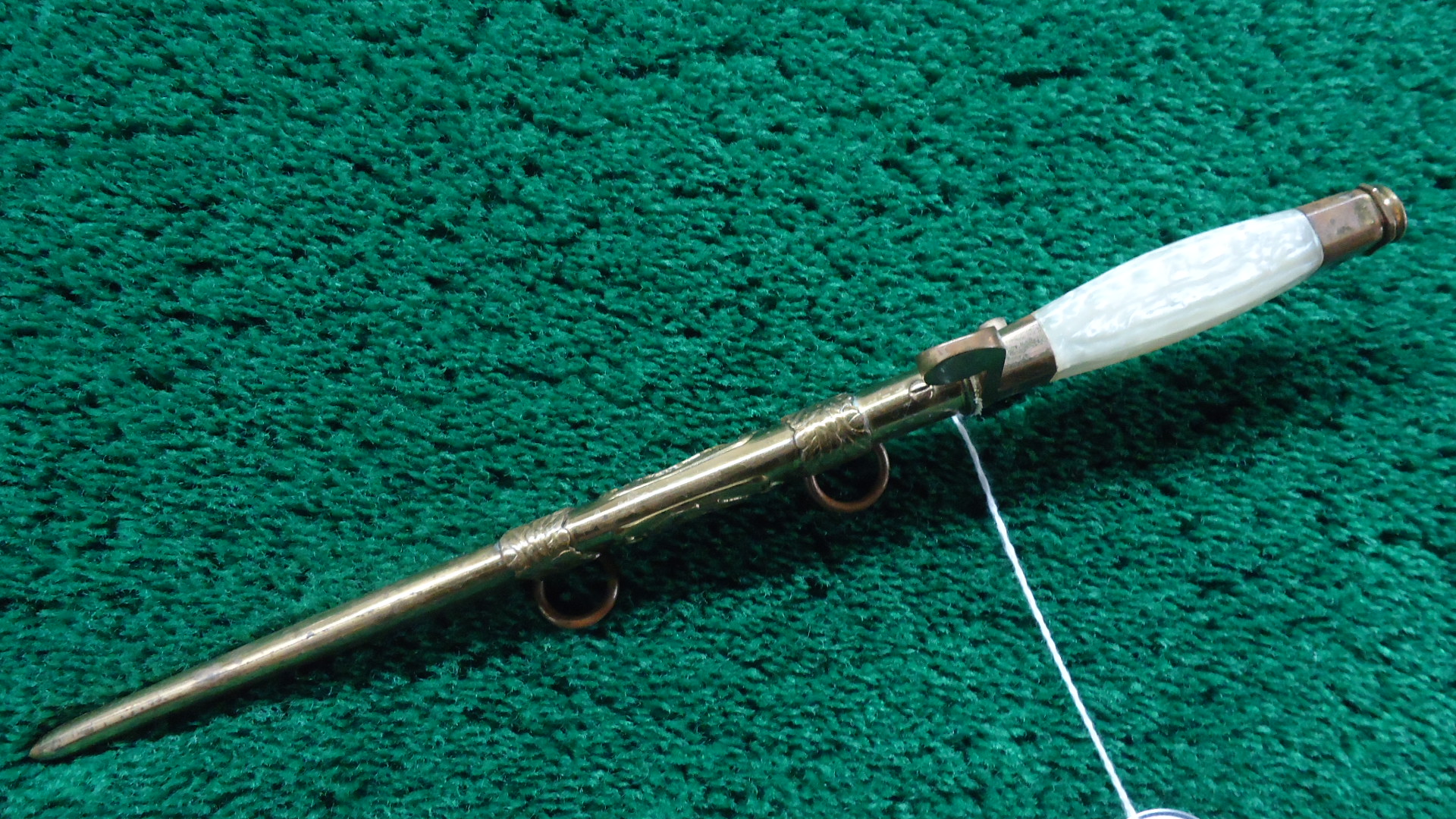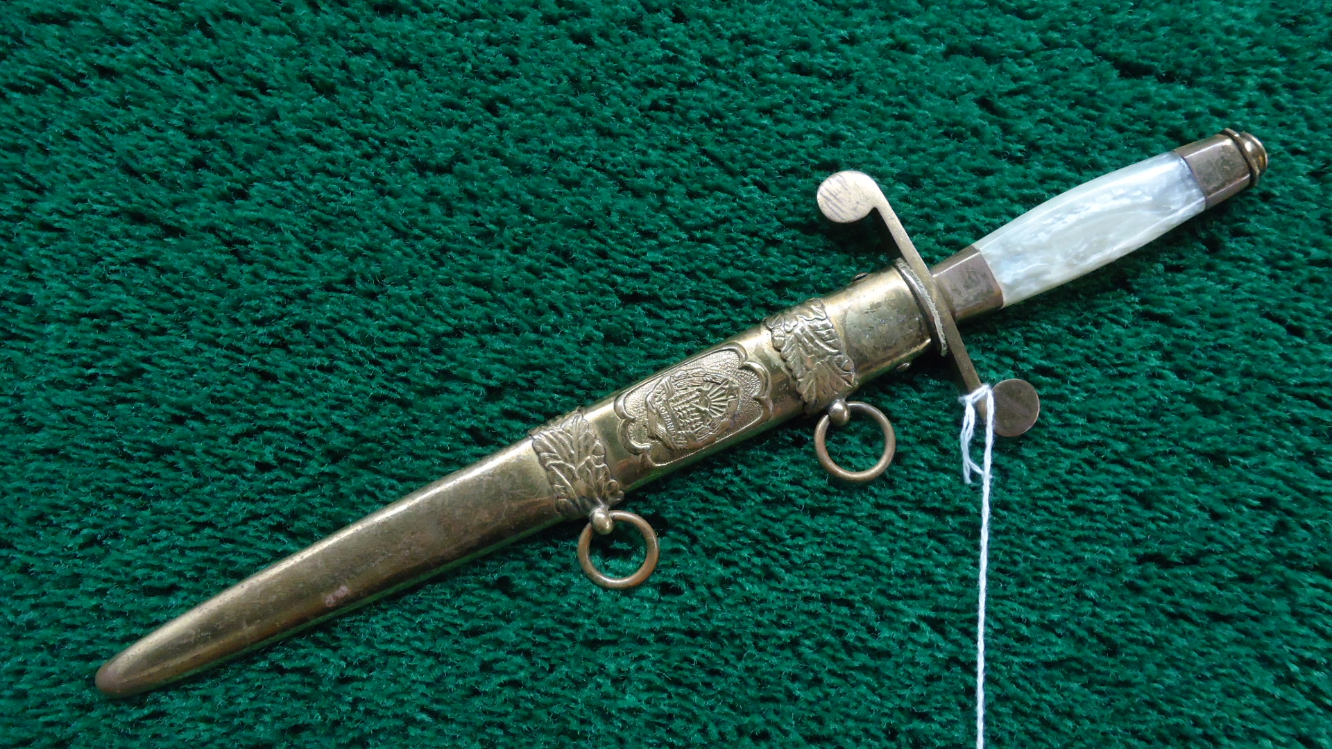 M5-178 RARE PRE-WW2 1920S-1930S ROMANIAN ARMY OFFICER’S DAGGER; Blade length is 9 inches and overall length of knife and scabbard is 12-1/2 inches. Quite a decorative piece with a pearlite grip and gold color wash overall. Dagger has a button release to remove it from the scabbard. Serial number is clear on the blade. Nice Officer’s Dagger to add to your collection or display.