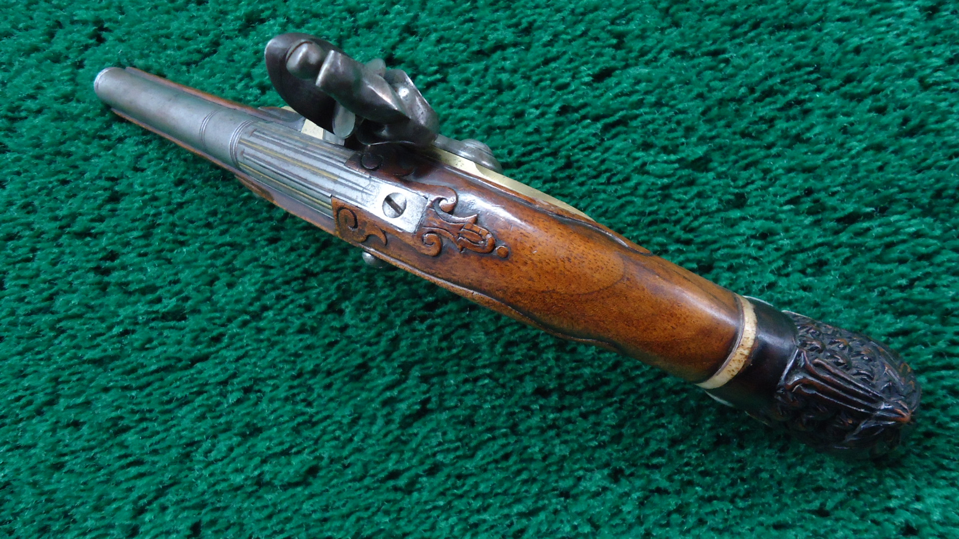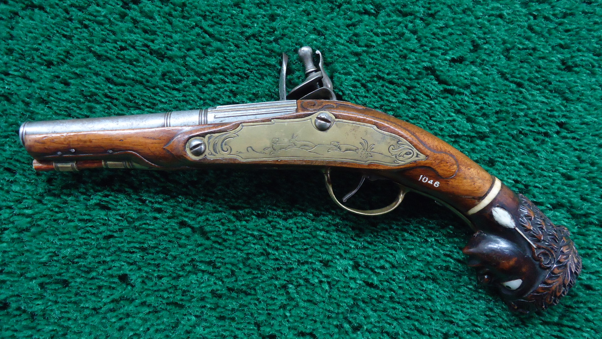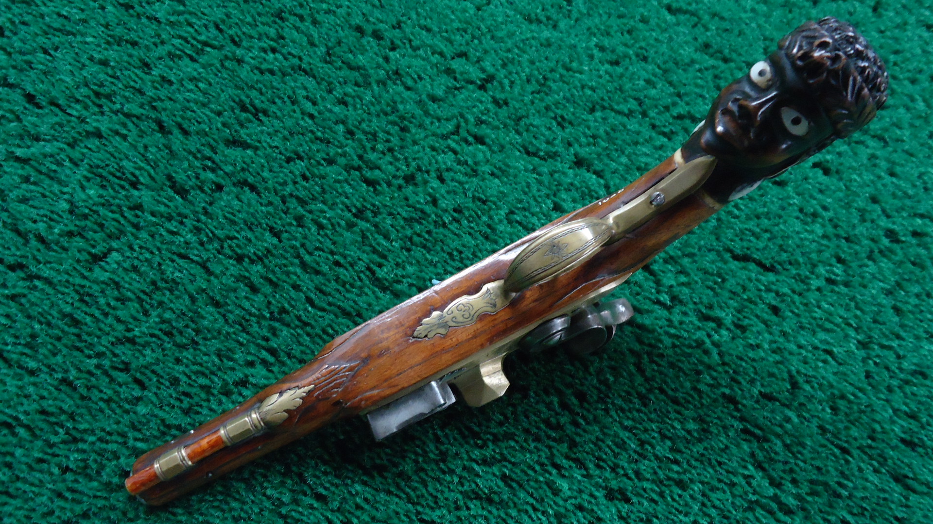 MHG1090 ENGRAVED EUROPEAN FLINTLOCK POCKET PISTOL WITH FIGURAL “MOOR’S HEAD” CARVED POMMEL; The 4-1/2 inch iron barrel is somewhat ornate having brass inlays alternating between ribs and a series of rings out to the muzzle. Features engraved brass lockplate and other furnishings. The stock features a carved Moor’s head pommel. See pages 478-479 of “The Visser Collection, Vol. 1, Part 4” by G. de Vries and B.J. Martens where it is listed as from c. 1750. Inventory number “1046” in white on the left of the wrist. Condition is Fine overall as partially restored with mostly silver gray patina on the iron, attractive aged patina on the brass, general mild wear, traces of repaired cracks along the stock, and distinct carving. Mechanically fine.