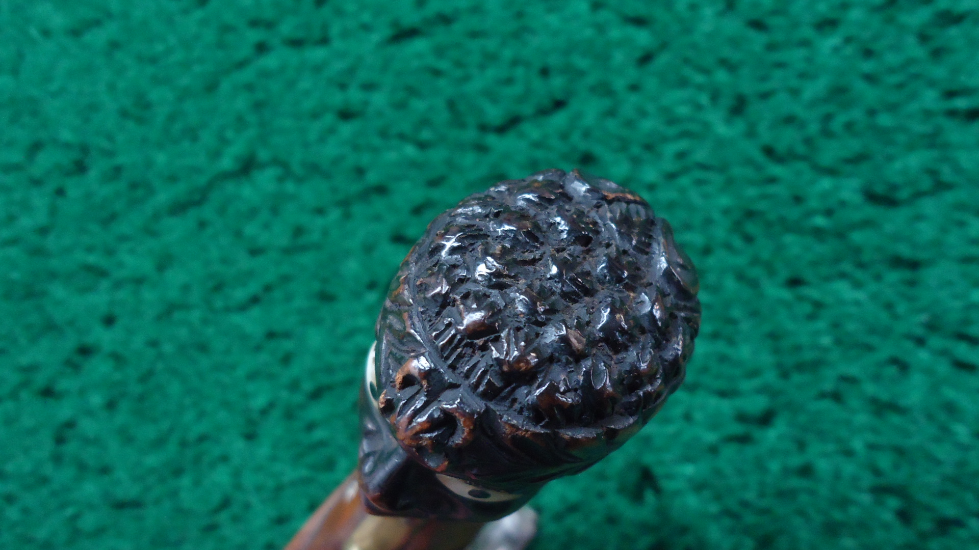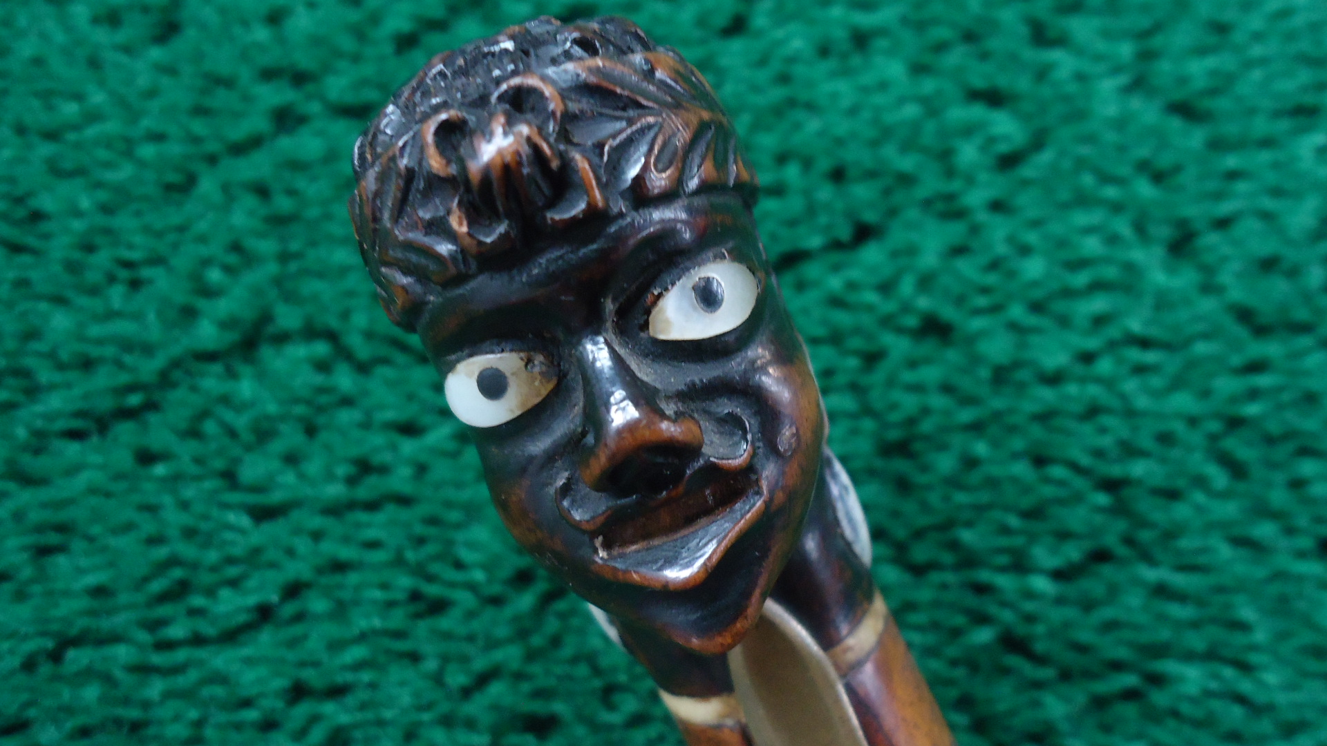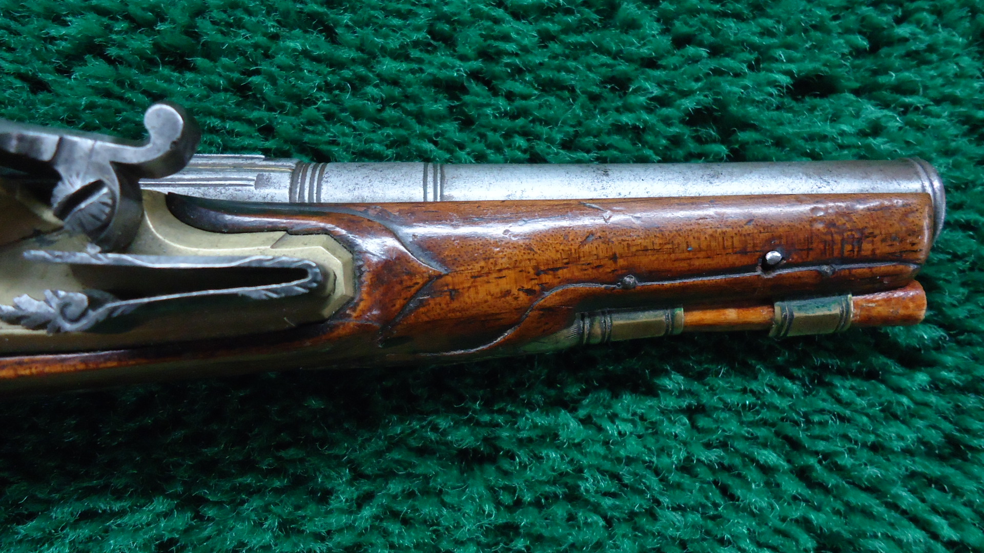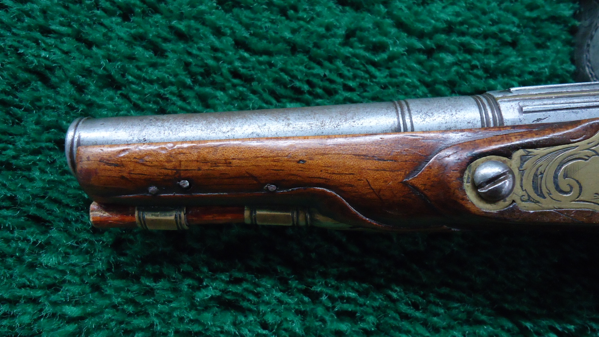 MHG1090 ENGRAVED EUROPEAN FLINTLOCK POCKET PISTOL WITH FIGURAL “MOOR’S HEAD” CARVED POMMEL; The 4-1/2 inch iron barrel is somewhat ornate having brass inlays alternating between ribs and a series of rings out to the muzzle. Features engraved brass lockplate and other furnishings. The stock features a carved Moor’s head pommel. See pages 478-479 of “The Visser Collection, Vol. 1, Part 4” by G. de Vries and B.J. Martens where it is listed as from c. 1750. Inventory number “1046” in white on the left of the wrist. Condition is Fine overall as partially restored with mostly silver gray patina on the iron, attractive aged patina on the brass, general mild wear, traces of repaired cracks along the stock, and distinct carving. Mechanically fine.