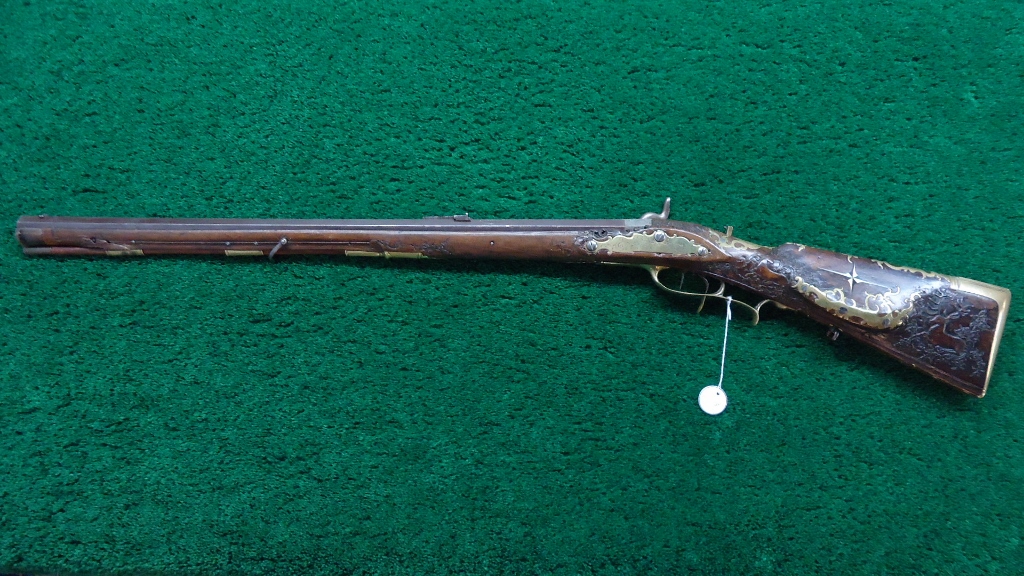 MR1105 EUROPEAN JAEGAR RIFLE; Approximately 60 caliber and has the deep octagonal rifling. Barrel is 28 inches. There is fancy and then there is FANCY! This one is FANCY! All furniture is brass and a lot of it. All in very nice condition. In the pistol grip area is a crest of some sort. Also has a sliding patch box with a large cavity. You could haul a lot of stuff in there. Overall gun condition is very good. Barres are brown and were likely brown to start with. Browning was a common way of doing barrels back in the day. The breech plug area and sidelock still retain some case color. Hammer cocks very good. The set trigger and trigger both work very well. The wood is also a piece of art with deep relief engraving of animals and the basic floral design. This theme runs throughout. There is some damage at the muzzle area and a chip missing on the right side. This was a special gun built for someone special!