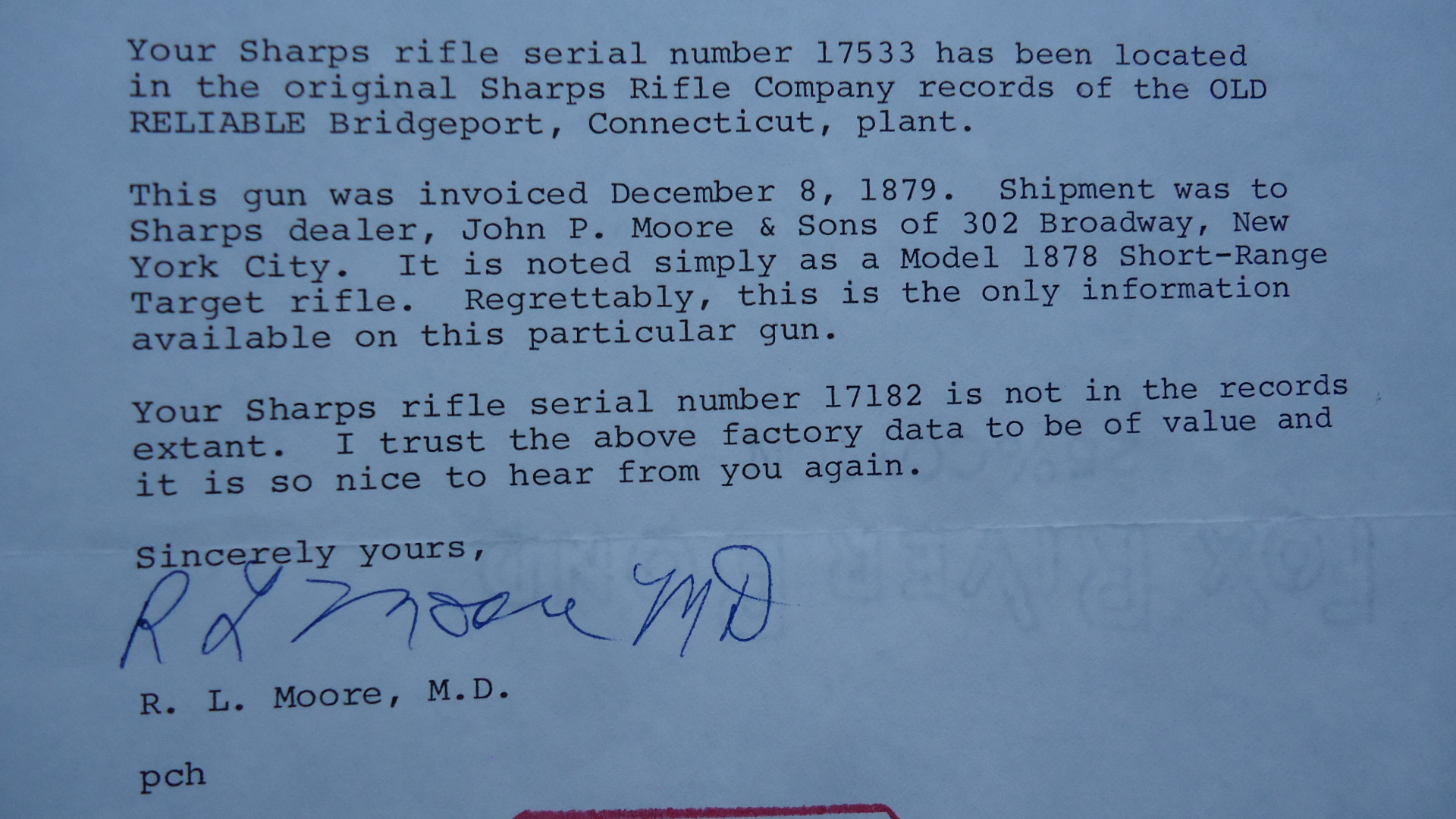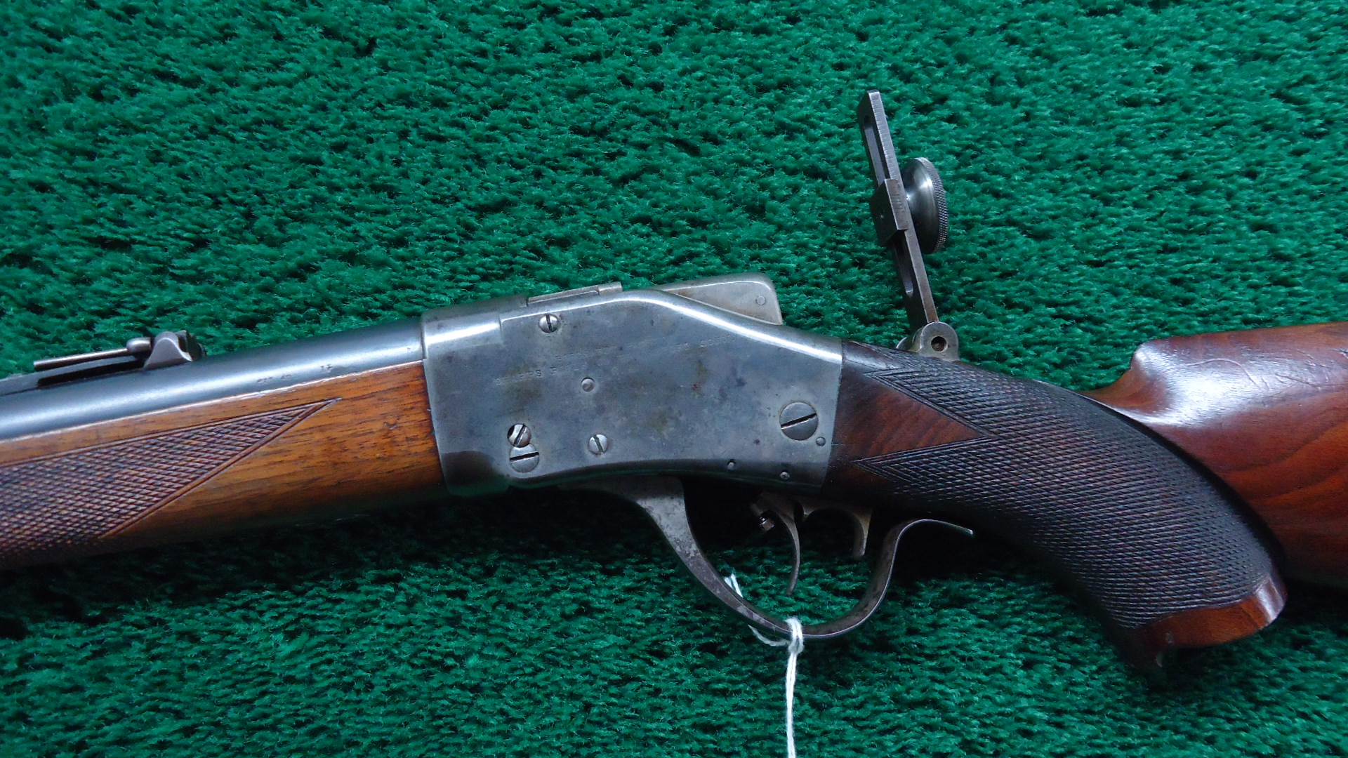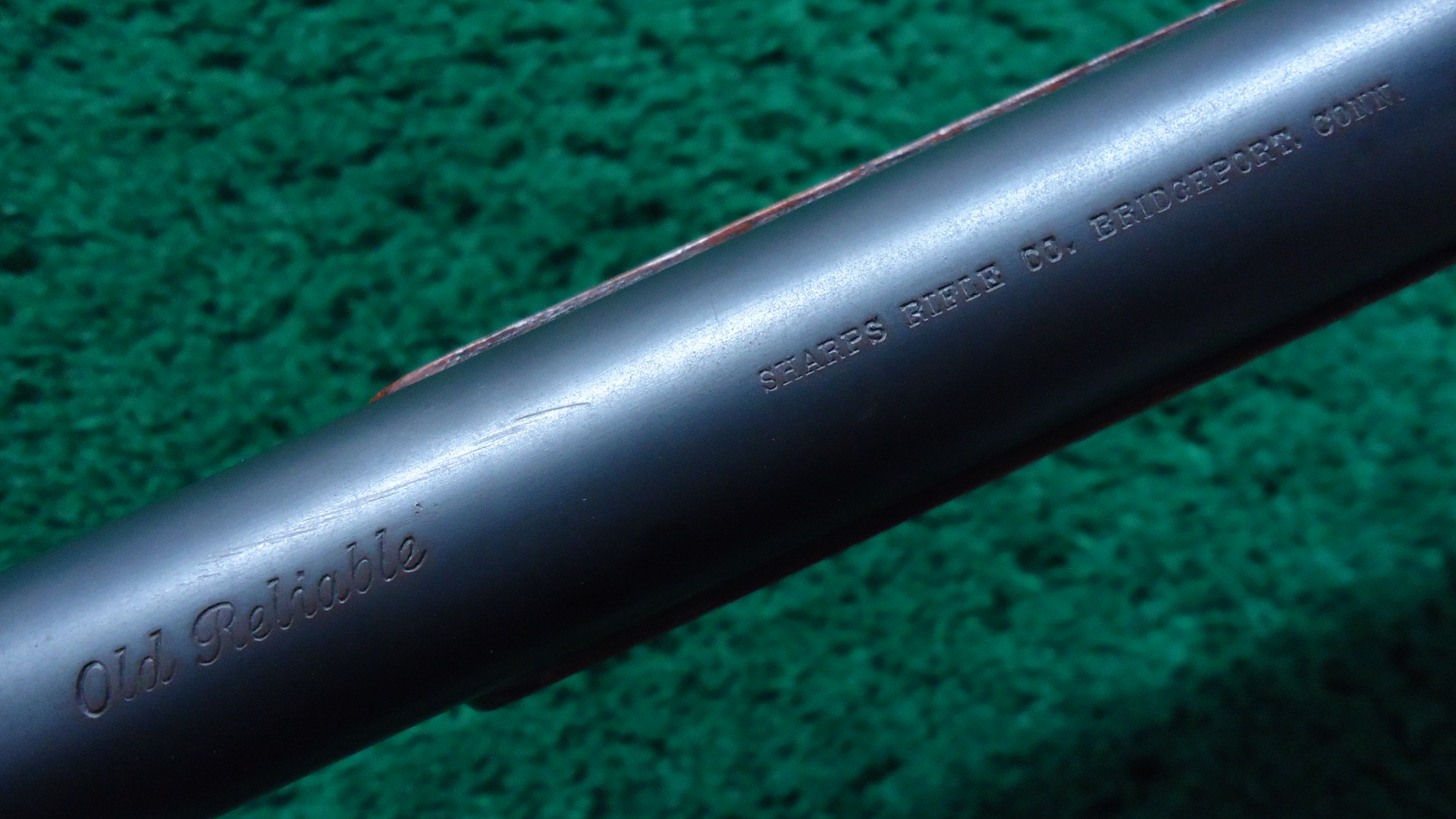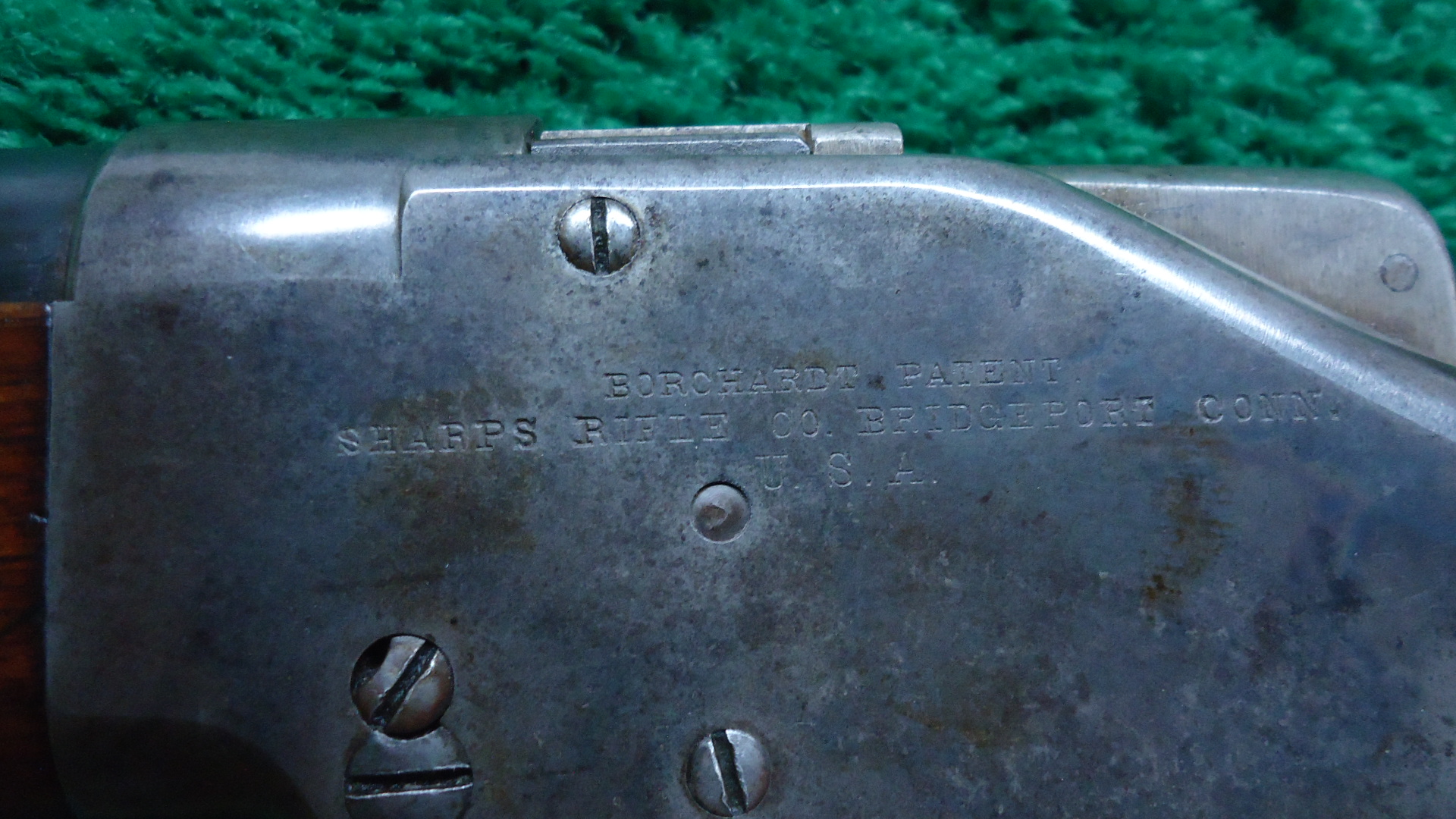 MR1726 RARE SHARPS BORSCHARDT MODEL 1878 SHORT RANGE RIFLE; 26 inch round barrel is marked “Old Reliable” followed by “SHARPS RIFLE CO. BRIDGEPORT, CONN.” ahead of the rear sight and “CAL. 40 1-7/8” on the left side ahead of the action. Original wind gauge globe front sight, Lawrence patent rear barrel sight and a short range graduated peep sight integrally set in the tang. The left side of the color case hardened action is marked with the standard three-line Sharps address and Borchardt patent. Built with a set trigger, now seems to have something missing but still functions as a plain trigger. Checkered Schnabel tip forearm with matching pistol grip butt stock fitted with a checkered hard rubber buttplate with the Sharps Rifle Co. “SRCo” monogram at the center. Near excellent condition overall with the barrel showing 60% original blue starting to tone slightly brown. Bore is bright and shiny with strong rifling. Faint traces of the original case colors remain on the action with the balance a mottled brown grey patina. The wood is fine showing light wear with scattered handling marks. Comes with Factory letter showing it was manufactured in 1879. Frank Sellers book “Sharps Firearms” page 275 shows only 153 Model 1878 Short Range Rifles are estimated to have been manufactured.
