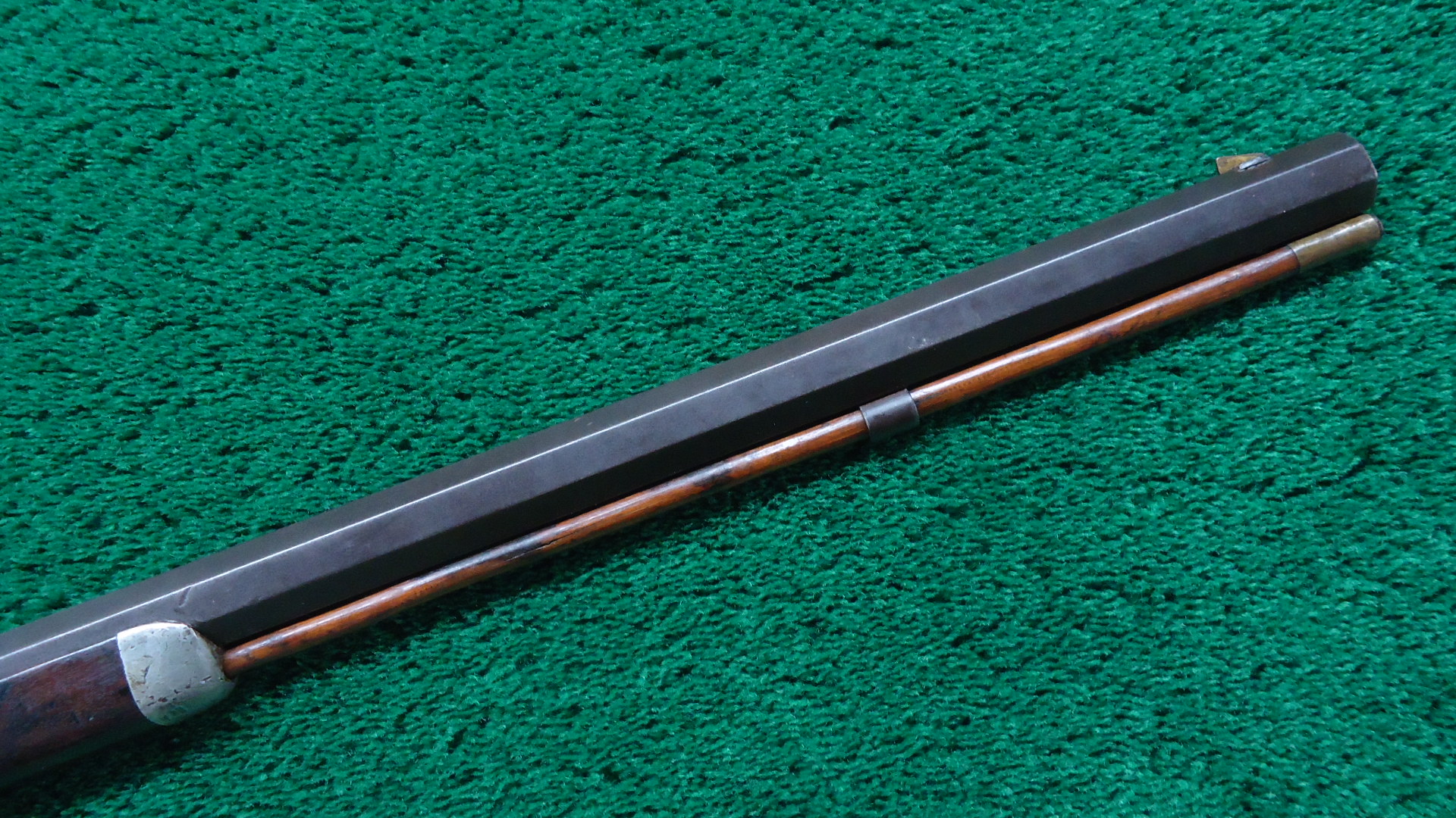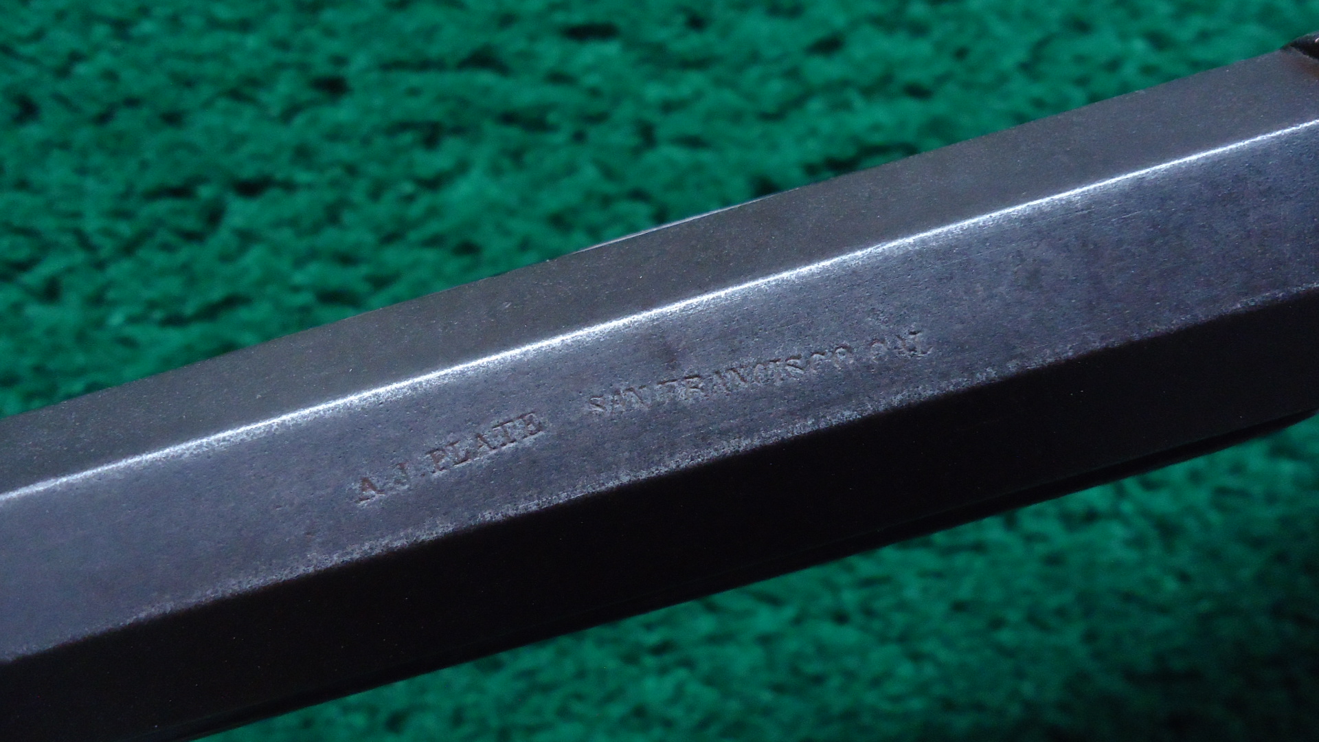 MR1732 SAN FRANCISCO MARKED SPENCER MODEL 1865 BURNSIDE HEAVY BARREL RIFLE CONVERSION; 30-1/2 inch heavy octagon barrel chambered in 52 caliber. Bore has shine and good rifling with a few scattered light pits. Sights include a brass blade front and notch rear. Barrel is a plum/brown patina and is marked “A.J. PLATE SAN FRANCISCO CAL”. Also fitted with a wooden cleaning rod. Receiver is a gray/brown patina with light pitting scattered throughout. Double set triggers function properly. Saddle ring bar on the left side has been removed during the conversion. Straight grip stock is in good condition with a sling swivel inlet that has been filled and has some minor cracks and dings. A.J. PLATE was a famous San Francisco, California firearms dealer that converted a number of Civil War carbines to hunting rifles for the Western market. This is one of those Spencer carbines that has been converted for use on the harsh frontier for a settler that couldn’t afford a Henry or Winchester lever action rifle. A heavy gun at just under 14 pounds.