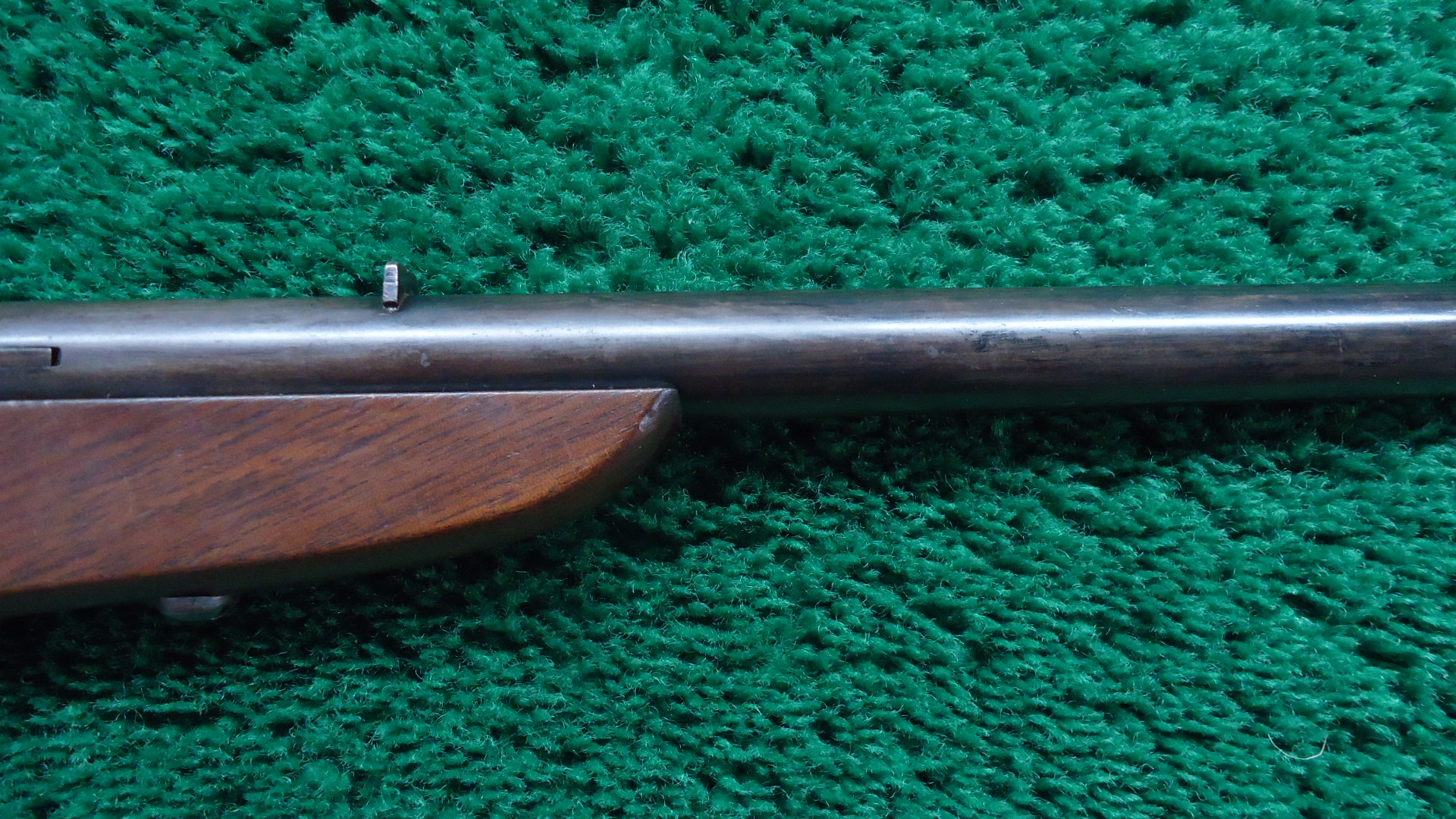 MR1750 ATLAS GUN COMPANY FIRST MODEL SINGLE SHOT 22 RIFLE;18 inch barrel with a good bore showing light oxidation and thin rifling. The metal surfaces are an overall gray-brown with scattered specks, light handling marks, and high edge wear. The smooth hardwood stock is very good with just light handling marks and some finish loss likely due to some sort of cleaner. The original sights are intact. The rifle needs some adjustment as there is no safe when cocked. The first model was only made for about one year. An overall nice example of an early gun manufactured by Atlas before Meriden Arms took over production.