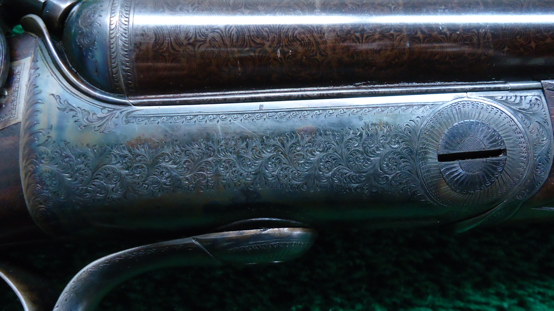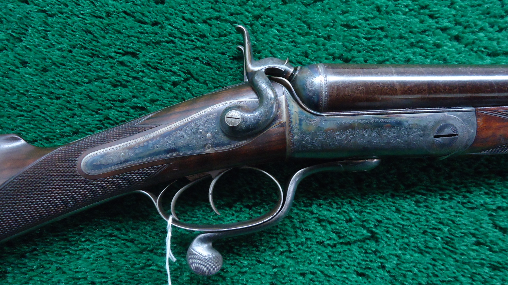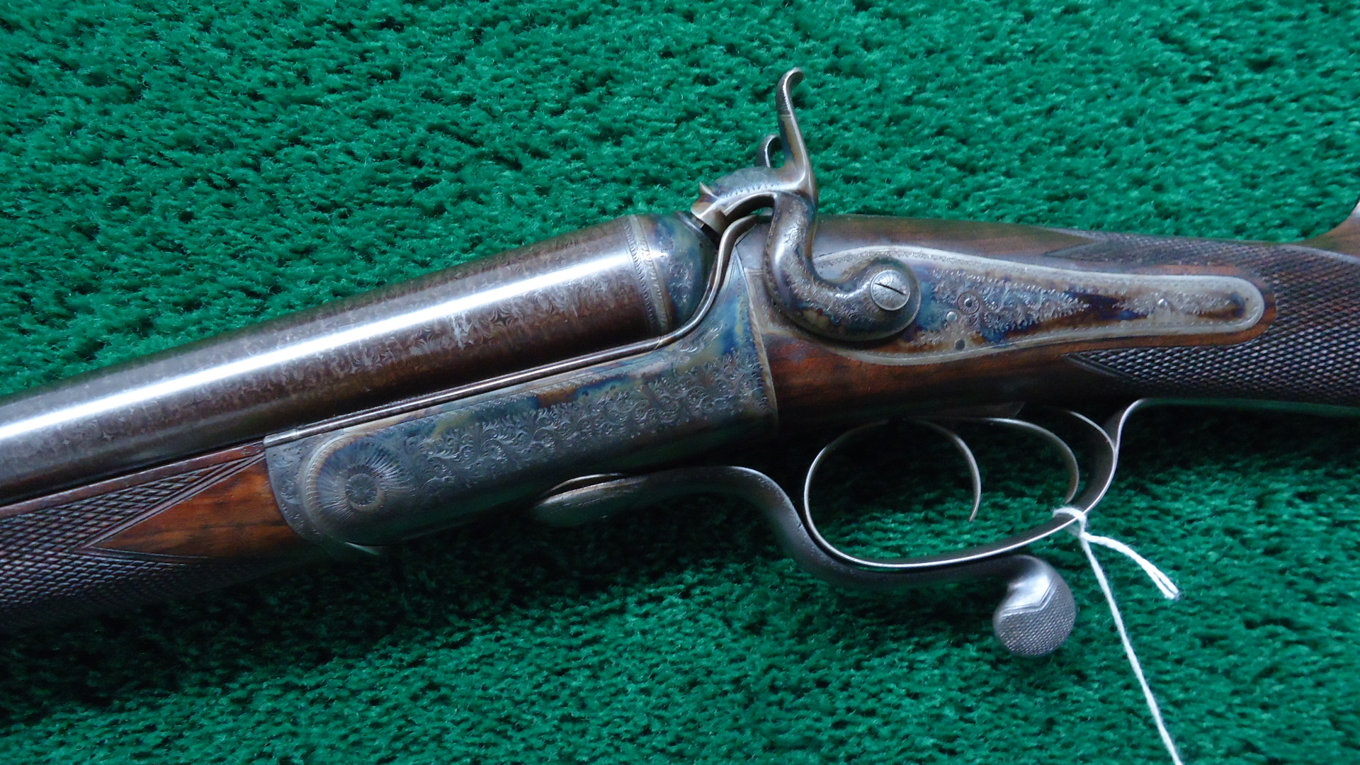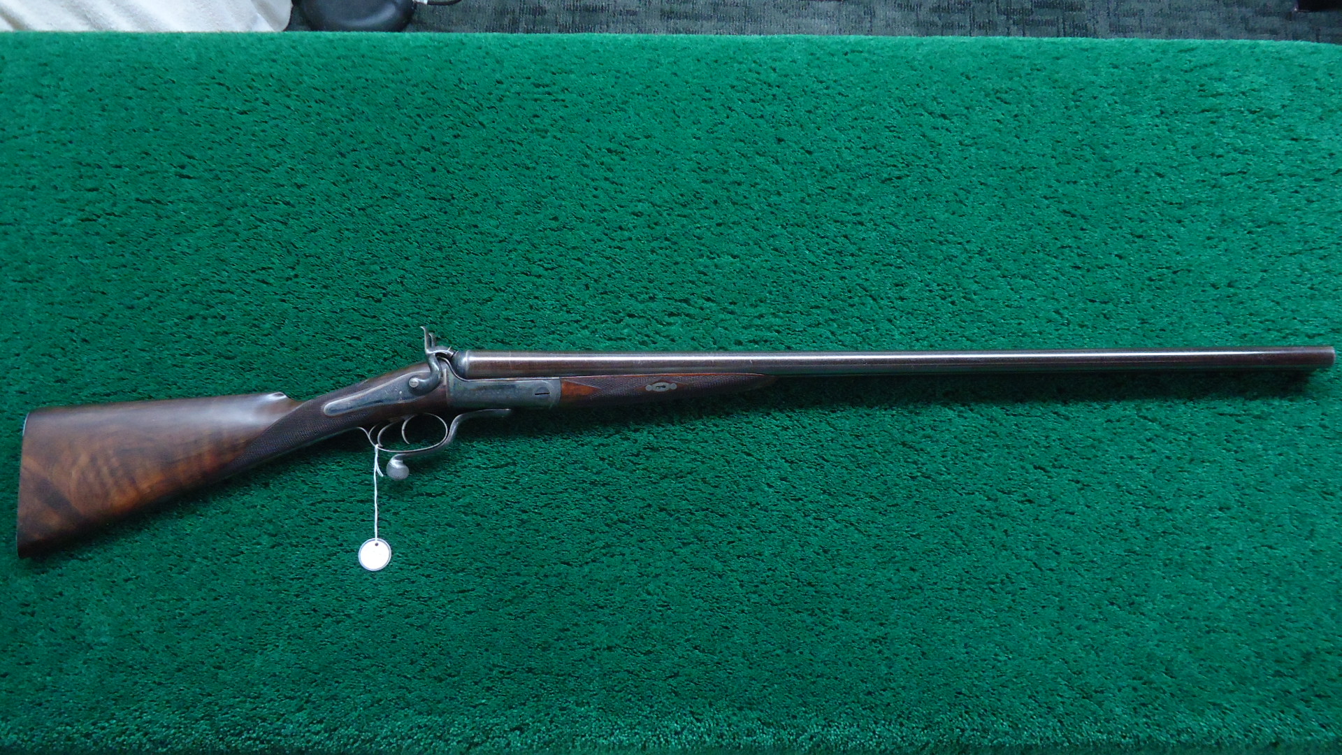 MSG1262 MASSIVE SUPERB CONDITION CASED 8 BORE UNDERLEVER DOUBLE HAMMERGUN BY STEPHEN GRANT; 34 inch Damascus barrels marked “STEPHEN GRANT 67A ST. JAMES’S STREET LONDON” on the top of the rib and the flats showing proper London black powder proofs and bore mark “8”. The bores are excellent with bright and shiny surfaces. The action and back action locks show fine English scroll engraving in about 80% coverage overall. Each of the locks is also engraved “S. GRANT” and the watertable shows the London View proof along with E.C. Hodges crown and triangle mark. The shotgun features the strong Jones underlever action with non-rebounding hammers and key-fastened forend. The barrels retain 95% strong original brown finish with vivid Damascus pattern visible their entire length. The majority of the loss is on the top of the right barrel at breech where there is a 1/4″ x 1″ area that is silver in color where finish has worn away. A competent gunsmith could certainly tone this area down and blend it with the original finish if one wished. The action and locks show 97% original color case hardened finish which remains rich and vivid. The triggerguard shows thinning and is an overall medium gray brown patina. The straight grip stock and splinter forend are of handsomely figured English walnut and features an engraved toe and heel buttplate. The stocks rate excellent with 98% original finish remaining, nice, raised grain feel and perfect fit. The checkering remains sharp and crisp, the fancy engraved wedge escutcheons are fit within uncheckered diamonds on either side of forend. The toe line of the stock shows a nicely tarnished silver monogram plate which is engraved “GWW”, the initials stenciled upon the lid of the original case also marked with the same initials. The case is in overall about good condition. The latch needs word and the exterior surface being dry and with the carrying handle missing along with the straps. An old express label marked “BALTIMORE MD” is present on the lid. It has a pair of replacement firing pins and an assorted lot of cleaning tools. This is a very handsome and extremely fine big bore British double gun.