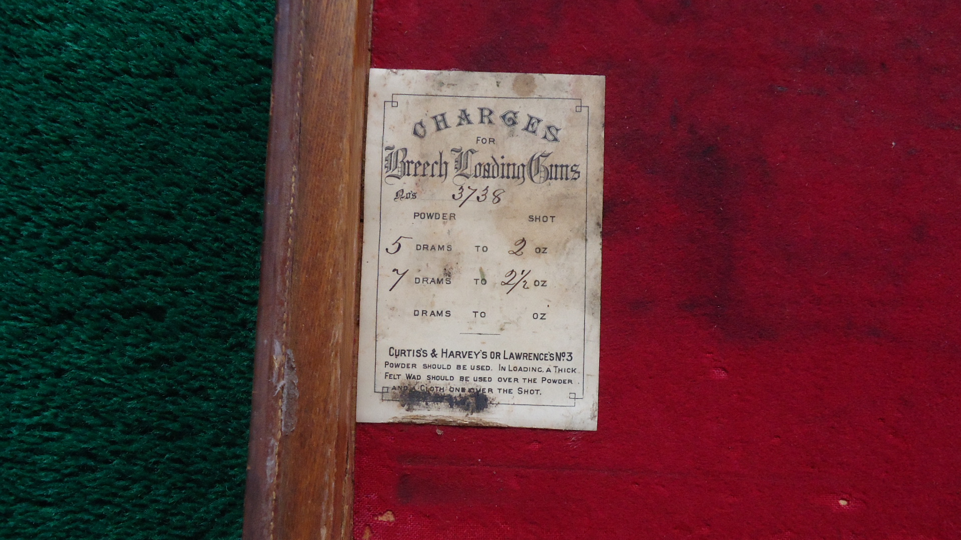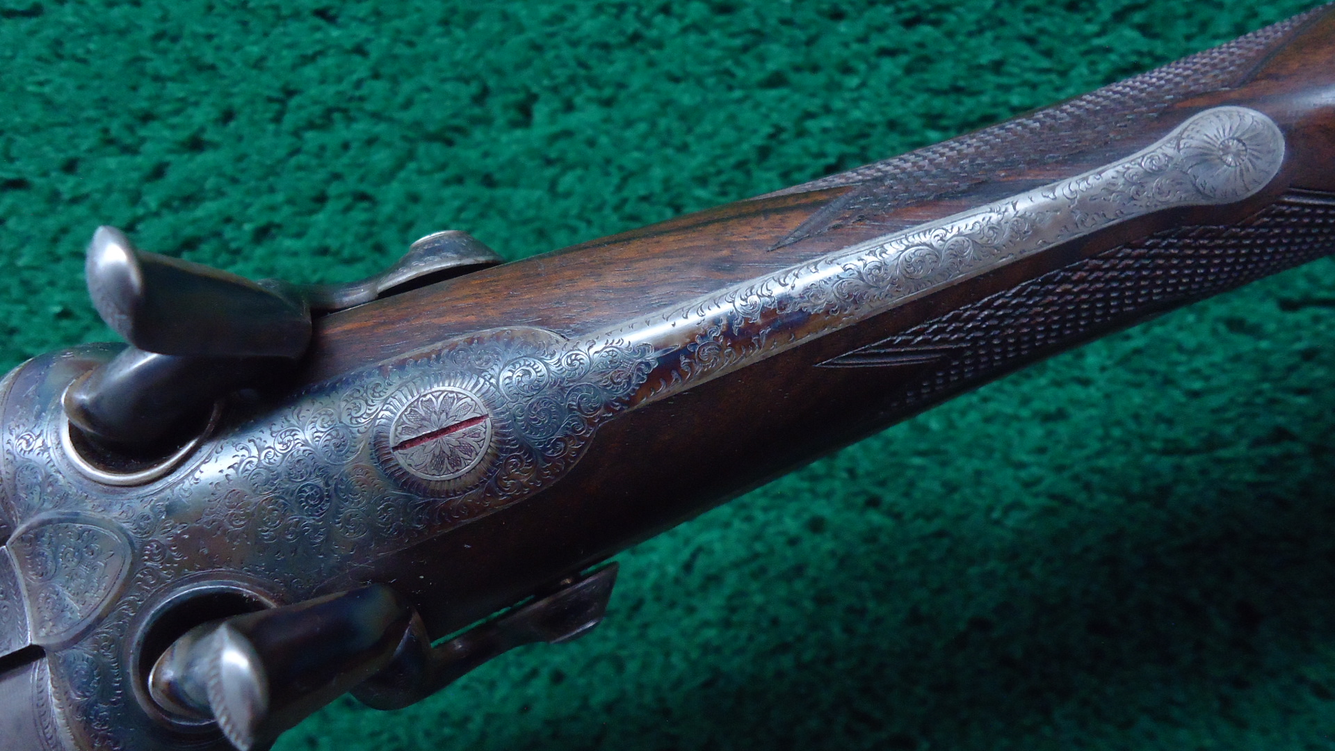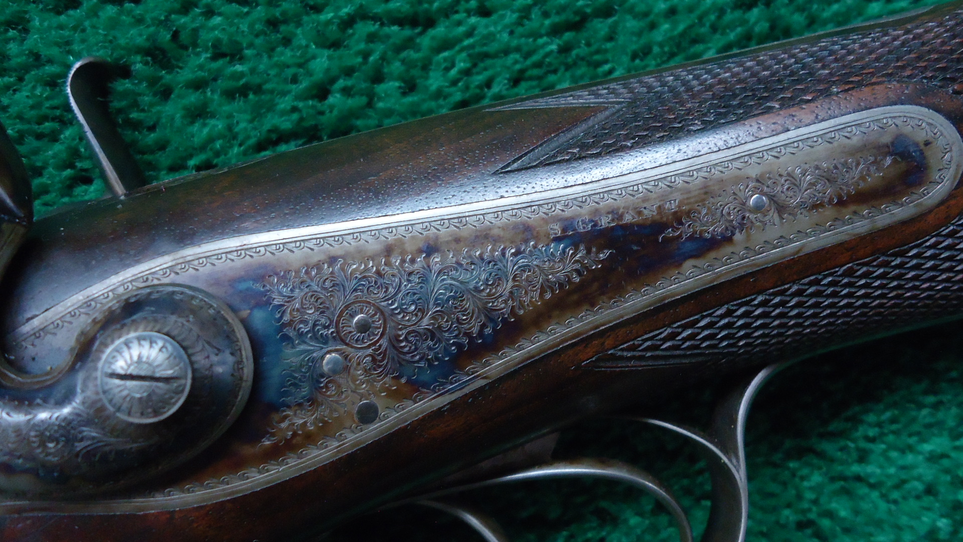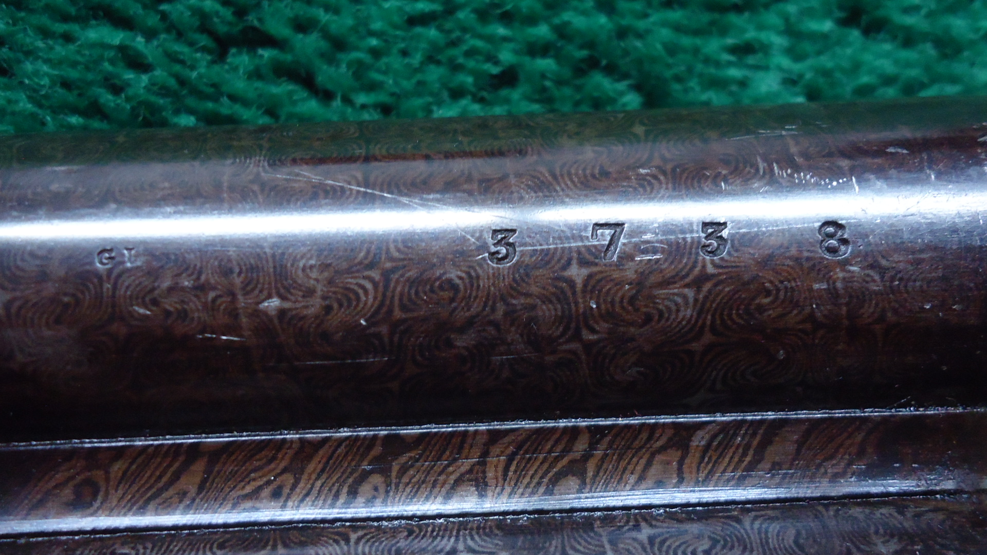 MSG1262 MASSIVE SUPERB CONDITION CASED 8 BORE UNDERLEVER DOUBLE HAMMERGUN BY STEPHEN GRANT; 34 inch Damascus barrels marked “STEPHEN GRANT 67A ST. JAMES’S STREET LONDON” on the top of the rib and the flats showing proper London black powder proofs and bore mark “8”. The bores are excellent with bright and shiny surfaces. The action and back action locks show fine English scroll engraving in about 80% coverage overall. Each of the locks is also engraved “S. GRANT” and the watertable shows the London View proof along with E.C. Hodges crown and triangle mark. The shotgun features the strong Jones underlever action with non-rebounding hammers and key-fastened forend. The barrels retain 95% strong original brown finish with vivid Damascus pattern visible their entire length. The majority of the loss is on the top of the right barrel at breech where there is a 1/4″ x 1″ area that is silver in color where finish has worn away. A competent gunsmith could certainly tone this area down and blend it with the original finish if one wished. The action and locks show 97% original color case hardened finish which remains rich and vivid. The triggerguard shows thinning and is an overall medium gray brown patina. The straight grip stock and splinter forend are of handsomely figured English walnut and features an engraved toe and heel buttplate. The stocks rate excellent with 98% original finish remaining, nice, raised grain feel and perfect fit. The checkering remains sharp and crisp, the fancy engraved wedge escutcheons are fit within uncheckered diamonds on either side of forend. The toe line of the stock shows a nicely tarnished silver monogram plate which is engraved “GWW”, the initials stenciled upon the lid of the original case also marked with the same initials. The case is in overall about good condition. The latch needs word and the exterior surface being dry and with the carrying handle missing along with the straps. An old express label marked “BALTIMORE MD” is present on the lid. It has a pair of replacement firing pins and an assorted lot of cleaning tools. This is a very handsome and extremely fine big bore British double gun.