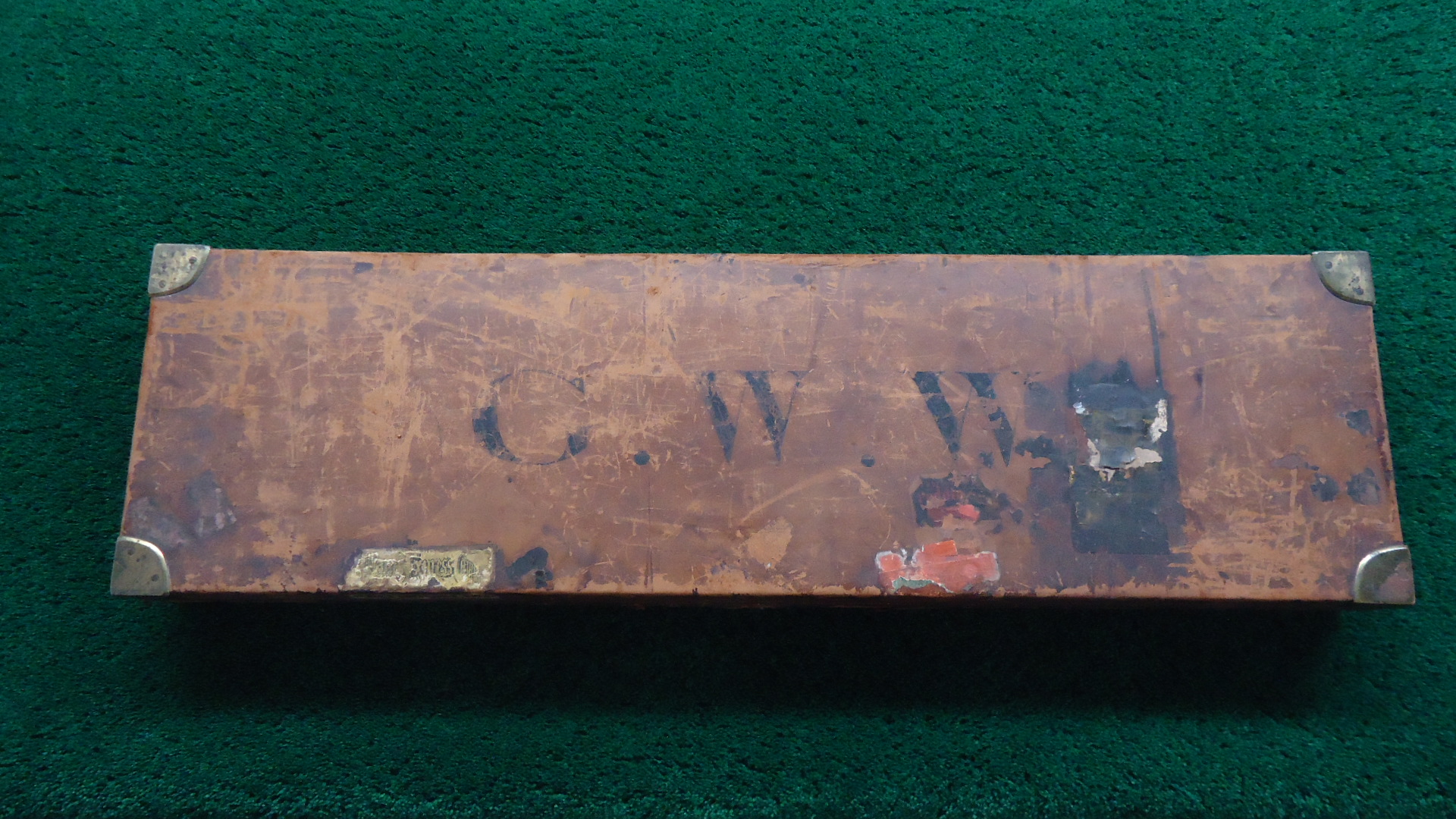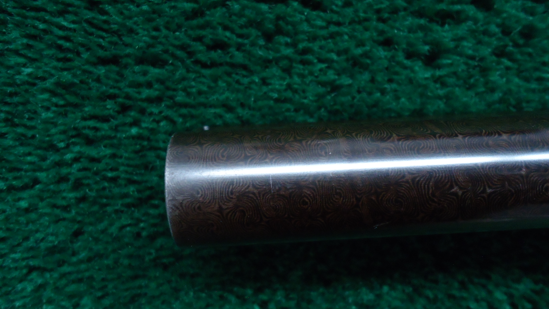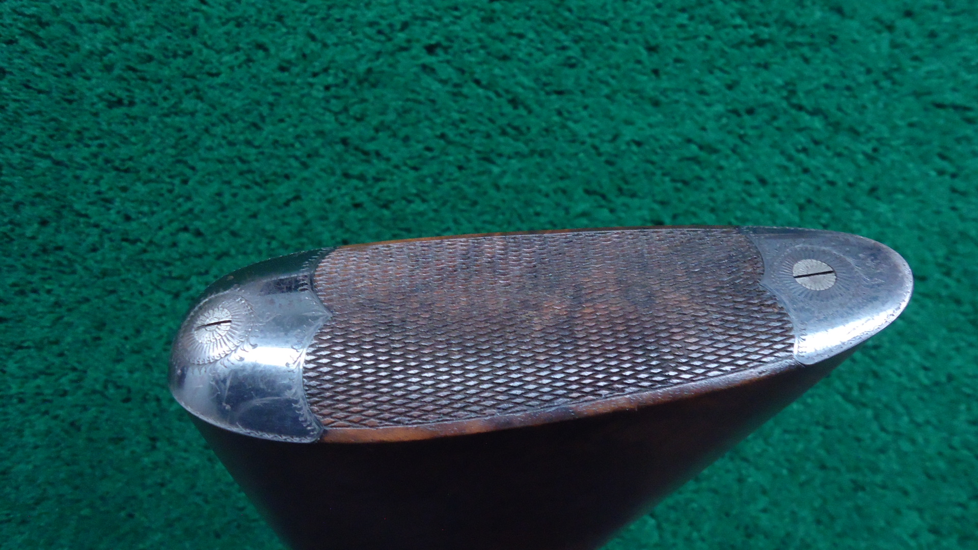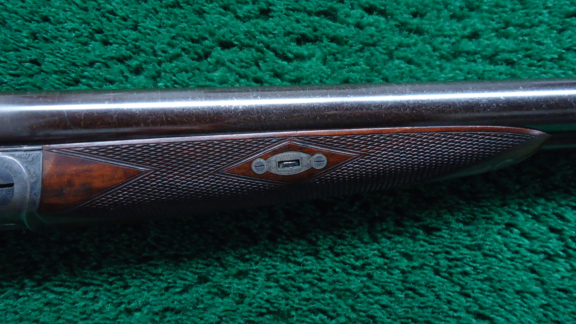 MSG1262 MASSIVE SUPERB CONDITION CASED 8 BORE UNDERLEVER DOUBLE HAMMERGUN BY STEPHEN GRANT; 34 inch Damascus barrels marked “STEPHEN GRANT 67A ST. JAMES’S STREET LONDON” on the top of the rib and the flats showing proper London black powder proofs and bore mark “8”. The bores are excellent with bright and shiny surfaces. The action and back action locks show fine English scroll engraving in about 80% coverage overall. Each of the locks is also engraved “S. GRANT” and the watertable shows the London View proof along with E.C. Hodges crown and triangle mark. The shotgun features the strong Jones underlever action with non-rebounding hammers and key-fastened forend. The barrels retain 95% strong original brown finish with vivid Damascus pattern visible their entire length. The majority of the loss is on the top of the right barrel at breech where there is a 1/4″ x 1″ area that is silver in color where finish has worn away. A competent gunsmith could certainly tone this area down and blend it with the original finish if one wished. The action and locks show 97% original color case hardened finish which remains rich and vivid. The triggerguard shows thinning and is an overall medium gray brown patina. The straight grip stock and splinter forend are of handsomely figured English walnut and features an engraved toe and heel buttplate. The stocks rate excellent with 98% original finish remaining, nice, raised grain feel and perfect fit. The checkering remains sharp and crisp, the fancy engraved wedge escutcheons are fit within uncheckered diamonds on either side of forend. The toe line of the stock shows a nicely tarnished silver monogram plate which is engraved “GWW”, the initials stenciled upon the lid of the original case also marked with the same initials. The case is in overall about good condition. The latch needs word and the exterior surface being dry and with the carrying handle missing along with the straps. An old express label marked “BALTIMORE MD” is present on the lid. It has a pair of replacement firing pins and an assorted lot of cleaning tools. This is a very handsome and extremely fine big bore British double gun.
