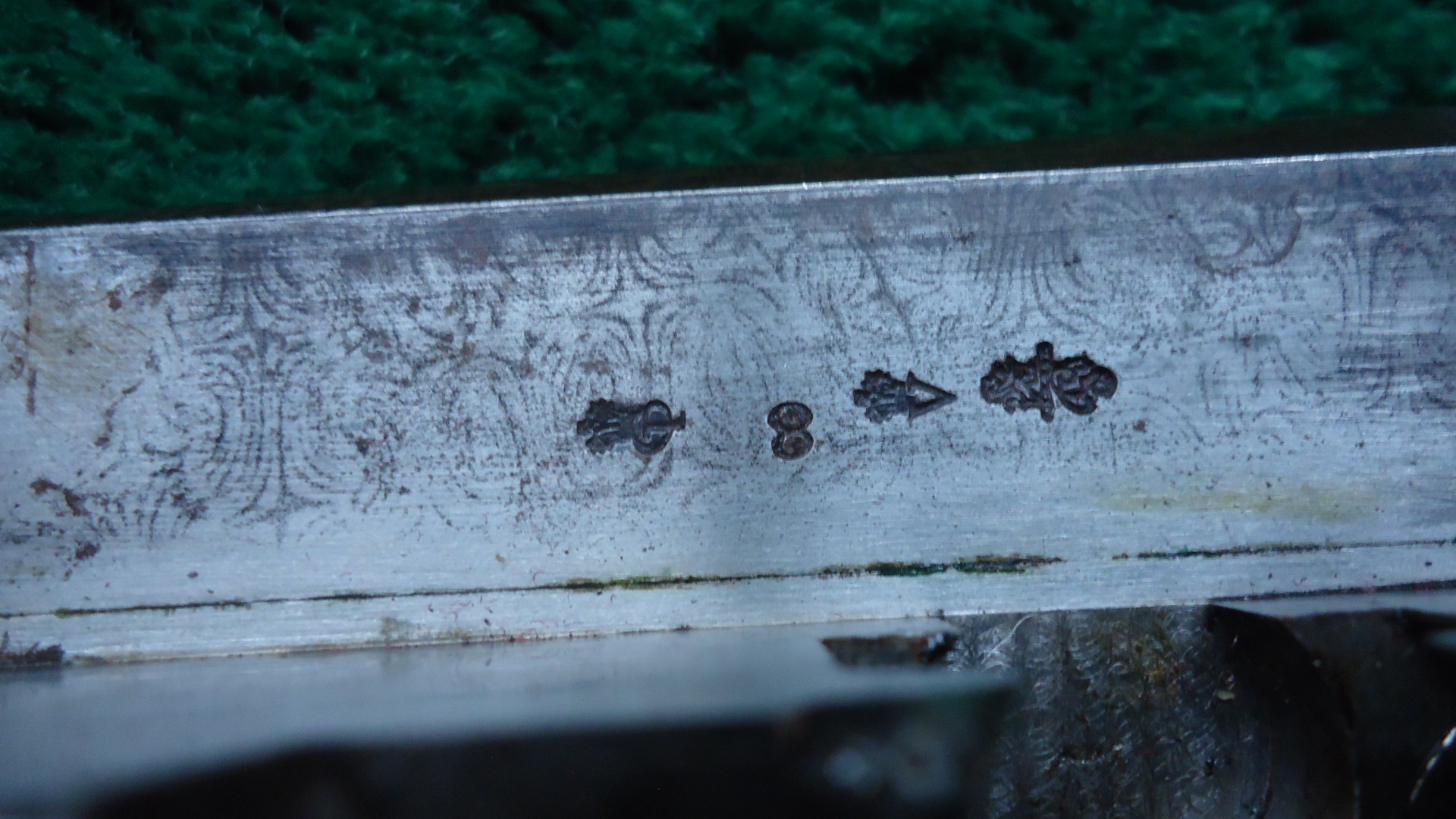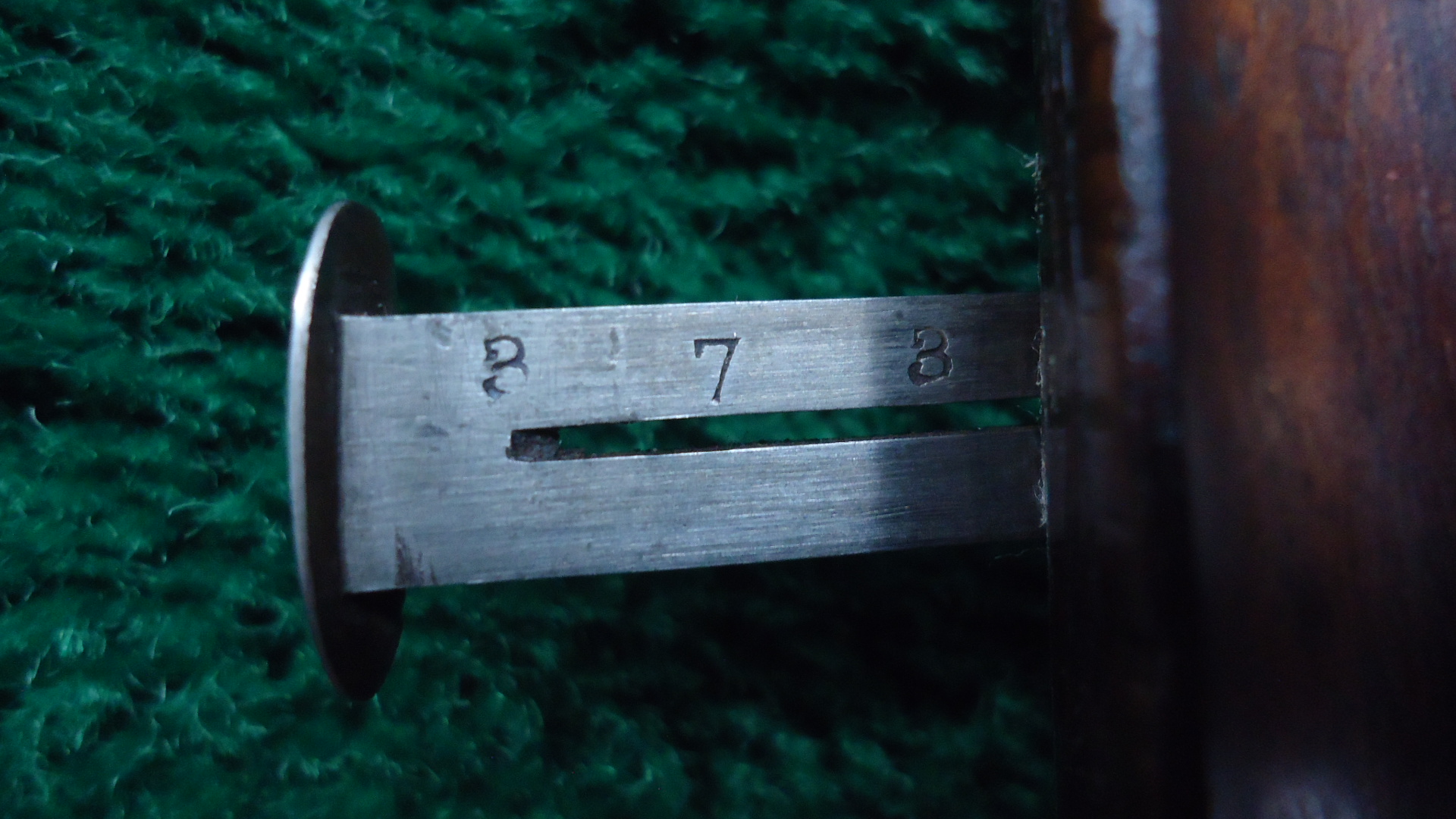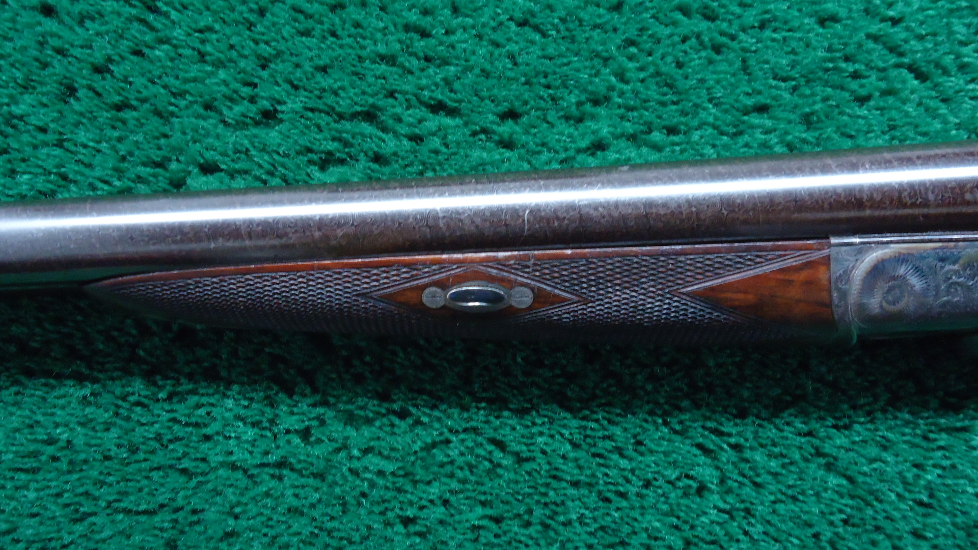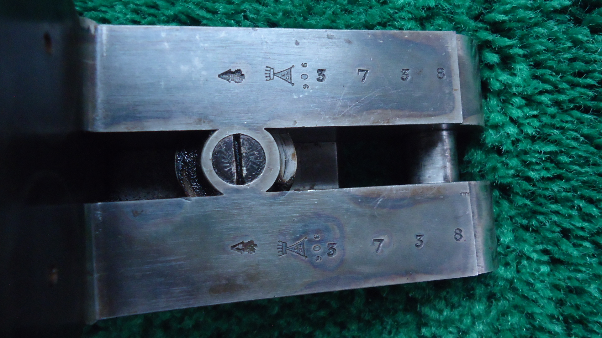 MSG1262 MASSIVE SUPERB CONDITION CASED 8 BORE UNDERLEVER DOUBLE HAMMERGUN BY STEPHEN GRANT; 34 inch Damascus barrels marked “STEPHEN GRANT 67A ST. JAMES’S STREET LONDON” on the top of the rib and the flats showing proper London black powder proofs and bore mark “8”. The bores are excellent with bright and shiny surfaces. The action and back action locks show fine English scroll engraving in about 80% coverage overall. Each of the locks is also engraved “S. GRANT” and the watertable shows the London View proof along with E.C. Hodges crown and triangle mark. The shotgun features the strong Jones underlever action with non-rebounding hammers and key-fastened forend. The barrels retain 95% strong original brown finish with vivid Damascus pattern visible their entire length. The majority of the loss is on the top of the right barrel at breech where there is a 1/4″ x 1″ area that is silver in color where finish has worn away. A competent gunsmith could certainly tone this area down and blend it with the original finish if one wished. The action and locks show 97% original color case hardened finish which remains rich and vivid. The triggerguard shows thinning and is an overall medium gray brown patina. The straight grip stock and splinter forend are of handsomely figured English walnut and features an engraved toe and heel buttplate. The stocks rate excellent with 98% original finish remaining, nice, raised grain feel and perfect fit. The checkering remains sharp and crisp, the fancy engraved wedge escutcheons are fit within uncheckered diamonds on either side of forend. The toe line of the stock shows a nicely tarnished silver monogram plate which is engraved “GWW”, the initials stenciled upon the lid of the original case also marked with the same initials. The case is in overall about good condition. The latch needs word and the exterior surface being dry and with the carrying handle missing along with the straps. An old express label marked “BALTIMORE MD” is present on the lid. It has a pair of replacement firing pins and an assorted lot of cleaning tools. This is a very handsome and extremely fine big bore British double gun.