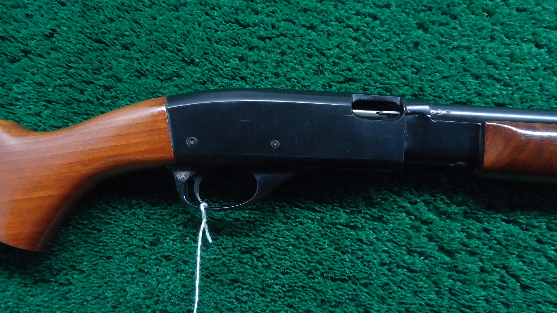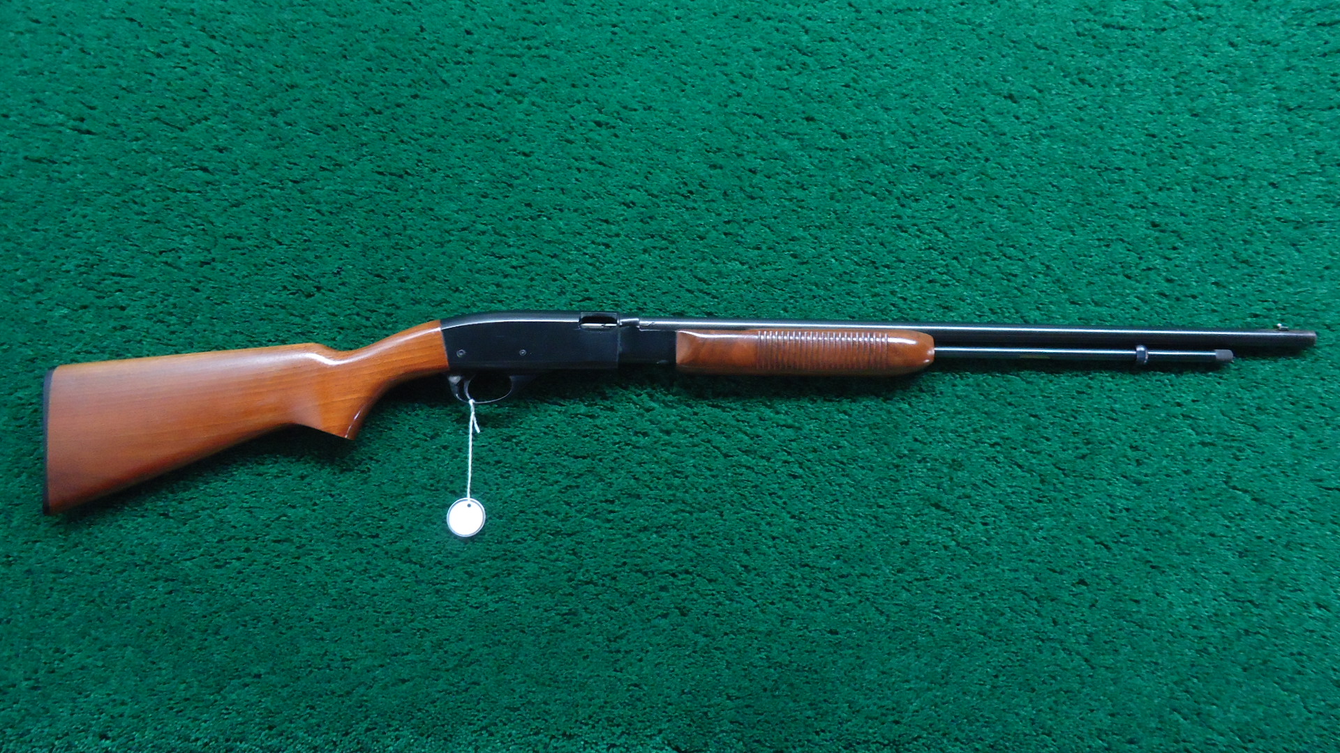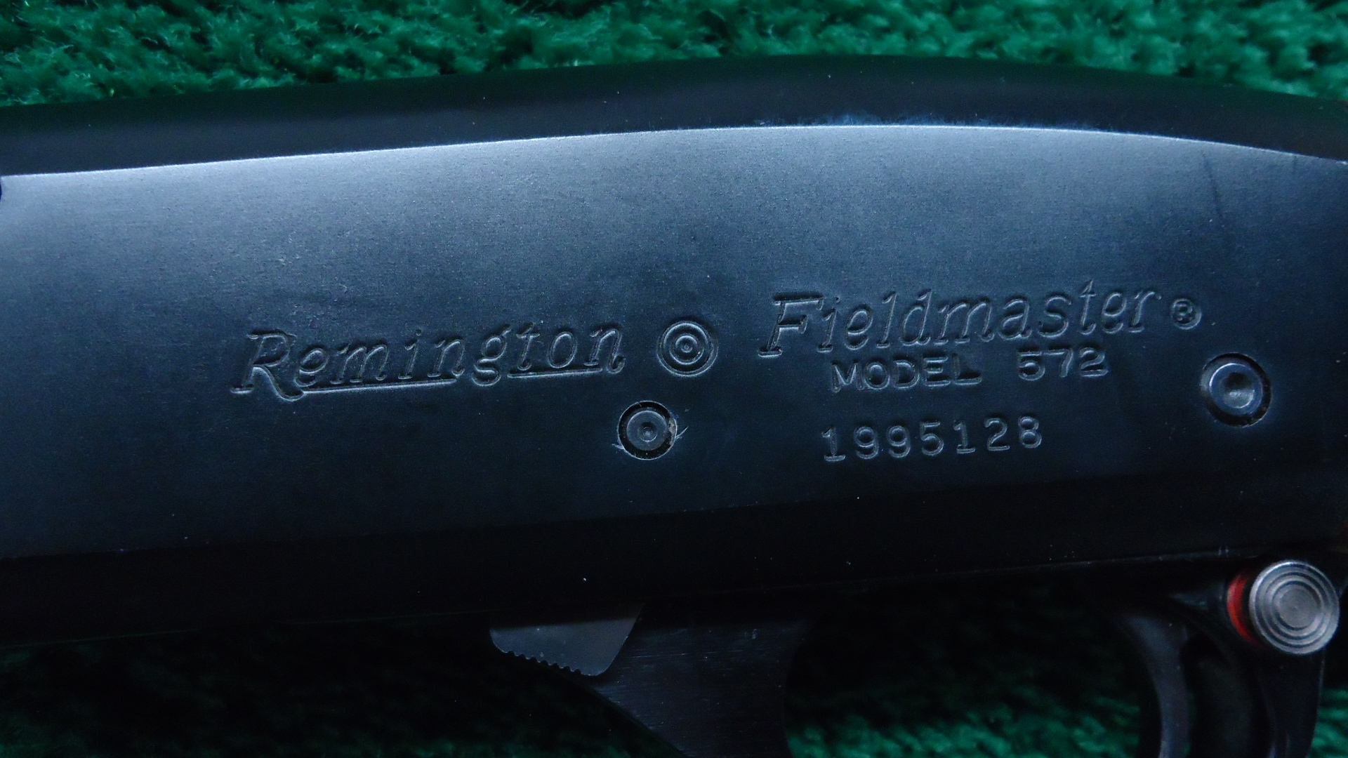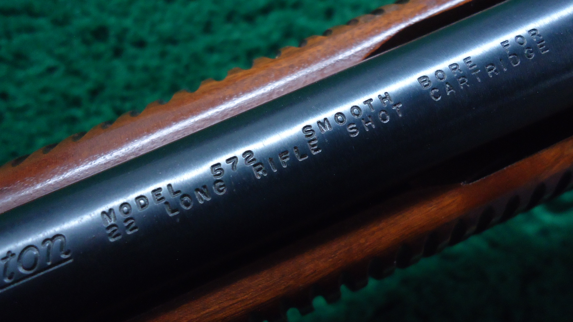 R2452 REMINGTON MODEL 572 FIELDMASTER SMOOTH BORE SLIDE ACTION RIFLE; 23 inch round barrel marked “MODEL 572 SMOOTHBORE FOR / 22 LONG RIFLE SHOT CARTRIDGE”. Has a bead front sight only with no rear sight. 15 shot tube magazine. Black anodized aluminum receiver. Grooved walnut forearm with matching smooth pistol grip buttstock. Remington marked checkered black plastic butt plate. Excellent overall condition showing only light use with just a few light scratches and handling marks. Excellent bright shiny bore. Hard to find smooth bore!