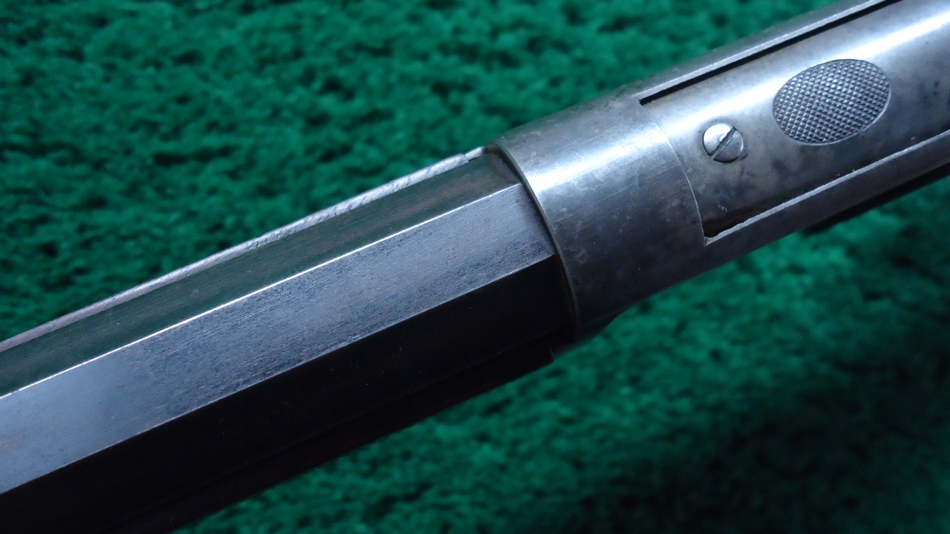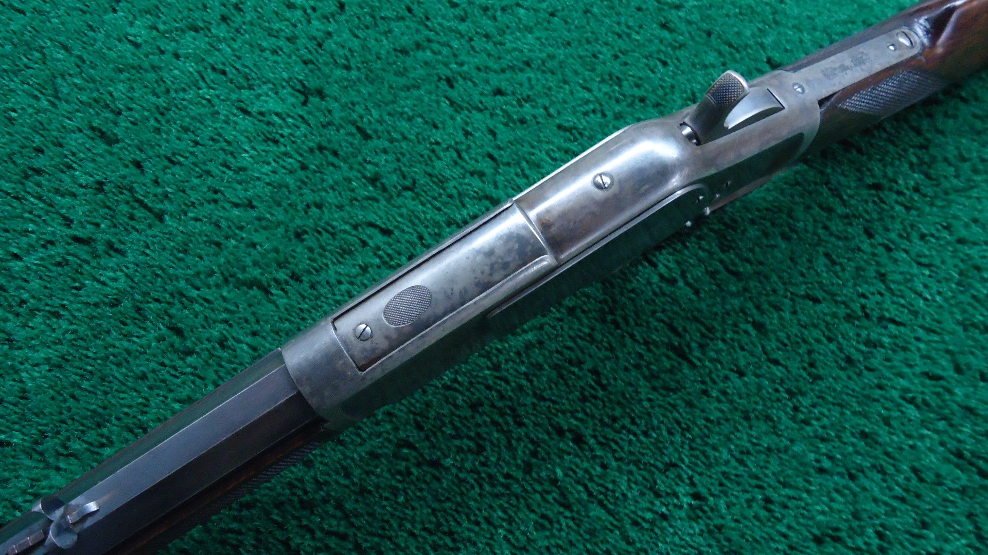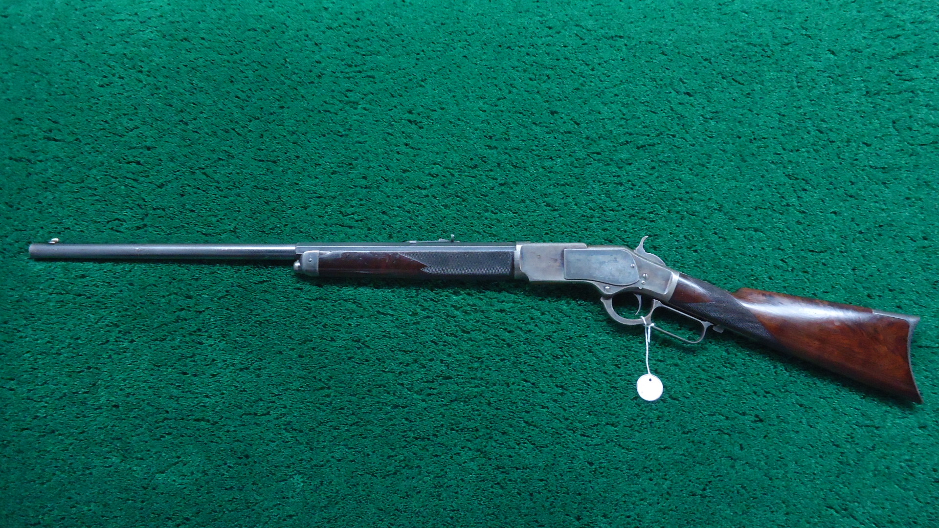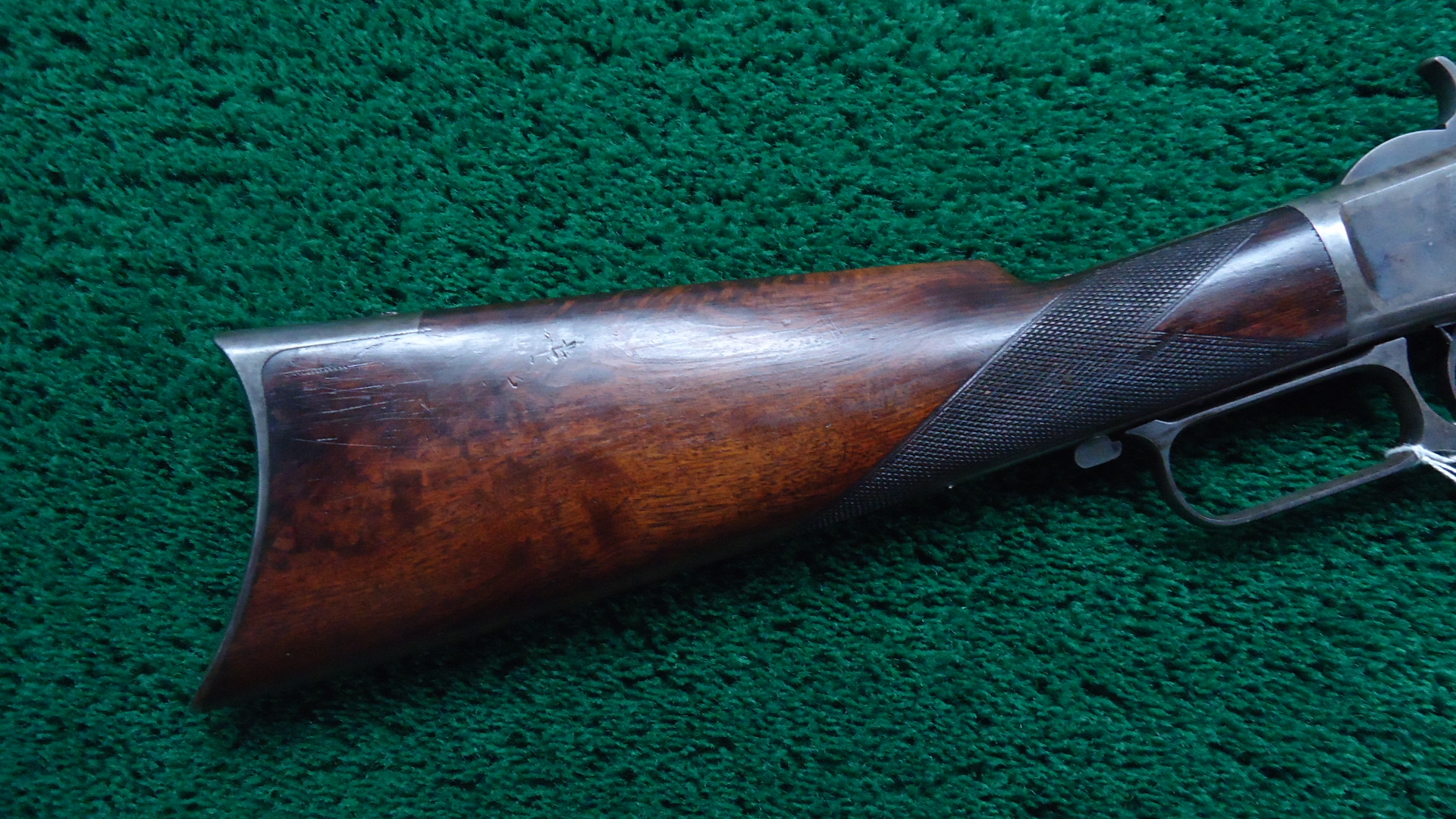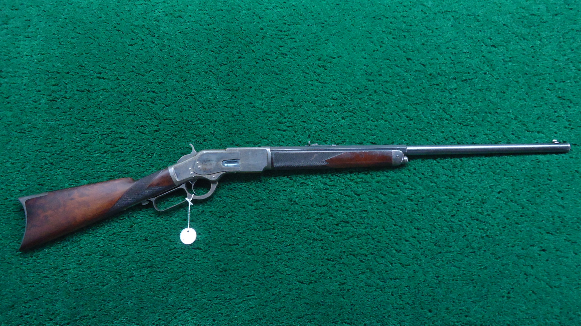 W2020 DELUXE 1ST MODEL 1873 WINCHESTER RIFLE; Deluxe rifle with special features that include a 24 inch half octagon barrel chambered in 44 WCF caliber with a bright shiny bore that has some light scattered roughness. Barrel retains most original thinning blue with some light scratches. Sights include a German silver blade front and sporting rear. Half length magazine tube. Case hardened frame retains most vivid case colors especially in the protected areas as do the hammer and lever. Set trigger and crisp action. Deluxe checkered straight grip walnut stock and forearm. Re-cut checkering and a small piece filled on the left side next to the cap on the forearm but still retains most original varnish. Stock has re-cut checkering with traces of original varnish. A chip out by the upper tang which is most likely from removing the stock numerous times. Butt plate has traces of case colors. Interesting gun being a First Model Variation 5 with the thumbprint dust cover and the trigger pin exposed as well as the later butt plate. Good looking deluxe rifle from 1878!