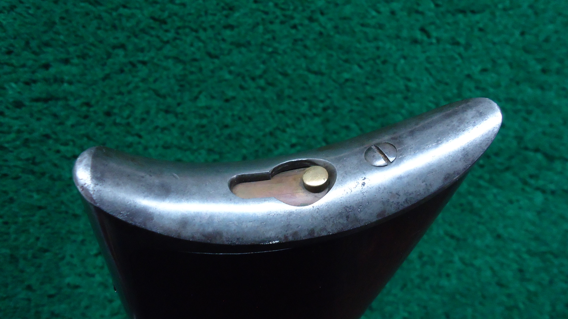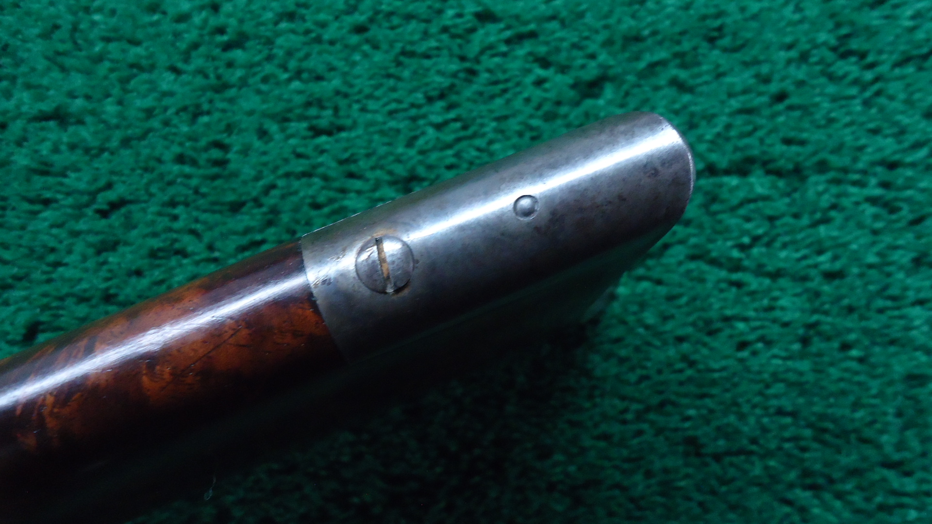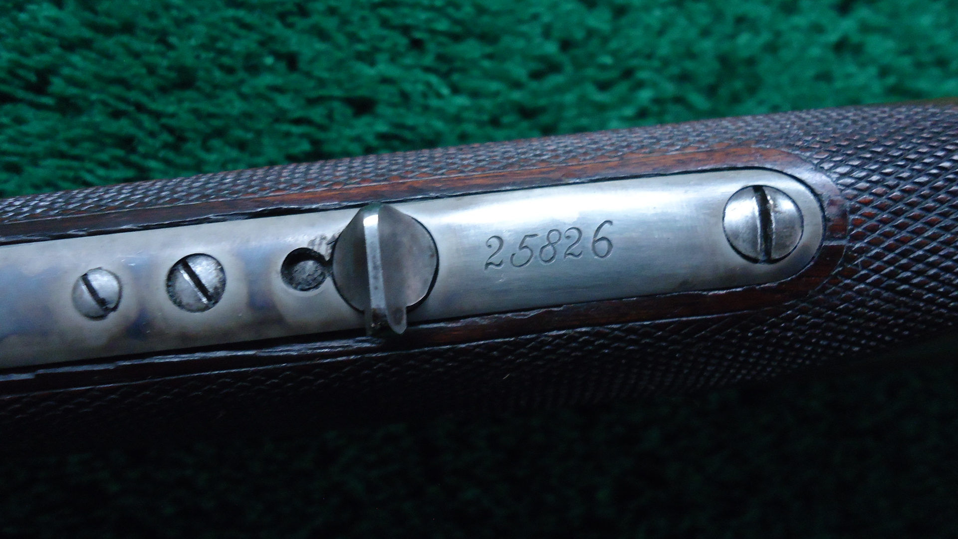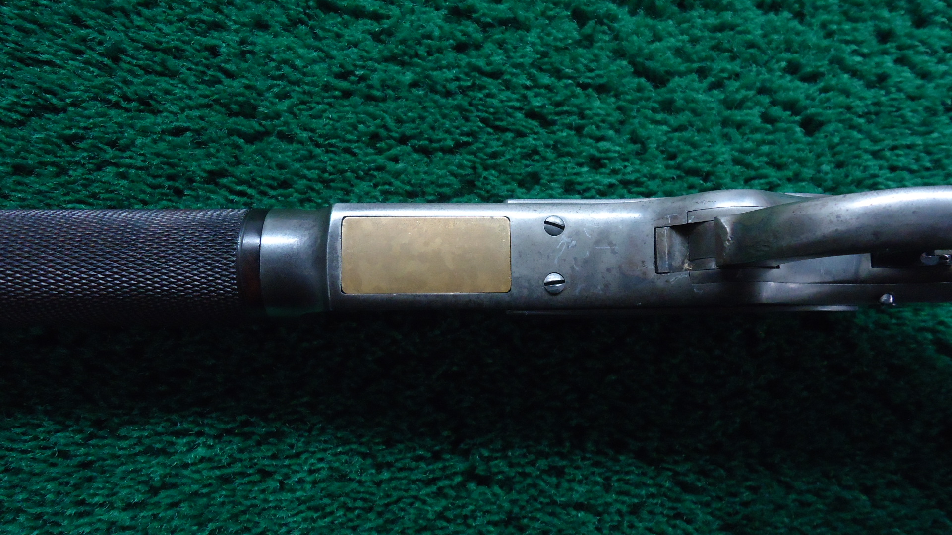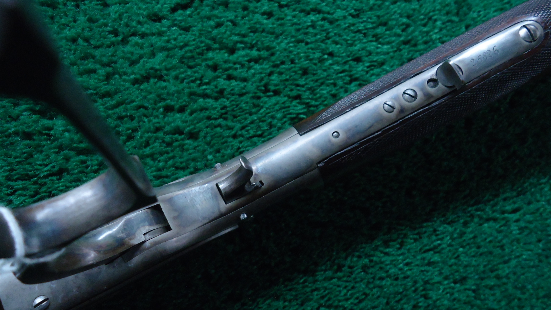 W2020 DELUXE 1ST MODEL 1873 WINCHESTER RIFLE; Deluxe rifle with special features that include a 24 inch half octagon barrel chambered in 44 WCF caliber with a bright shiny bore that has some light scattered roughness. Barrel retains most original thinning blue with some light scratches. Sights include a German silver blade front and sporting rear. Half length magazine tube. Case hardened frame retains most vivid case colors especially in the protected areas as do the hammer and lever. Set trigger and crisp action. Deluxe checkered straight grip walnut stock and forearm. Re-cut checkering and a small piece filled on the left side next to the cap on the forearm but still retains most original varnish. Stock has re-cut checkering with traces of original varnish. A chip out by the upper tang which is most likely from removing the stock numerous times. Butt plate has traces of case colors. Interesting gun being a First Model Variation 5 with the thumbprint dust cover and the trigger pin exposed as well as the later butt plate. Good looking deluxe rifle from 1878!