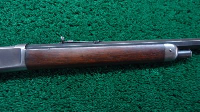 W4067 ANTIQUE WINCHESTER MODEL 1892 RIFLE IN 38 WCF; 24 inch octagon barrel chambered in 38 WCF caliber with a good bore that has shine and visible rifling with some light scattered roughness throughout. Original sights include a German silver blade front and sporting rear. Magazine tube has been shortened with the dovetail on bottom of barrel filled. Barrel has most thinning blue remaining with sharp corners and clear markings. Receiver has a good amount of thinning original blue in the protected areas. The balance fading to a dull silver/gray at the carry point and showing slight edge wear. Traces of case color on the hammer and lever. Walnut stocks are in good condition with a few light handling mars and a crescent rifle style buttplate. Crisp functioning action. Early gun with an Antique serial number in the 28k range that was made in 1894. Should be a good shooter.