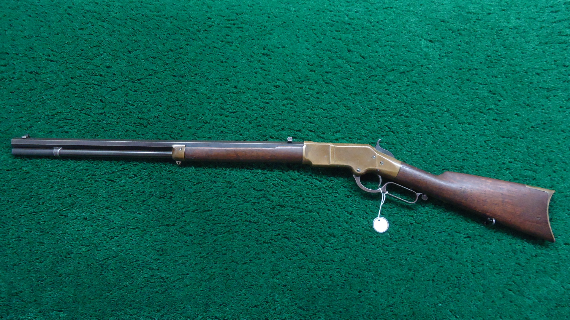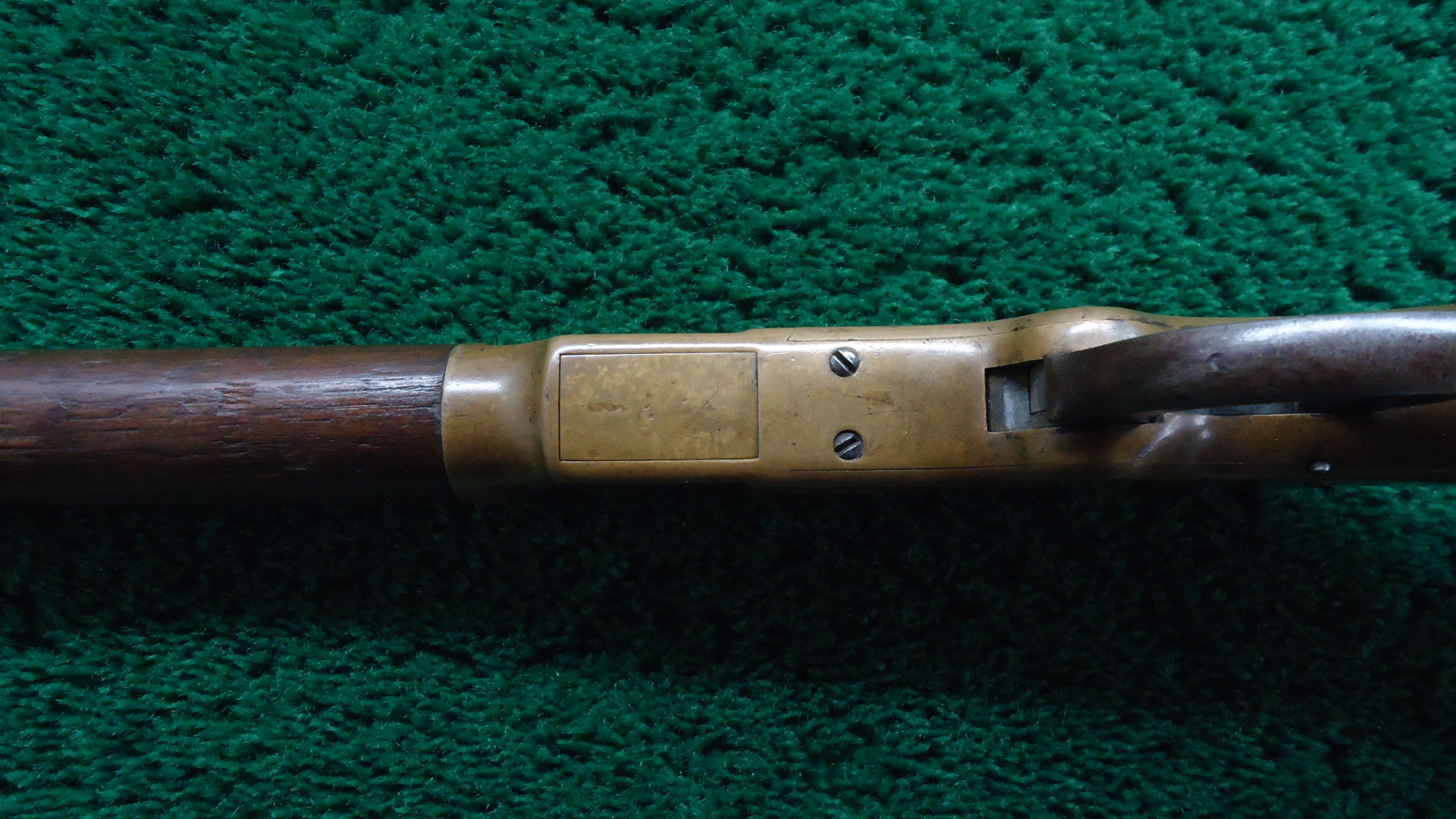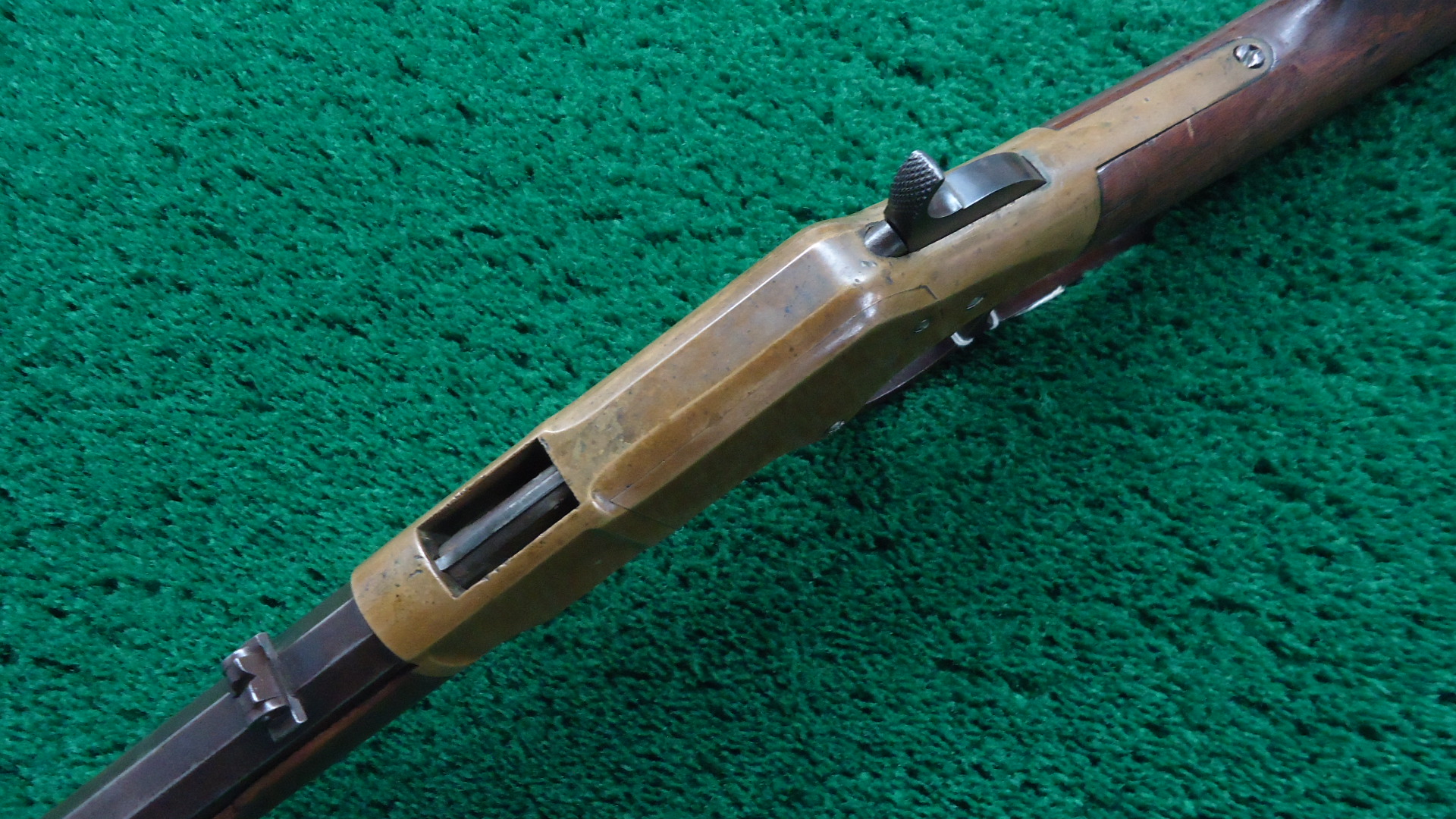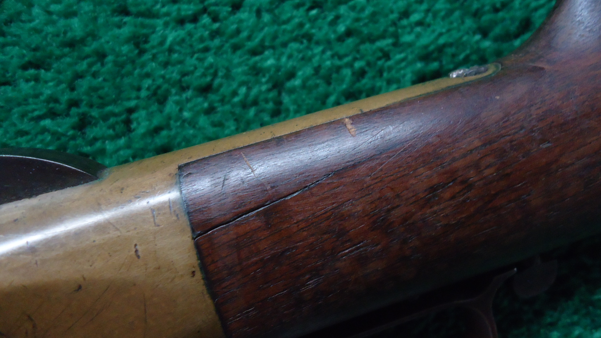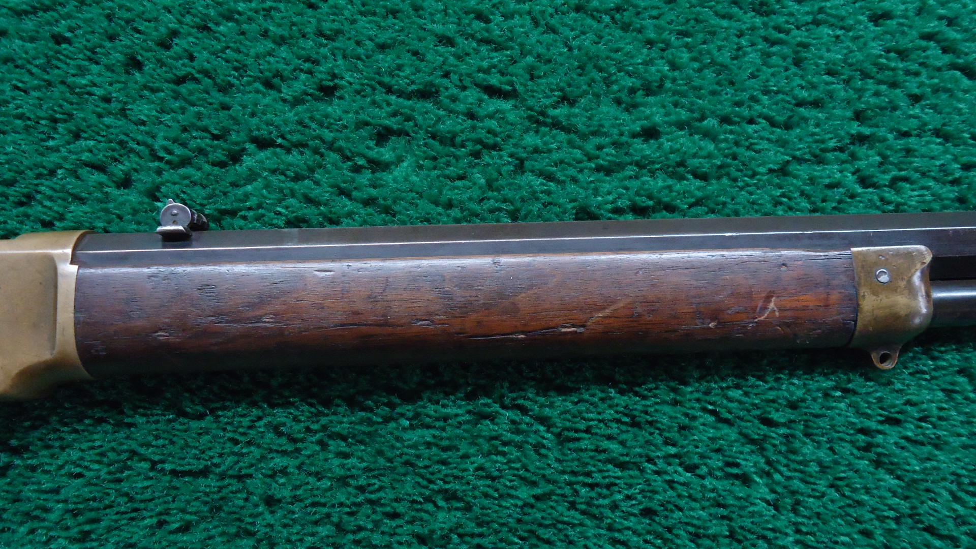 W4157 WINCHESTER MODEL 1866 RIFLE WITH HENRY MARKED BARREL; 24 inch octagon barrel with the early “HENRY’S PATENT – OCT 16 1860 / KING’S PATENT – MARCH 29 1866” barrel address. Chambered in 44 RF caliber with a bore that shows strong rifling and light roughness throughout. Sights include a replaced blade front and a flip up ladder sight in the rear that has been modified with the ladder removed. The barrel and full length magazine tube are a plum/brown color with traces of blue in the protected areas. Brass receiver has an untouched almost dirty look to it as does the forend cap. Some buggered screws on this rifle. Hammer and lever have a gray/brown appearance while the loading gate is a gray patina. Smooth functioning action. Straight grain walnut stock set shows some wear from the last 157 years. Forearm is missing a 7 inch sliver on the left side while the buttstock has a 1-1/2 inch crack coming off the frame at the wrist on t he left side as well. Wood has an overall dry weathered appearance with a brass rifle style buttplate. Forend cap is missing the sling swivel but the one on the stock is present. 19k serial range with the number on the inside. A good honest looking example of an early Winchester rifle from 1868.
