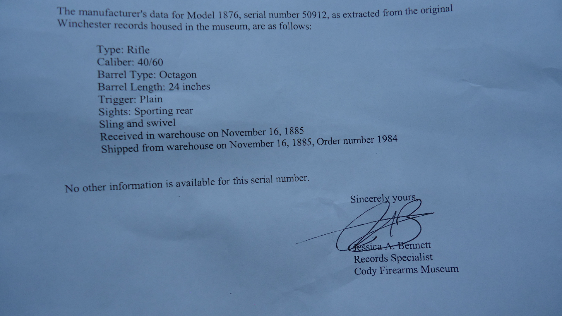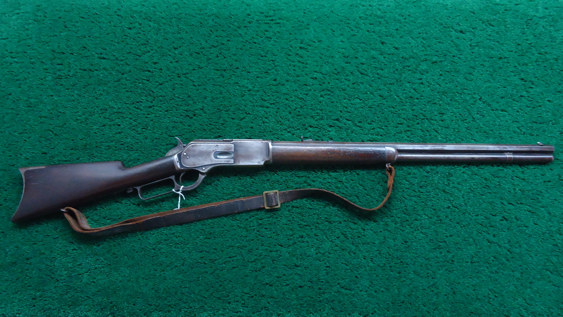 W4363 SPECIAL ORDER WINCHESTER MODEL 1876 SHORT RIFLE CHAMBERED FOR .40-60; 24 inch octagon barrel. Full length magazine. Original No. 21 sporting front sight and No. 22 Sporting rear. Plain walnut forearm with matching straight grip buttock features a leather sling on factory sling swivels and a crescent rifle buttplate. Near very good condition overall retaining perhaps 20% original finish mostly in protected areas with the balance a mottled grey brown patina. The extractor has been replaced with a 1st model open-top type that does not have the hook to draw the dust cover back. This is likely what has caused a chip to be broken out of the the rear edge of the barrel bridge. The action is otherwise tight and sound. The wood is solid and full fitting with typical wear and handling marks. The leather sling shows the distress of old age and may actually be the original. Comes with Factory Letter showing it left the factory in 1885 as a Model 1876 Rifle with a 24 inch Octagon barrel chambered for Caliber 40/60, with a Plain trigger, Sporting sights, and Sling and Swivels. The Winchester Model 1876 “Centennial” Rifle book by Herbert Houze shows that there are only 169 Model 1876 rifles with 24 inch octagon barrels chambered in 40-60 and only 30 of them were fitted with Sling and Swivel making this rifle quite rare.