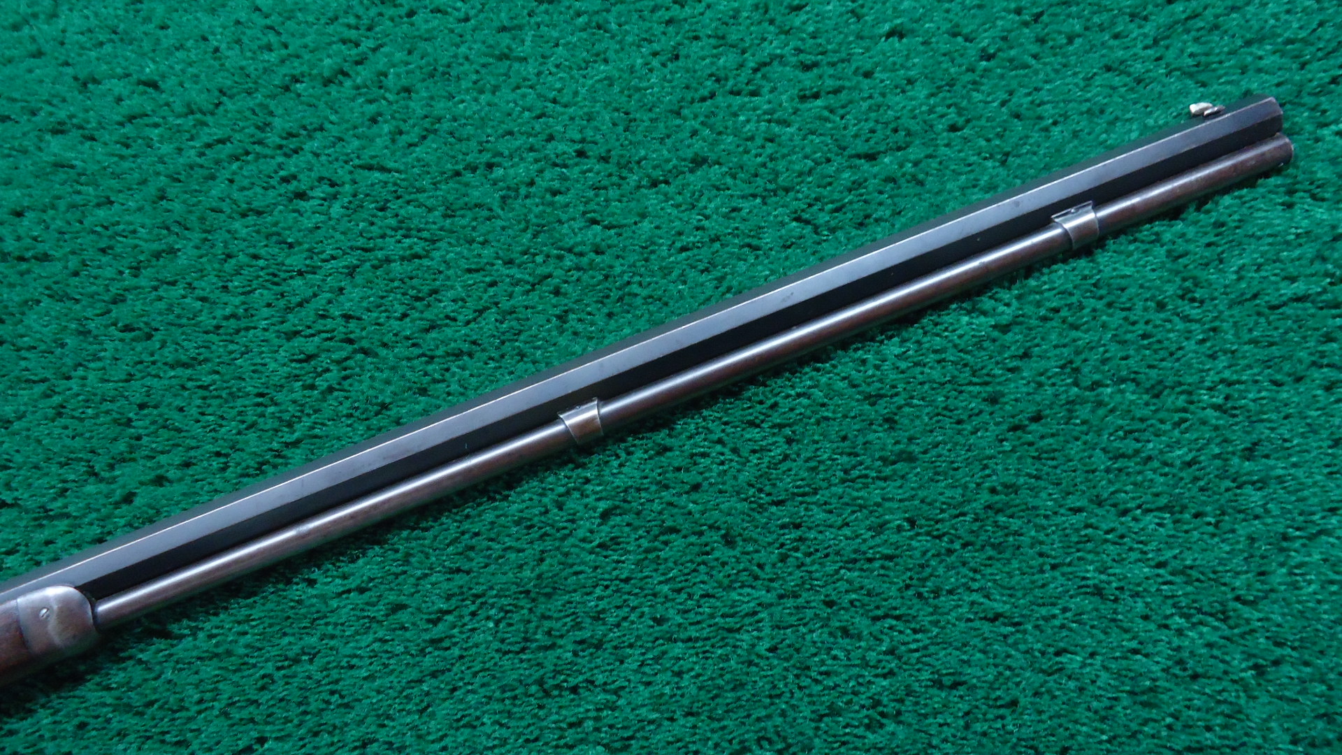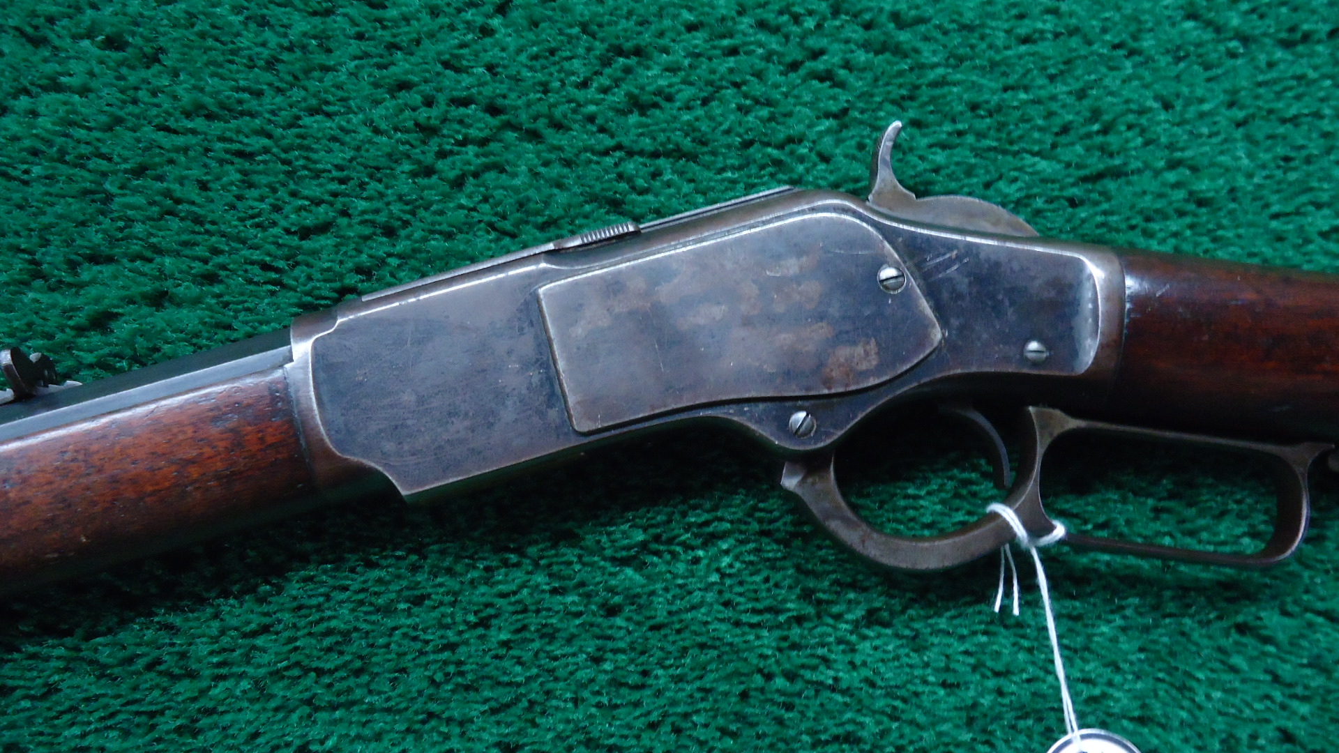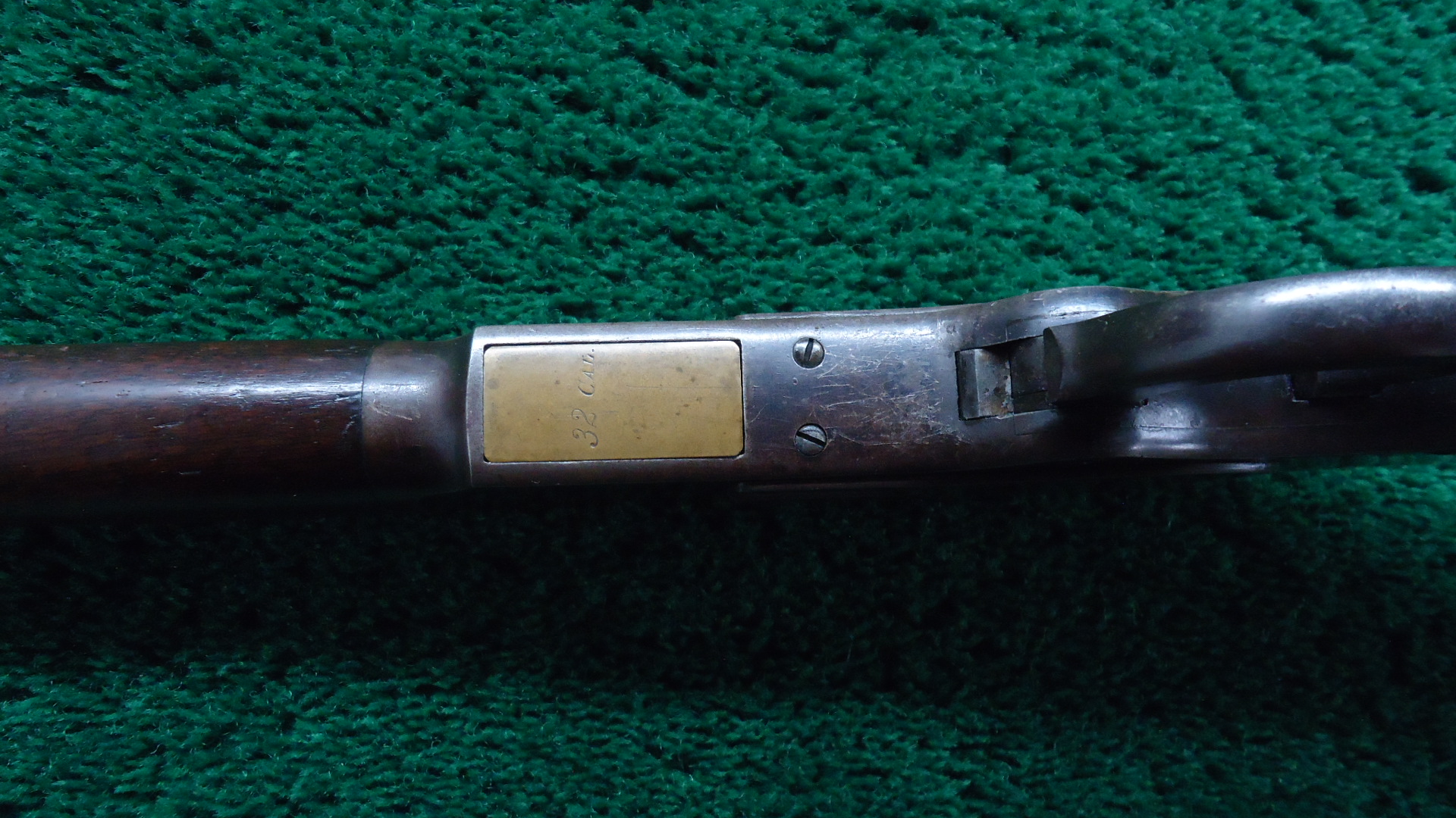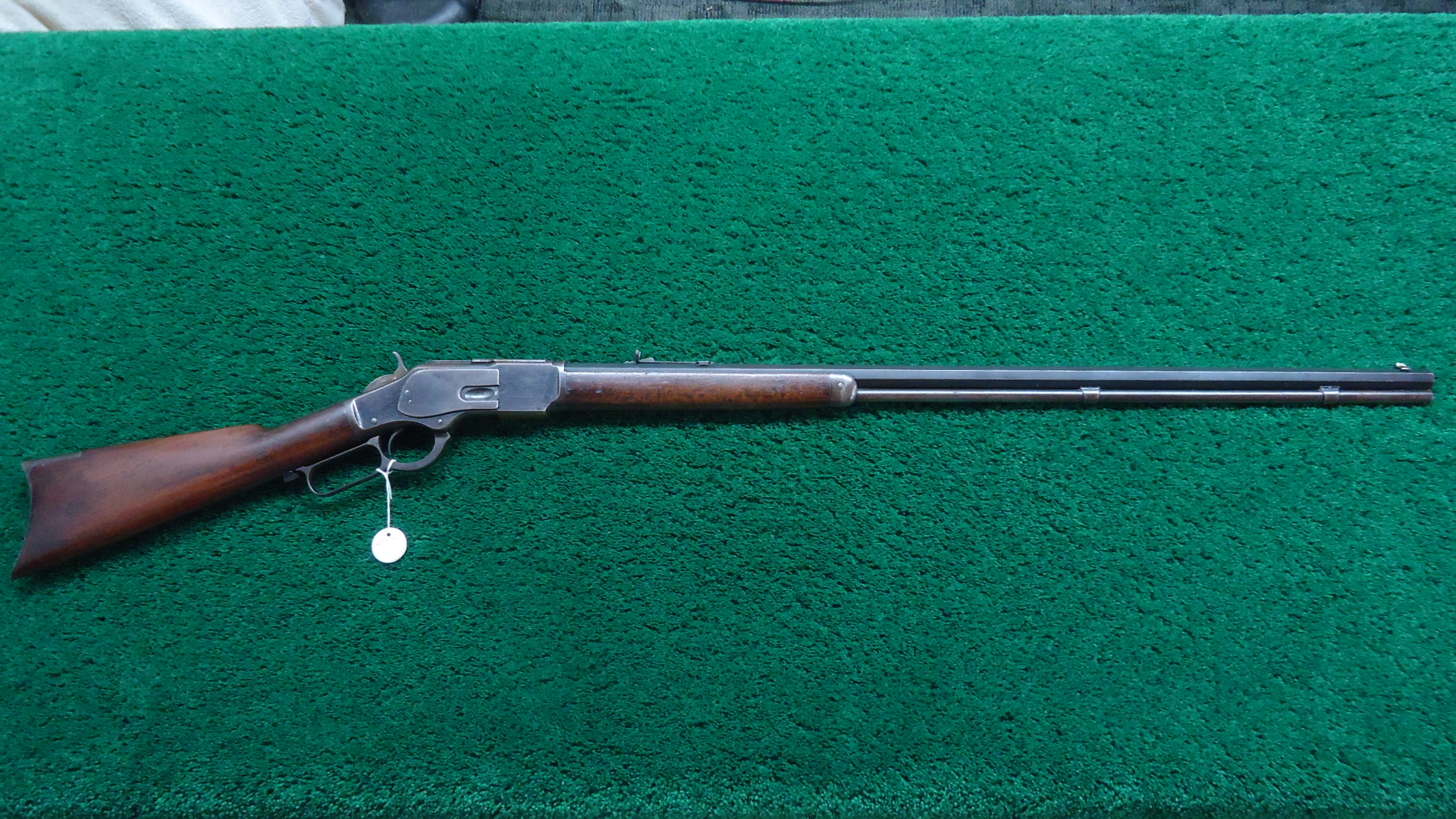 W4414 WINCHESTER MODEL 1873 RIFLE WITH 32 INCH BARREL IN 32 WCF; Special order 32 inch extra length octagon barrel chambered in 32 WCF caliber with a good bore. Sights include a German silver blade front with a typical sporting rear. Barrel retains most original thinning blue toning to plum in areas. Full length magazine tube with two hangers is a plum/brown with good blue in the protected areas. Receiver has thinning blue with splotches of light surface spotting/oxidation. There are faint traces of case colors on the hammer and lever as well as traces of niter blue on the loading gate. The re-oiled walnut stock set is in very good condition with numerous scattered minor dings and scratches. Crescent rifle style buttplate. Mechanically excellent. Made in 1890. Factory letter included. This rifle is an example of a Winchester Model 1873 rifle that was special ordered with the extra length 32 inch octagon barrel but the barrel length is not mentioned in the factory records. The rifle shows no evidence of the barrel ever being off the gun. I can only assume the lack of mention was an oversight by the factory. Everything appears to be as it left the factory. These 32 inch 1873’s don’t come up for sale very often. A rare gun that is sure to fill a hole in your collection!