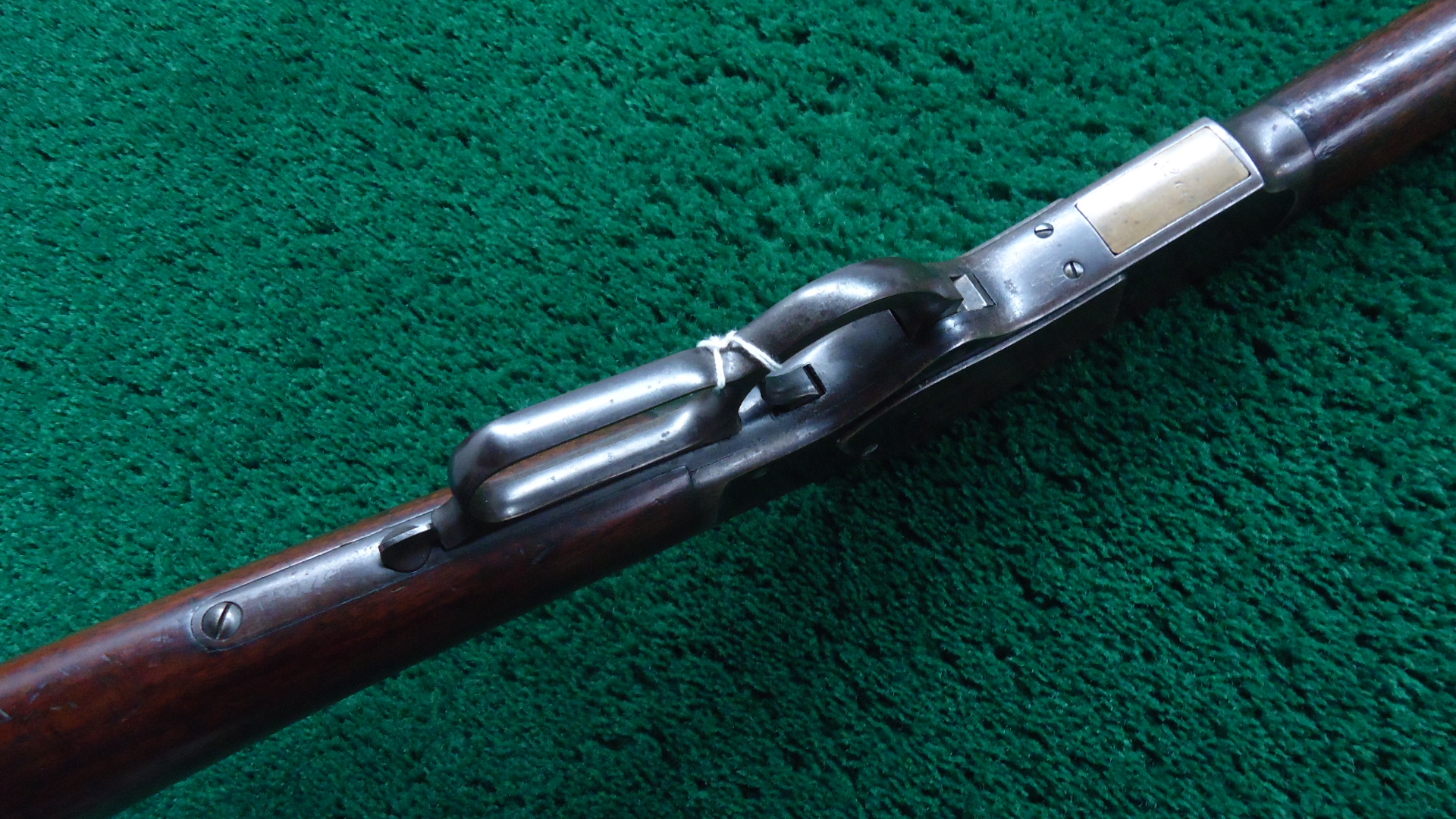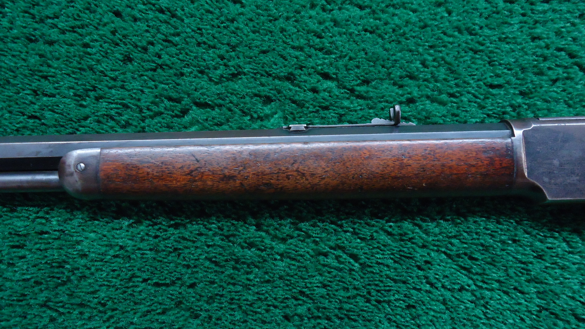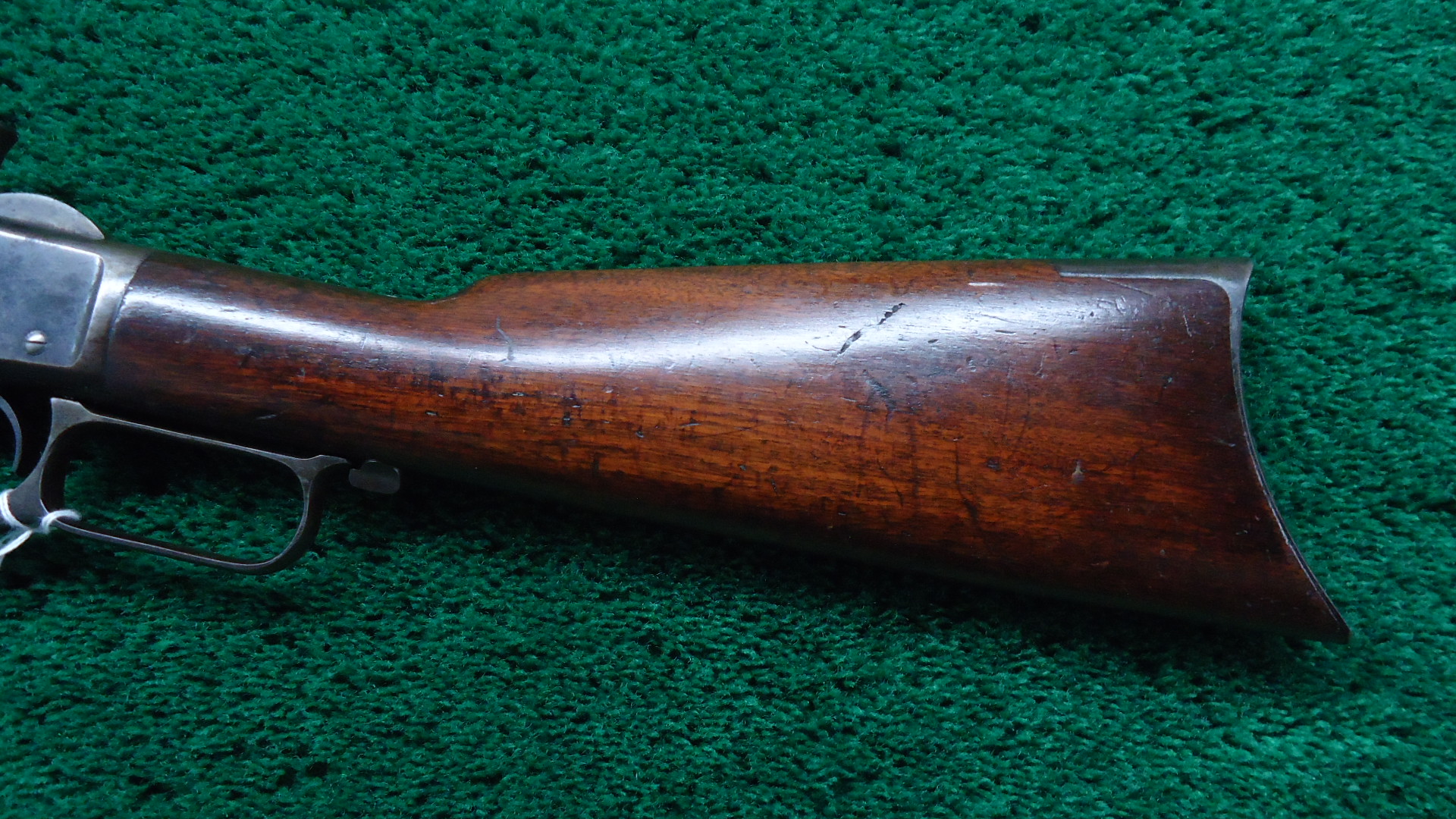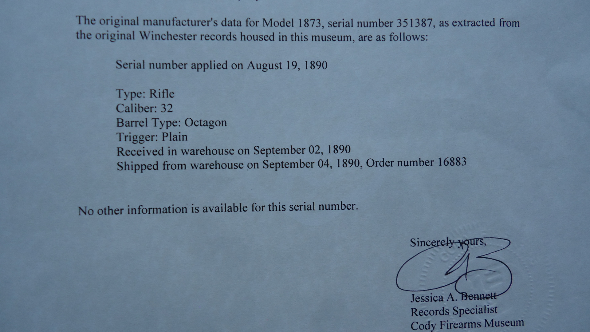 W4414 WINCHESTER MODEL 1873 RIFLE WITH 32 INCH BARREL IN 32 WCF; Special order 32 inch extra length octagon barrel chambered in 32 WCF caliber with a good bore. Sights include a German silver blade front with a typical sporting rear. Barrel retains most original thinning blue toning to plum in areas. Full length magazine tube with two hangers is a plum/brown with good blue in the protected areas. Receiver has thinning blue with splotches of light surface spotting/oxidation. There are faint traces of case colors on the hammer and lever as well as traces of niter blue on the loading gate. The re-oiled walnut stock set is in very good condition with numerous scattered minor dings and scratches. Crescent rifle style buttplate. Mechanically excellent. Made in 1890. Factory letter included. This rifle is an example of a Winchester Model 1873 rifle that was special ordered with the extra length 32 inch octagon barrel but the barrel length is not mentioned in the factory records. The rifle shows no evidence of the barrel ever being off the gun. I can only assume the lack of mention was an oversight by the factory. Everything appears to be as it left the factory. These 32 inch 1873’s don’t come up for sale very often. A rare gun that is sure to fill a hole in your collection!