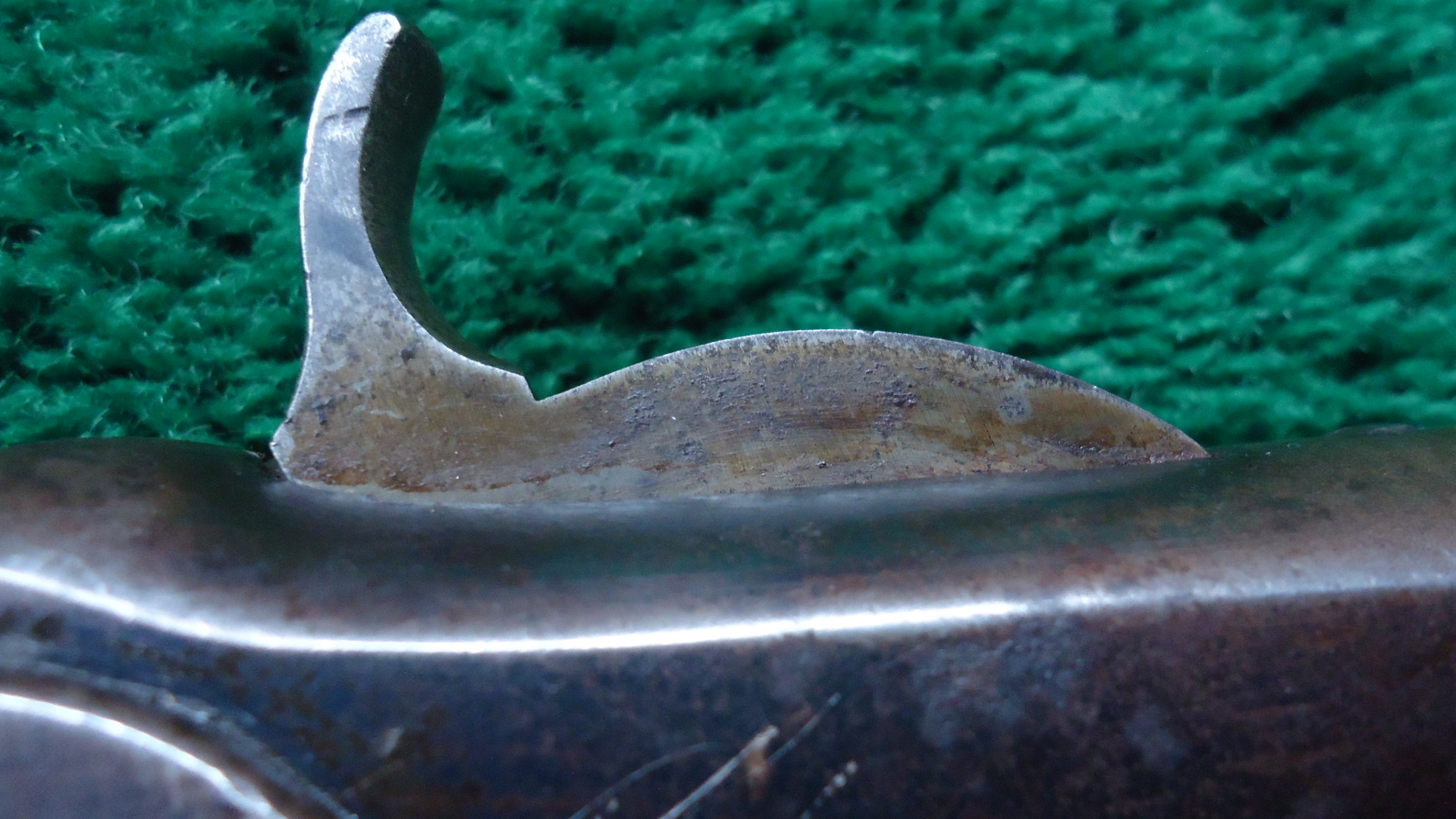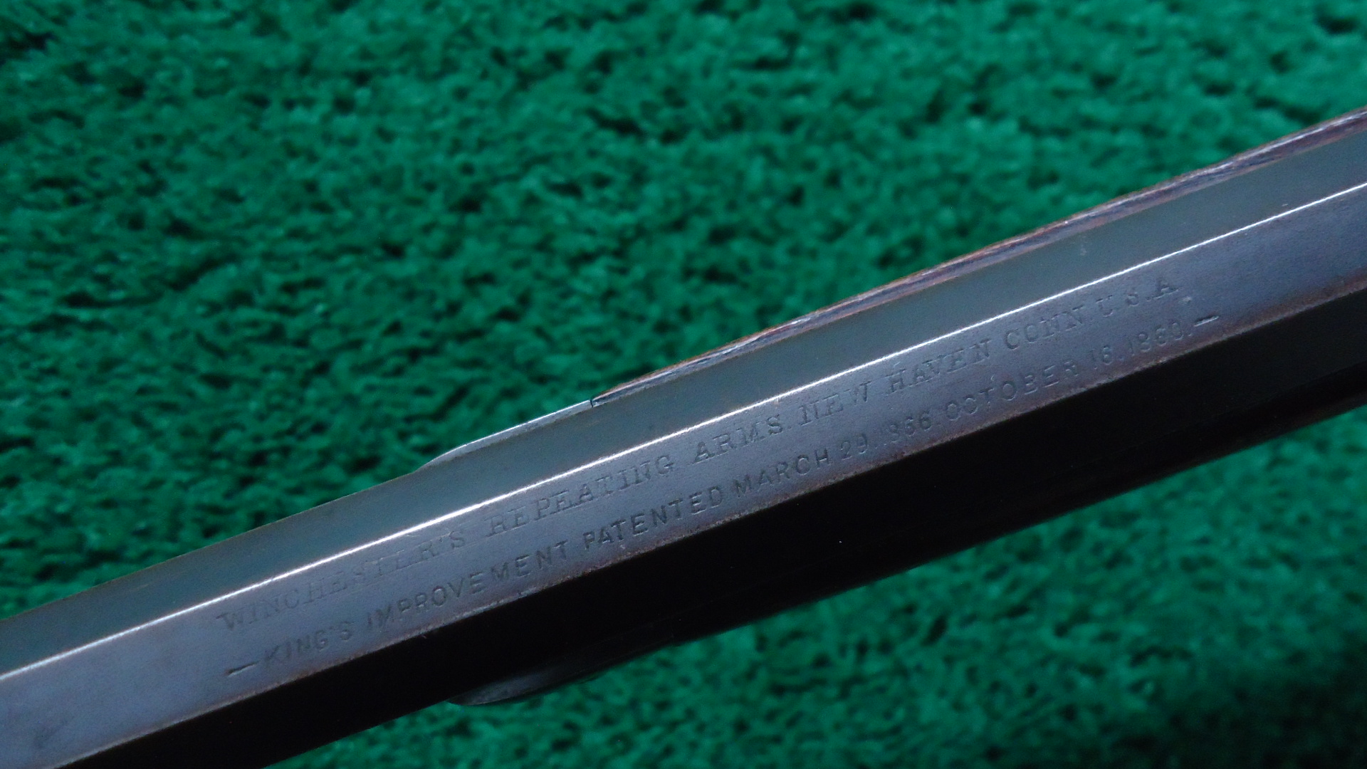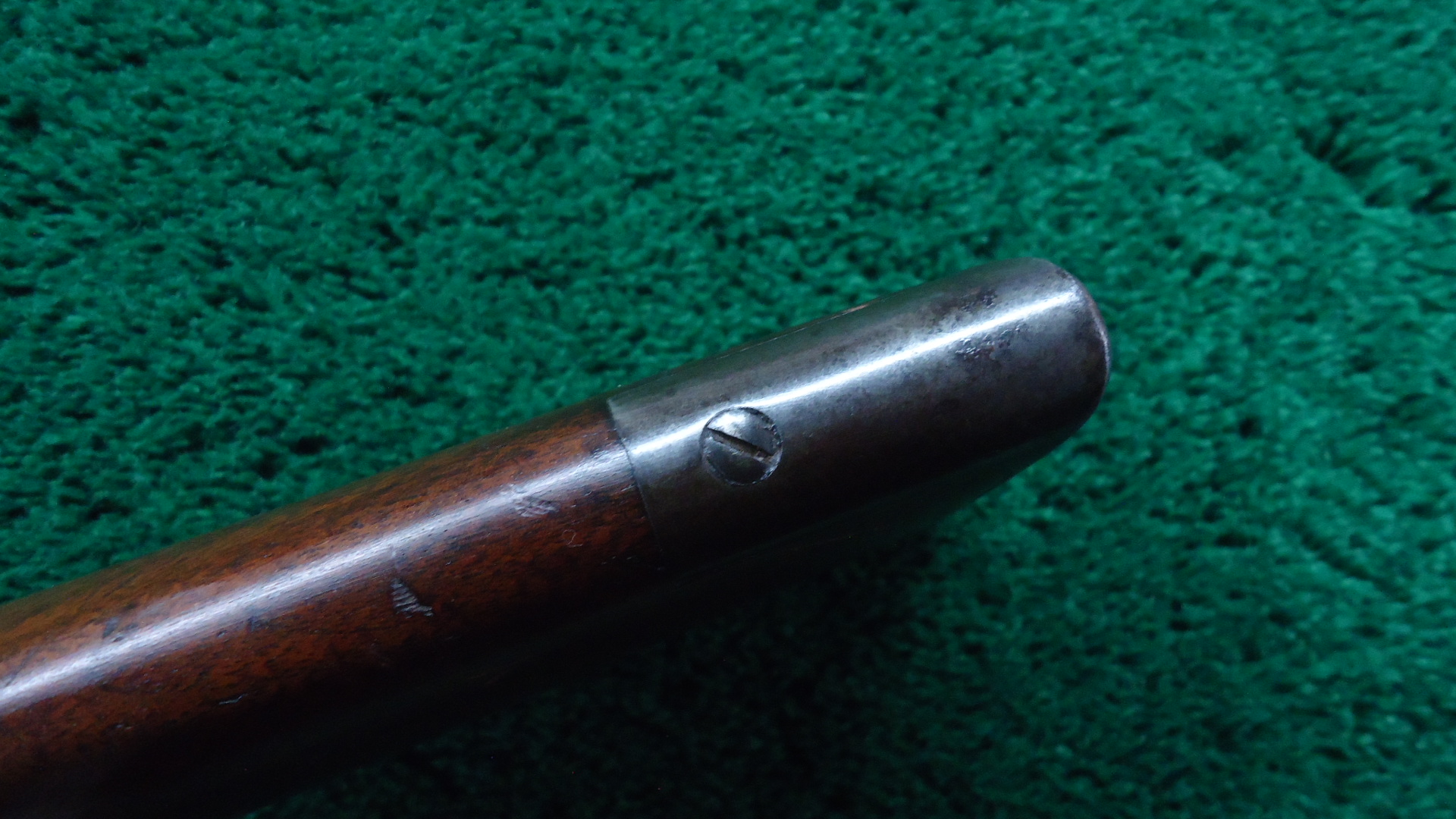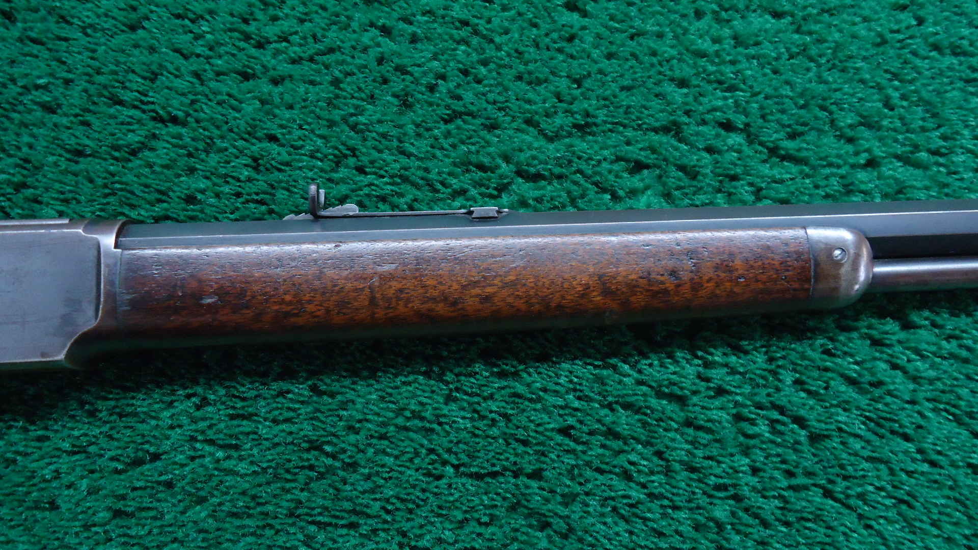 W4414 WINCHESTER MODEL 1873 RIFLE WITH 32 INCH BARREL IN 32 WCF; Special order 32 inch extra length octagon barrel chambered in 32 WCF caliber with a good bore. Sights include a German silver blade front with a typical sporting rear. Barrel retains most original thinning blue toning to plum in areas. Full length magazine tube with two hangers is a plum/brown with good blue in the protected areas. Receiver has thinning blue with splotches of light surface spotting/oxidation. There are faint traces of case colors on the hammer and lever as well as traces of niter blue on the loading gate. The re-oiled walnut stock set is in very good condition with numerous scattered minor dings and scratches. Crescent rifle style buttplate. Mechanically excellent. Made in 1890. Factory letter included. This rifle is an example of a Winchester Model 1873 rifle that was special ordered with the extra length 32 inch octagon barrel but the barrel length is not mentioned in the factory records. The rifle shows no evidence of the barrel ever being off the gun. I can only assume the lack of mention was an oversight by the factory. Everything appears to be as it left the factory. These 32 inch 1873’s don’t come up for sale very often. A rare gun that is sure to fill a hole in your collection!