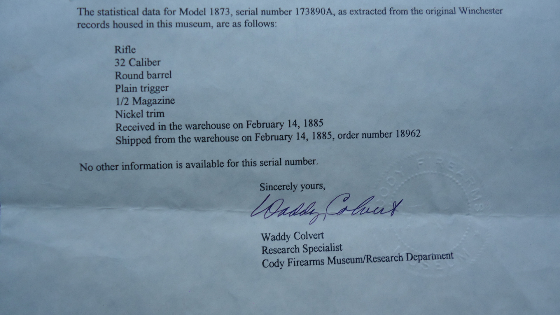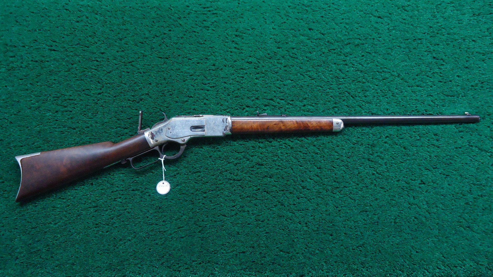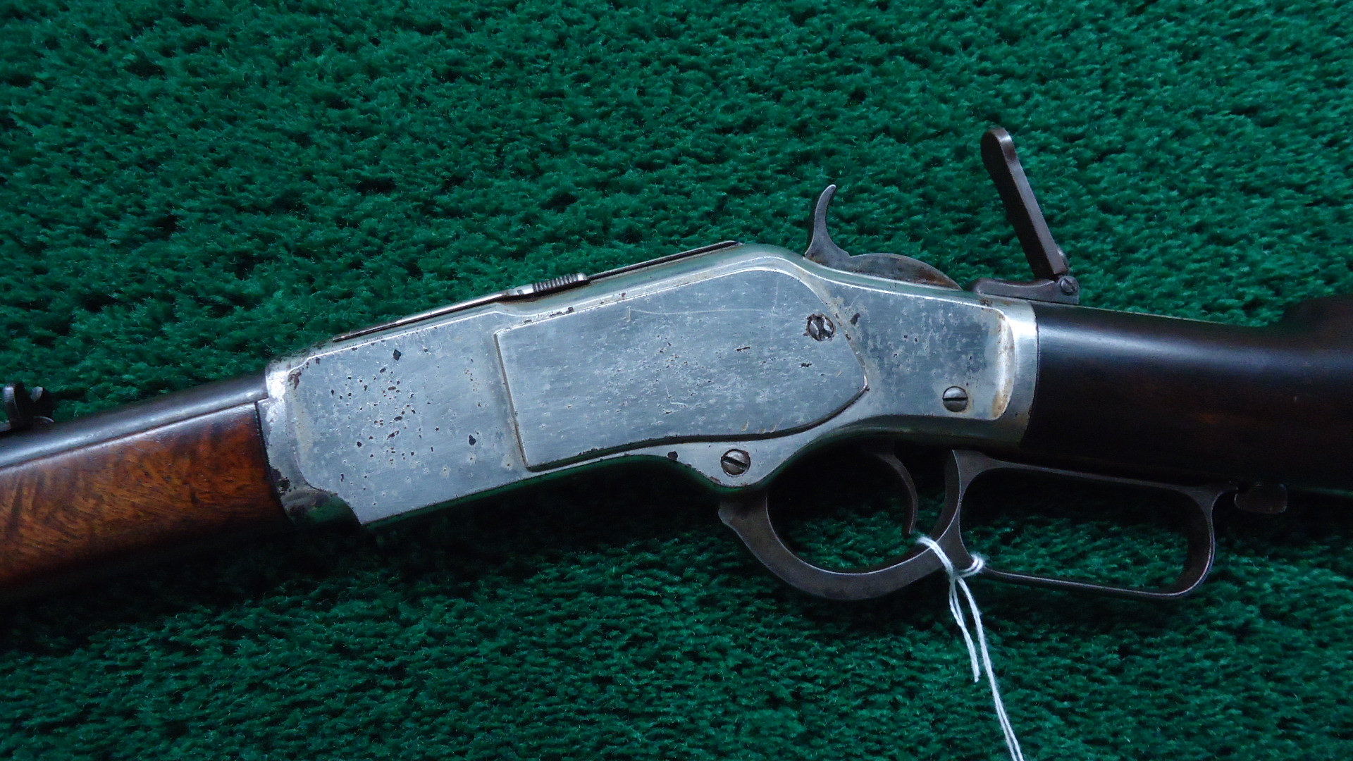 W4418 SPECIAL ORDER WINCHESTER MODEL 1873 HALF NICKEL RIFLE IN 32-20; 24 inch round barrel shows a good deal of the original finish turning to a deep brown. The bore is very good, fairly bright and shiny with decent rifling showing just limited light pitting. Sights include original No. 21 sporting front and No. 22 sporting rear along with an added rare Winchester 1873 No. 62B tang sight. Half length button magazine. Fore-end cap, receiver, carrier, dust cover and crescent rifle buttplate show about 70% original nickel finish with some flaking and oxidation. Fancy grained walnut forearm with matching straight grip buttstock have been freshened up with the buttstock having a tightly repaired crack on the right side coming off the lower tang. Comes with Factory Letter showing it left the factory in 1885 as a Model 1873 Rifle in 32 Caliber with a Plain trigger and a 1/2 Magazine with Nickel trim for order number 18962.