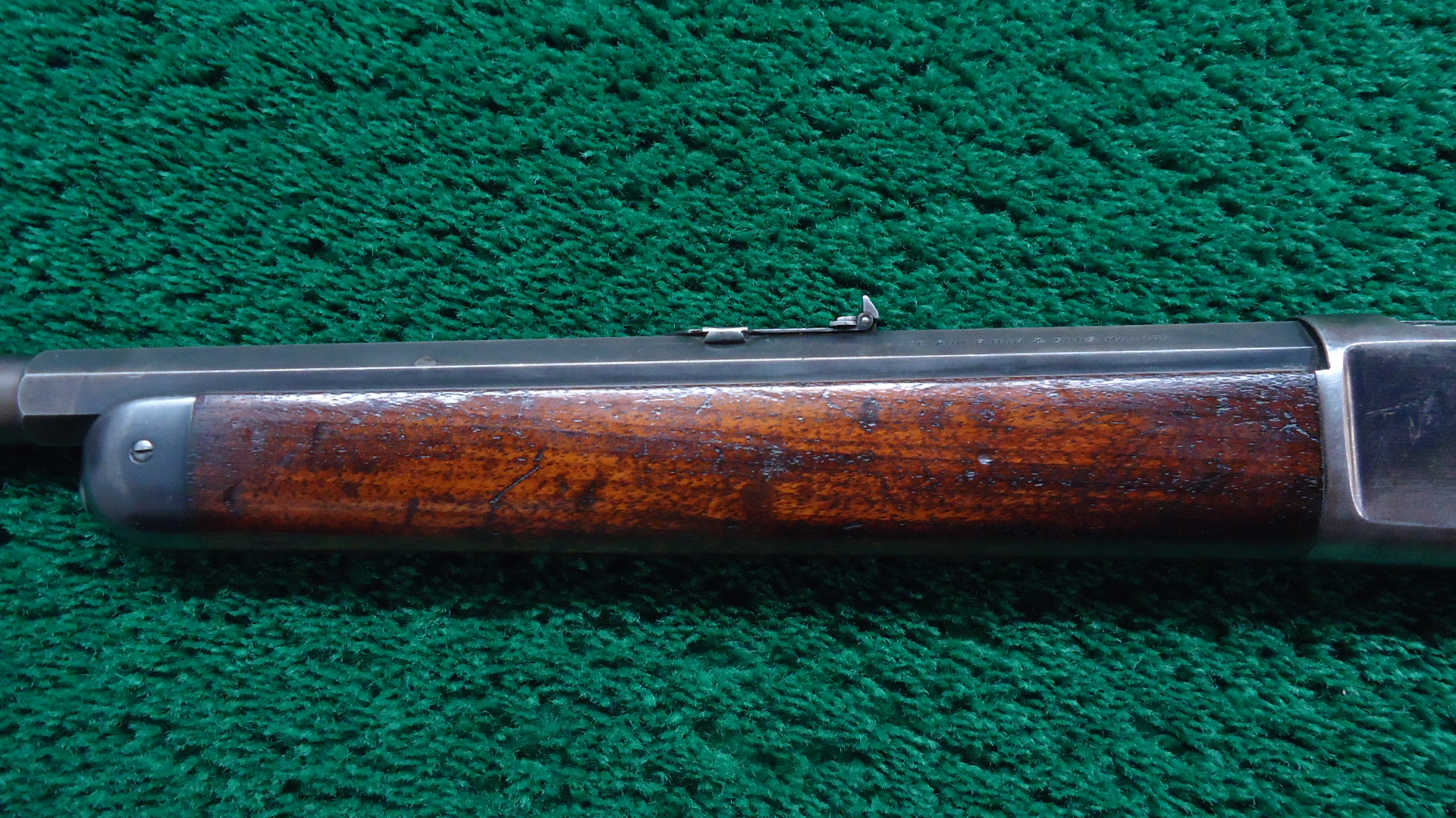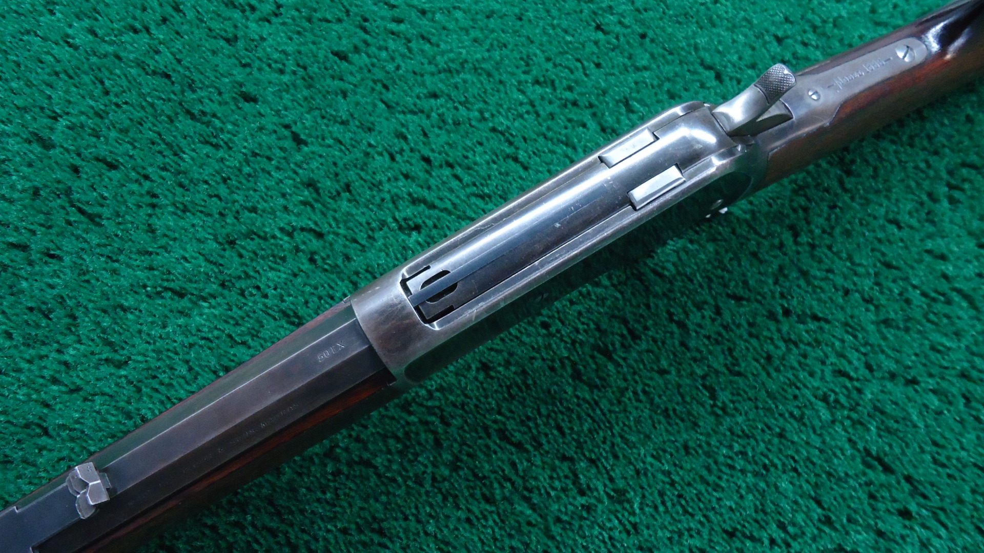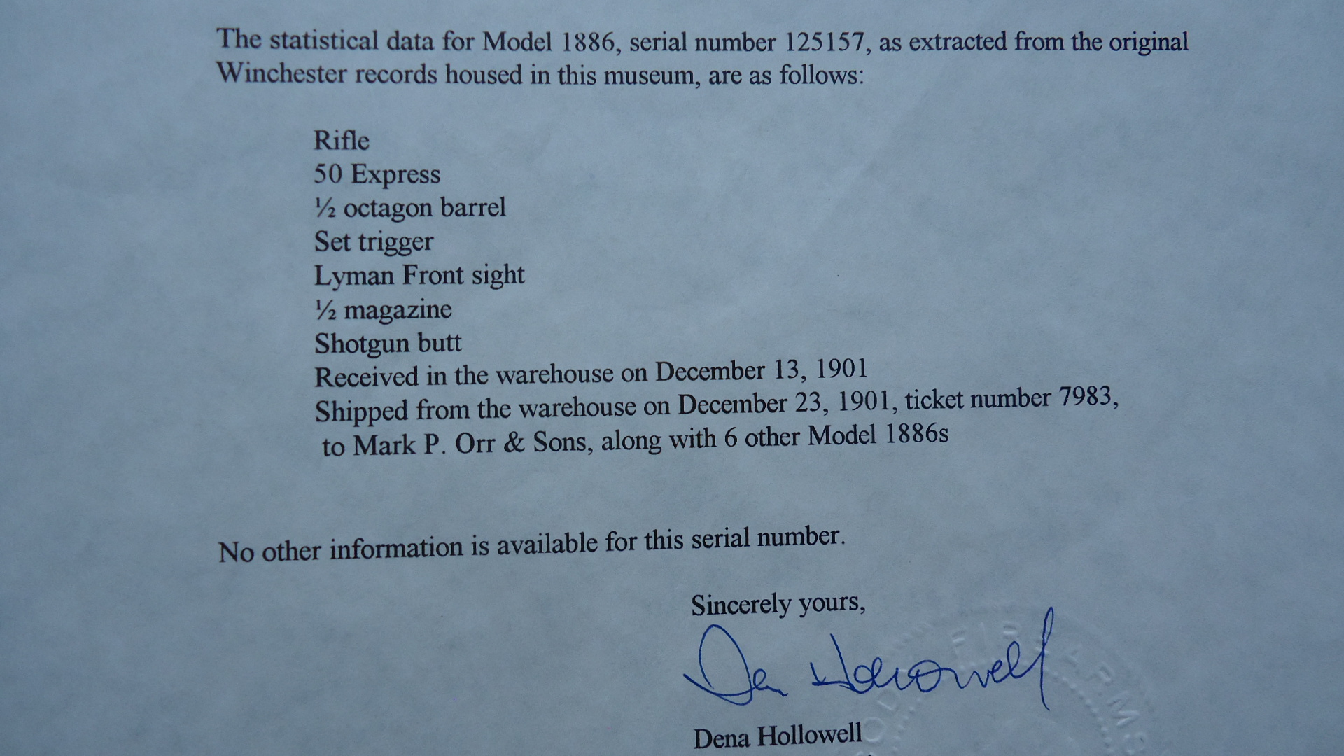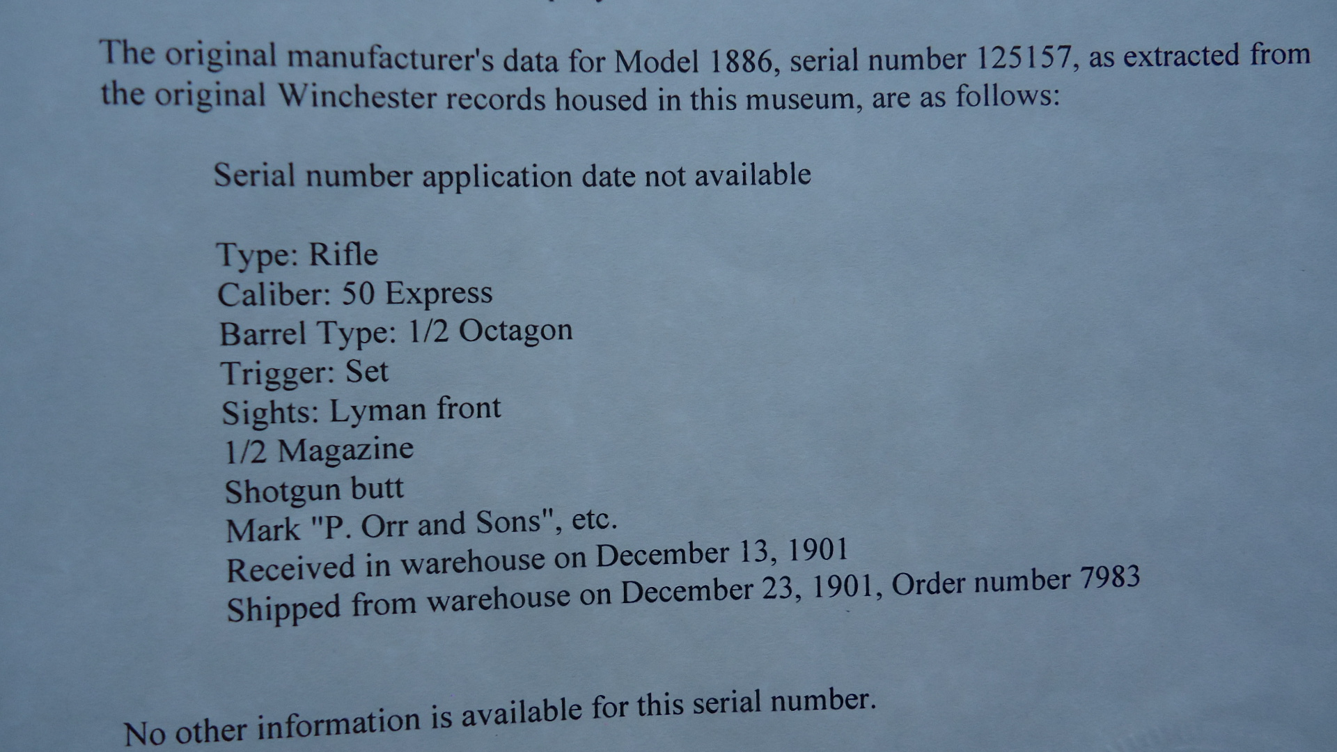 W4425 SPECIAL ORDER WINCHESTER MODEL 1886 RIFLE IN CALIBER 50 EXPRESS; Features include a 26 inch 1/2 octagon barrel marked “MADE FOR P.ORR & SONS. MADRAS.” and “50 EX”. 1/2 length tube magazine. No. 21 Sporting front sight with a nickel silver blade and a 3 Leaf Express rear. Double set trigger. Plain walnut forearm with matching straight grip butt stock fitted with a flat steel shotgun style buttplate. It is in fine condition overall with the barrel and receiver retaining about 40% original blue finish with the balance having thinned to a smooth brown or grey patina. Hammer and lever show strong traces of the original case colors and the loading gate faint traces of original nitre blue. The wood is also fine with minor dings and scratches. Mechanically excellent. Comes with Factory Letter showing it to be 1 of 7 Model 1886’s shipped to a high end retailer in India, P. Orr & Sons to be marketed to sportsmen looking to hunt dangerous game. The firm was established by Scotsman Peter Orr in 1846 in Madras, India, and it was primarily known as a retailer of luxury items, similar to the American firm Tiffany & Co.
