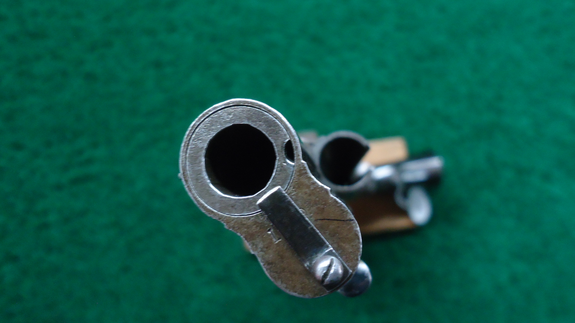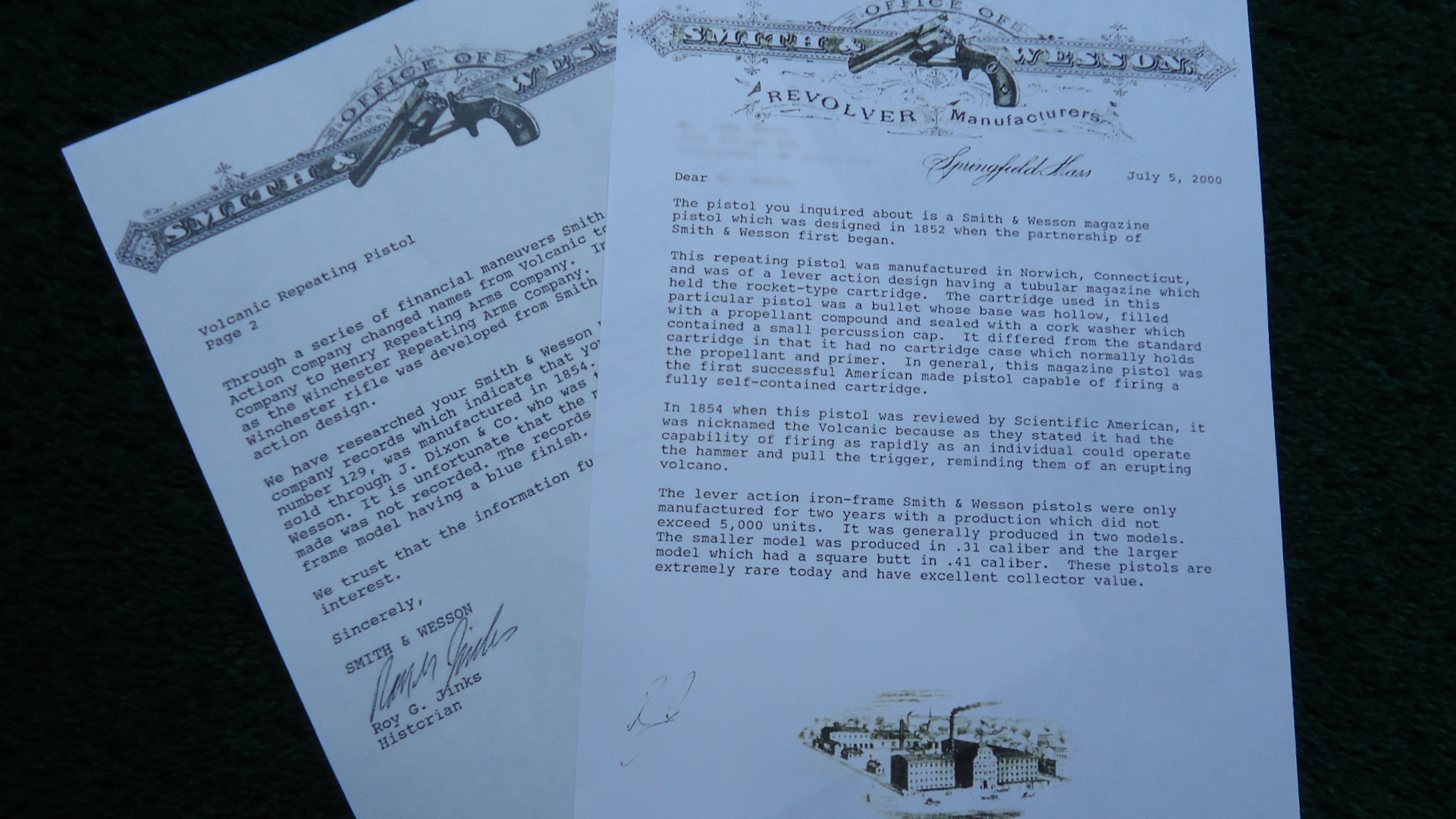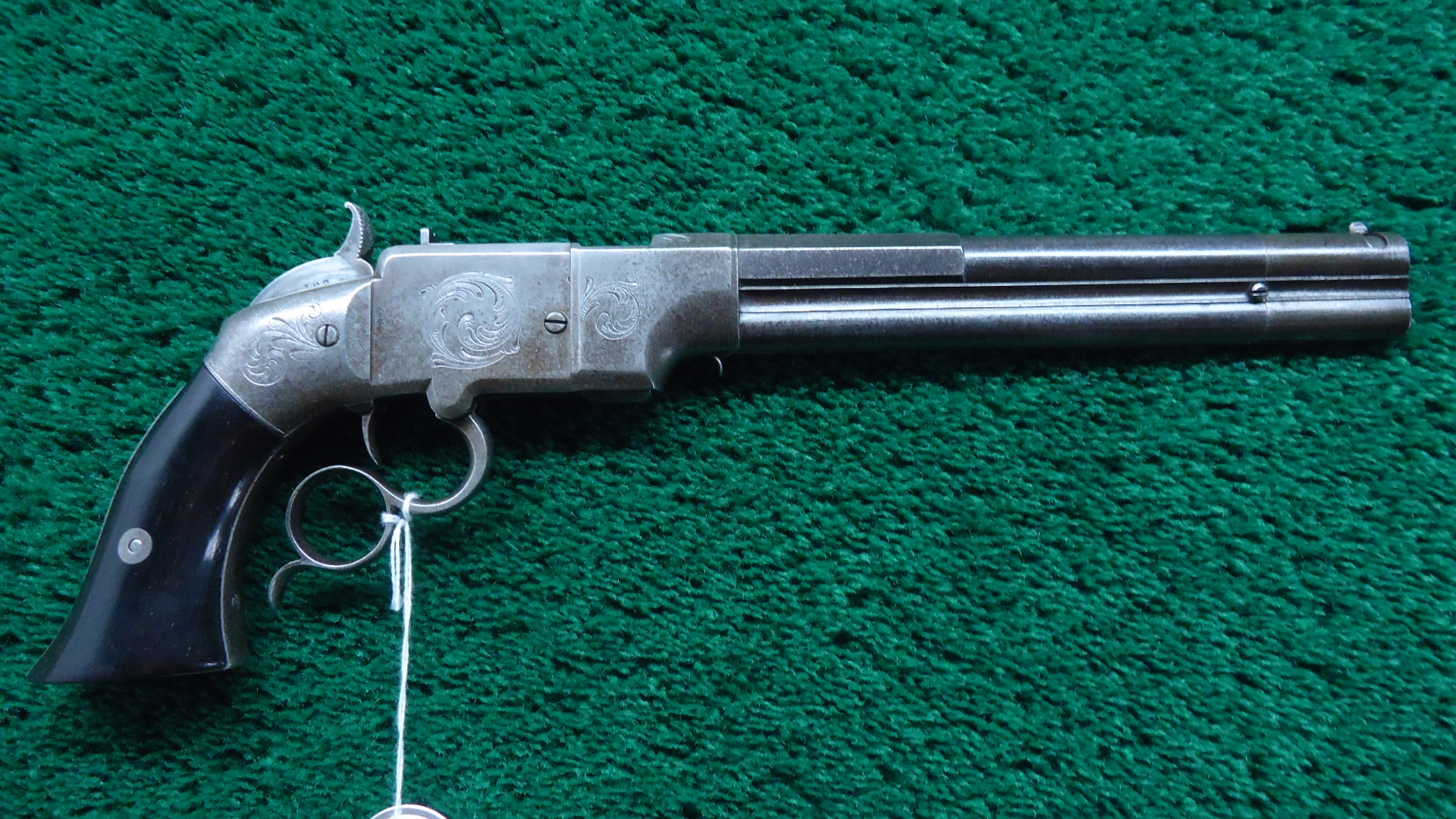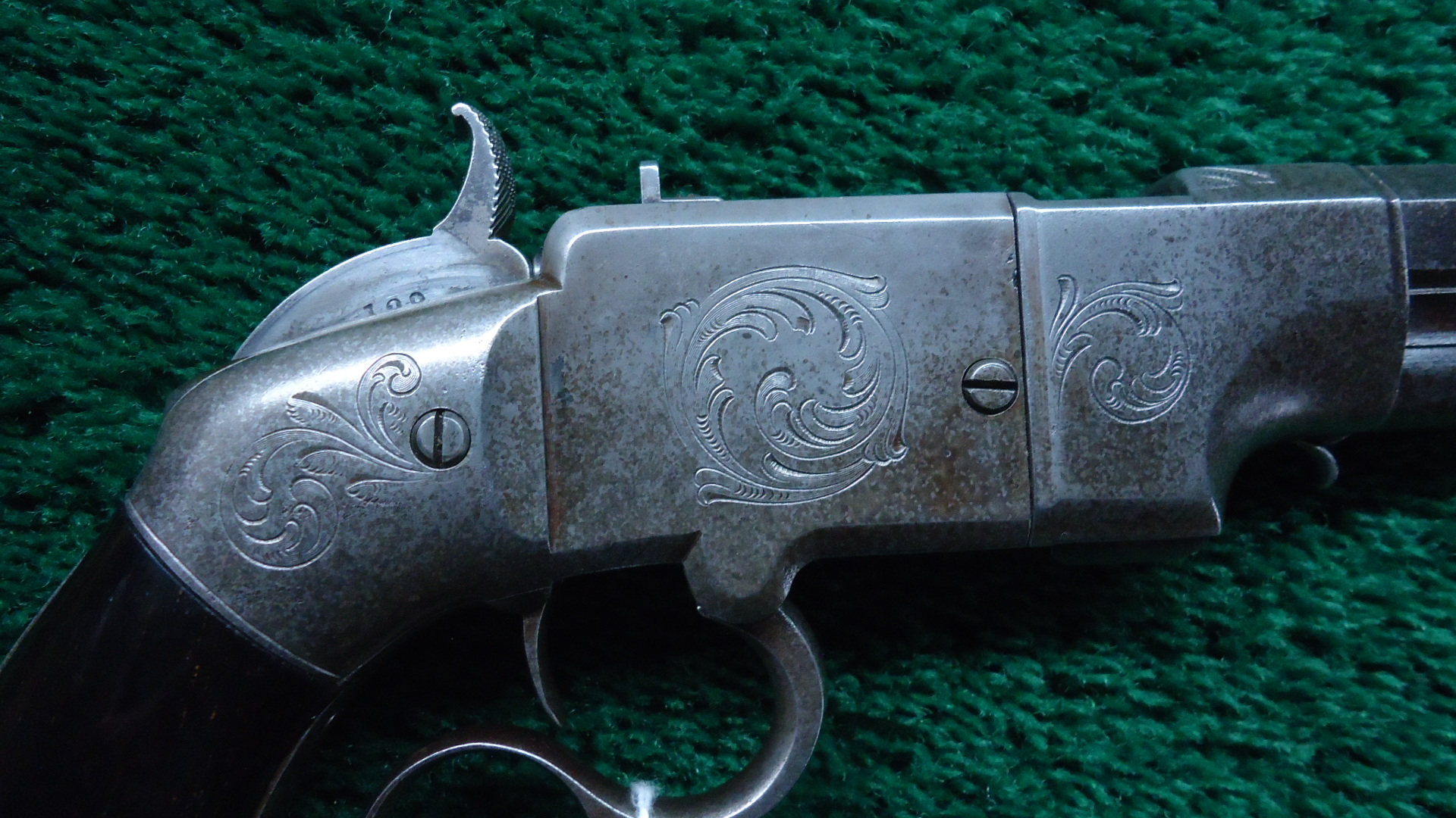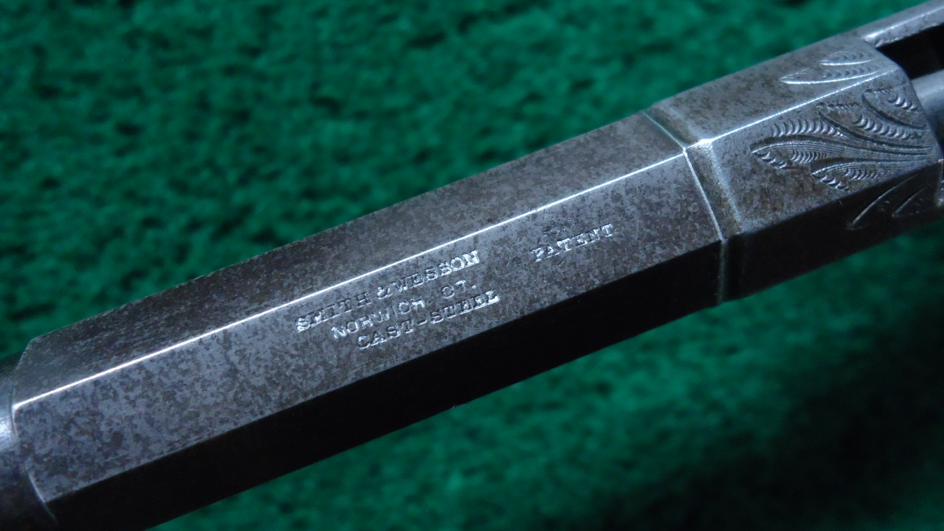 W4430 FACTORY ENGRAVED SMITH & WESSON NO. 2 LARGE FRAME PISTOL IN 41 CALIBER; This very scarce factory engraved early production serial number 129 large frame No. 2 Volcanic lever action pistol has an 8 inch part octagon barrel chambered in 41 caliber and has a good bore with defined rifling. Also has the distinctive “Type I” features which include an uncrowned flat muzzle with flat front magazine locking spring retained by a screw at its bottom and one carrier block spring screw on the bottom of the frame. The top of the barrel is stamped with the “SMITH &WESSON/NORWICH. CT./CAST-STEEL” ahead of “PATENT”. Integral 10-shot magazine below the barrel. Sights include a blade front and a screw-fastened notch rear. Barrel and magazine tube assembly have a smooth gray and brown patina. The factory engraved iron frame has an attractive aged finish and scroll engraving. Varnished Rosewood grips are very good as refinished with some light handling mars. Action functions properly. This Smith & Wesson Volcanic pistol was manufactured in 1854. Fewer than 500 of these .41 caliber large frame No. 2 Volcanic pistols between 1854-1855. Surviving examples of these early Smith & Wesson Volcanic pistols are scarce and extremely desirable in any condition as part of the beginning of the development of lever action repeaters that evolved into the Henry and Winchester rifles and they also mark the very beginning of Smith & Wesson and have excellent collector value.