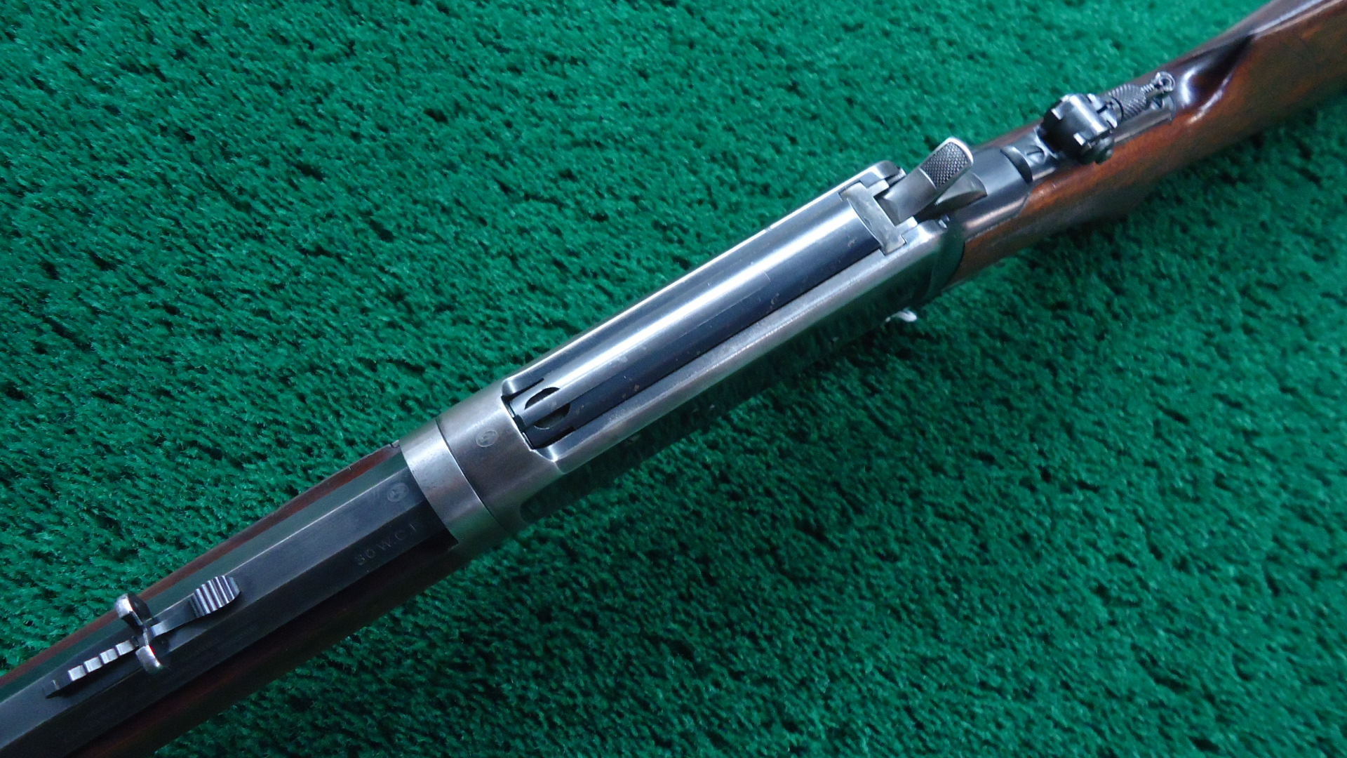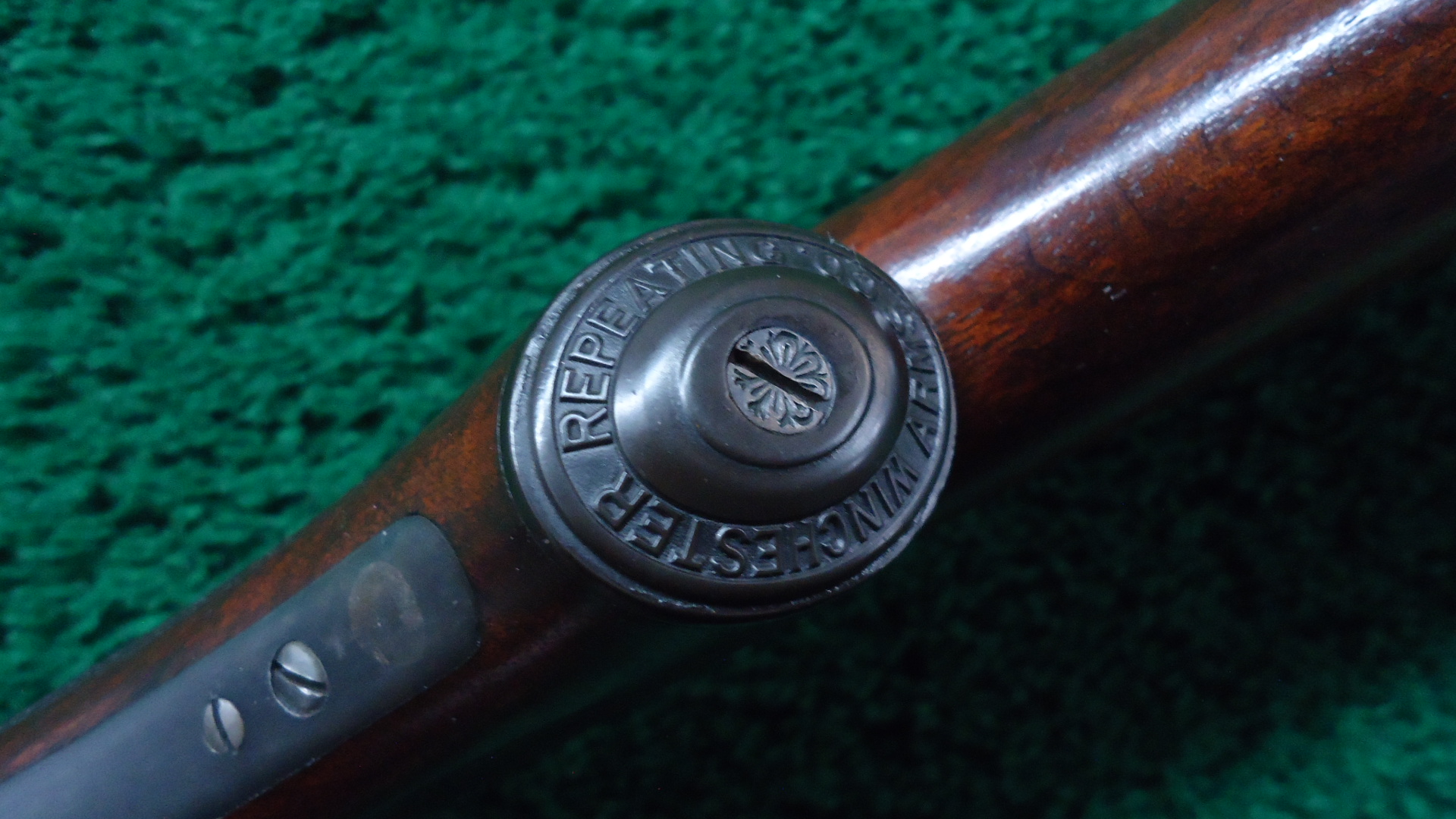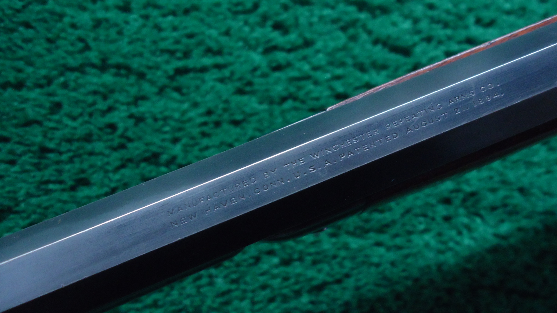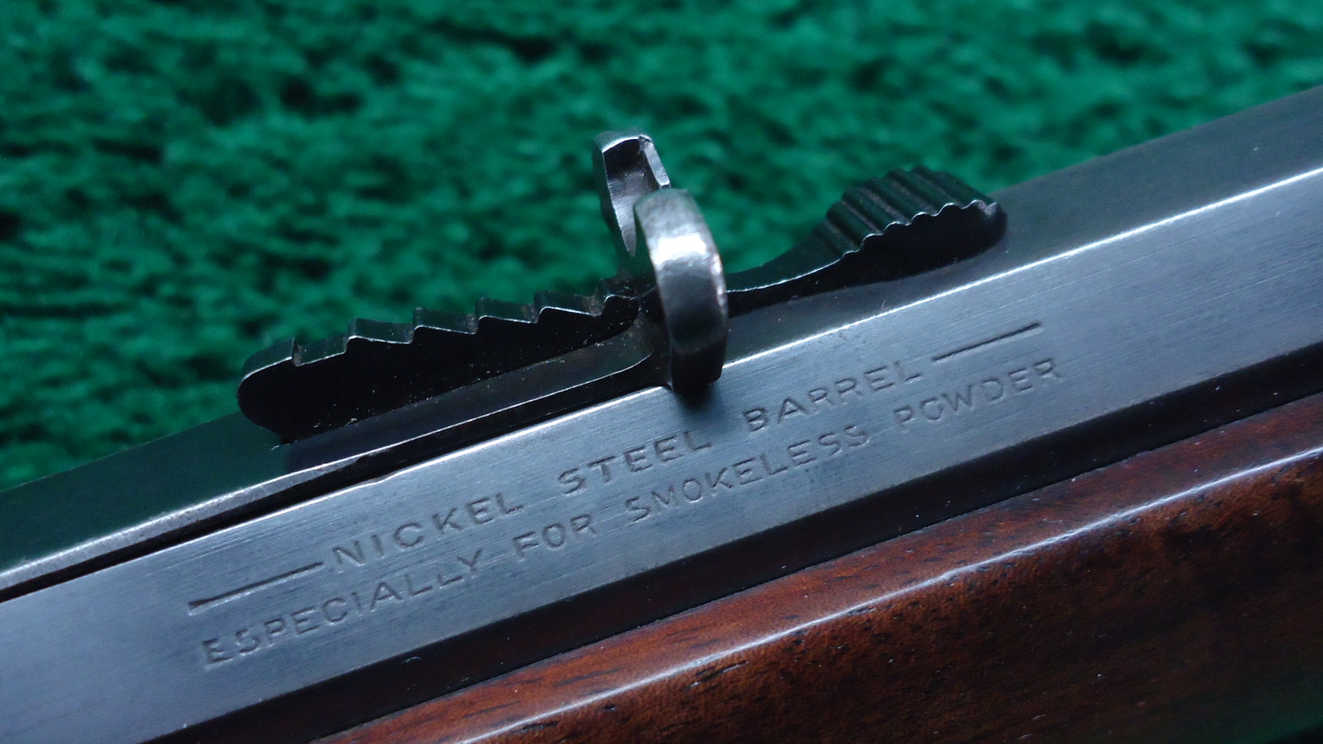 W4435 WINCHESTER MODEL 1894 SEMI-DELUXE RIFLE IN 30 WCF; 26 inch full octagon barrel chambered in 30 WCF caliber with a bright shiny excellent bore. Most all thinning barrel blue remains. Sights include a Marble’s beaded globe “Improved” front with a No. 24 notch rear and a Lyman combination peep folding tang sight. Special order half length magazine with Takedown. Receiver also retains most of it’s bright glossy blue finish with some wear to the upper left side and around the Takedown collar. Real good traces of case color on the hammer and lever. Crisp functioning action. Checkered forearm and pistolgrip stock with hard rubber grip cap look good with only minor handling mars and checkered steel shotgun buttplate. Sling swivels present. These “Semi-Deluxe” Model 1894’s are scarce and hard to find in fine condition. This one was manufactured in 1909.