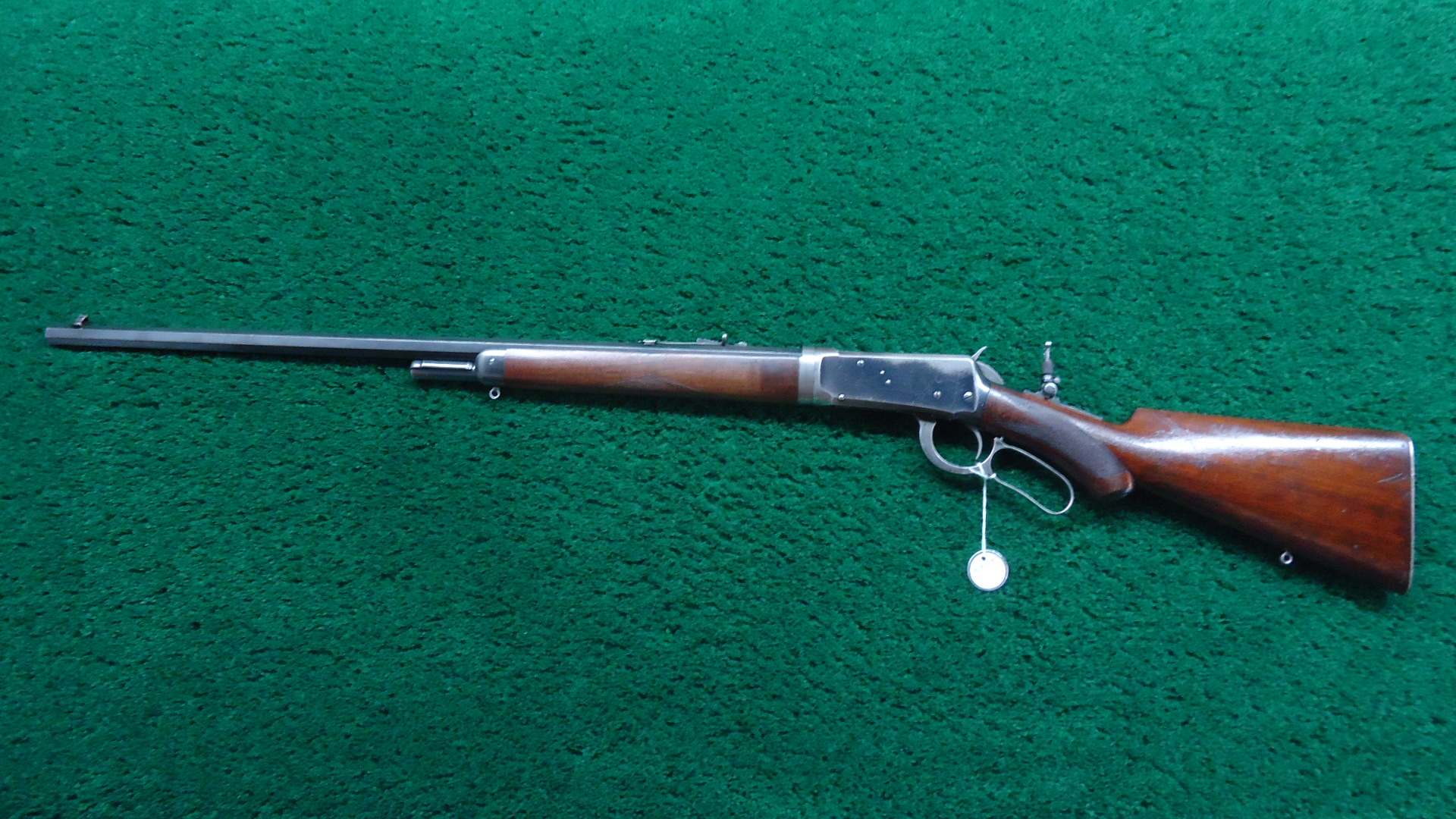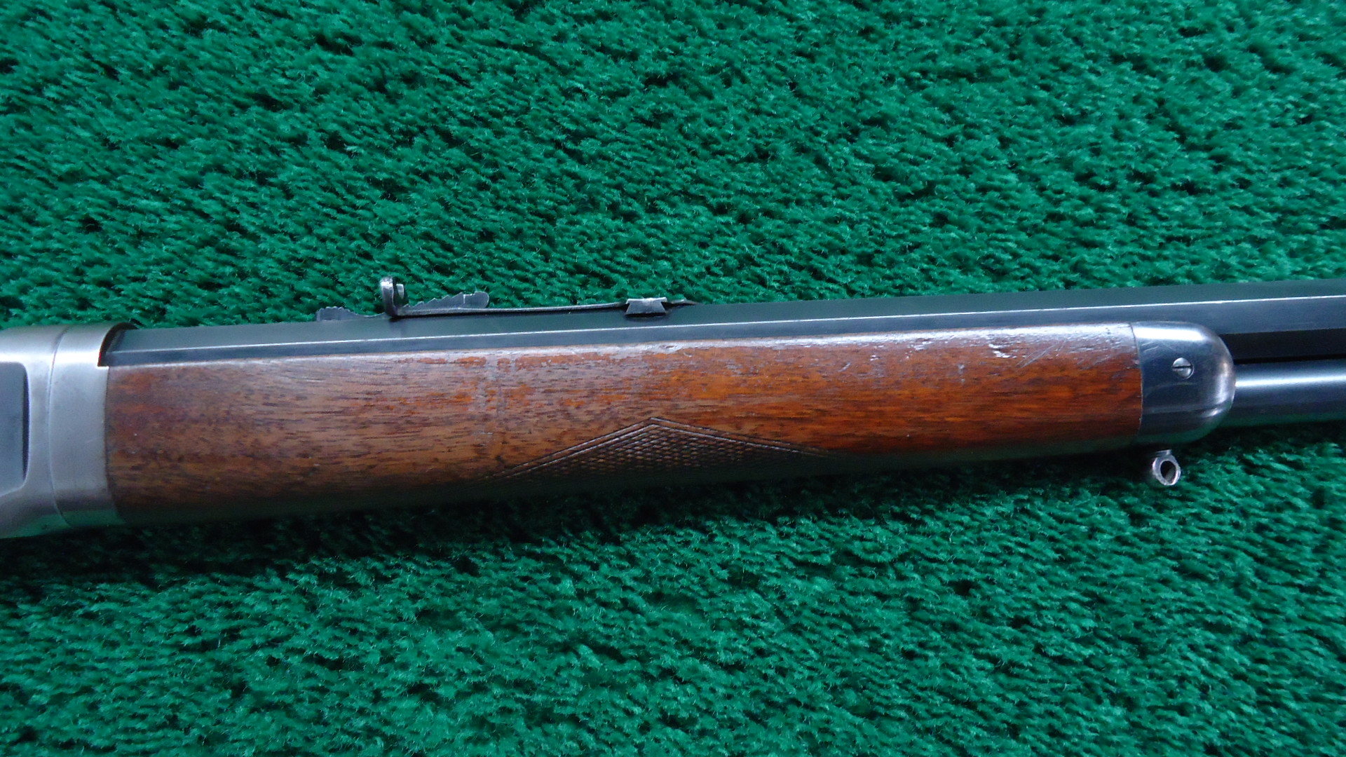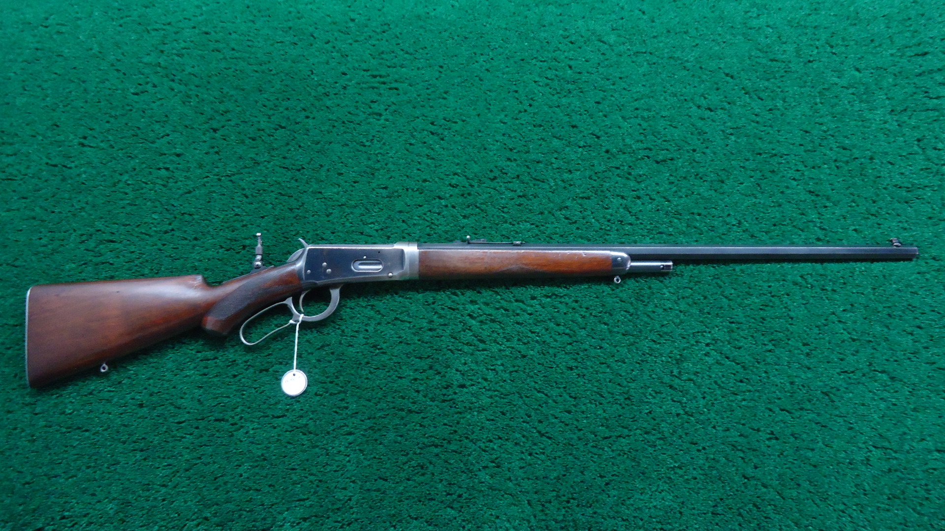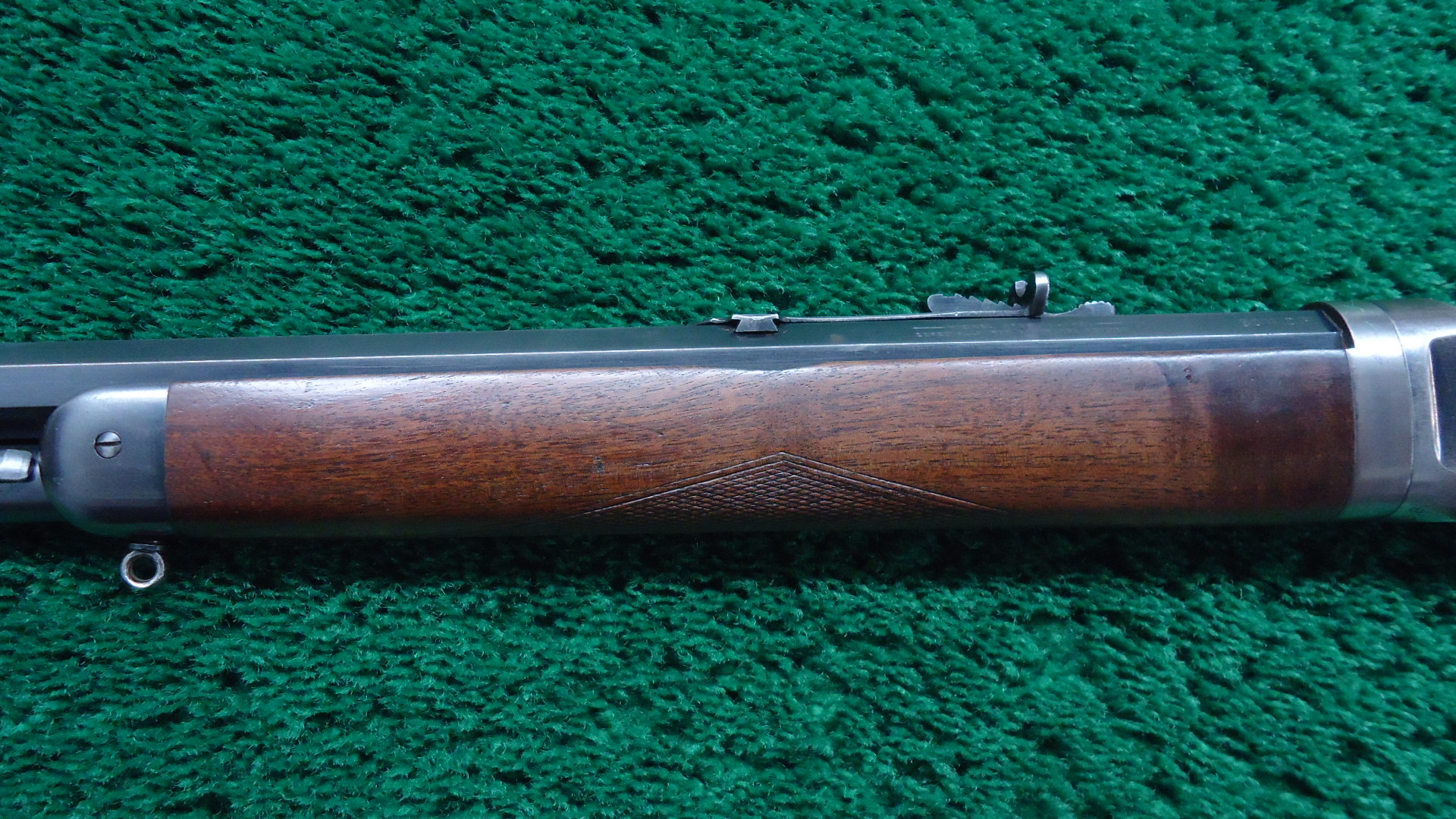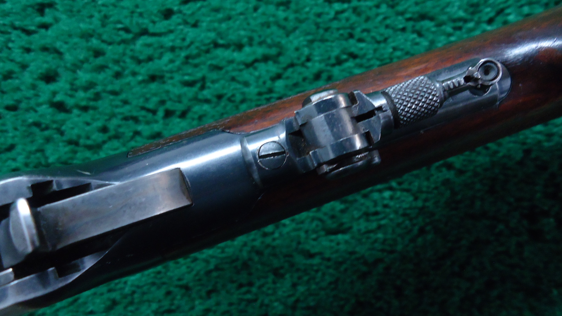W4435 WINCHESTER MODEL 1894 SEMI-DELUXE RIFLE IN 30 WCF; 26 inch full octagon barrel chambered in 30 WCF caliber with a bright shiny excellent bore. Most all thinning barrel blue remains. Sights include a Marble’s beaded globe “Improved” front with a No. 24 notch rear and a Lyman combination peep folding tang sight. Special order half length magazine with Takedown. Receiver also retains most of it’s bright glossy blue finish with some wear to the upper left side and around the Takedown collar. Real good traces of case color on the hammer and lever. Crisp functioning action. Checkered forearm and pistolgrip stock with hard rubber grip cap look good with only minor handling mars and checkered steel shotgun buttplate. Sling swivels present. These “Semi-Deluxe” Model 1894’s are scarce and hard to find in fine condition. This one was manufactured in 1909.