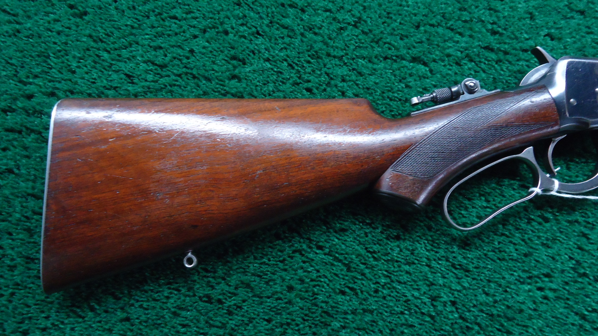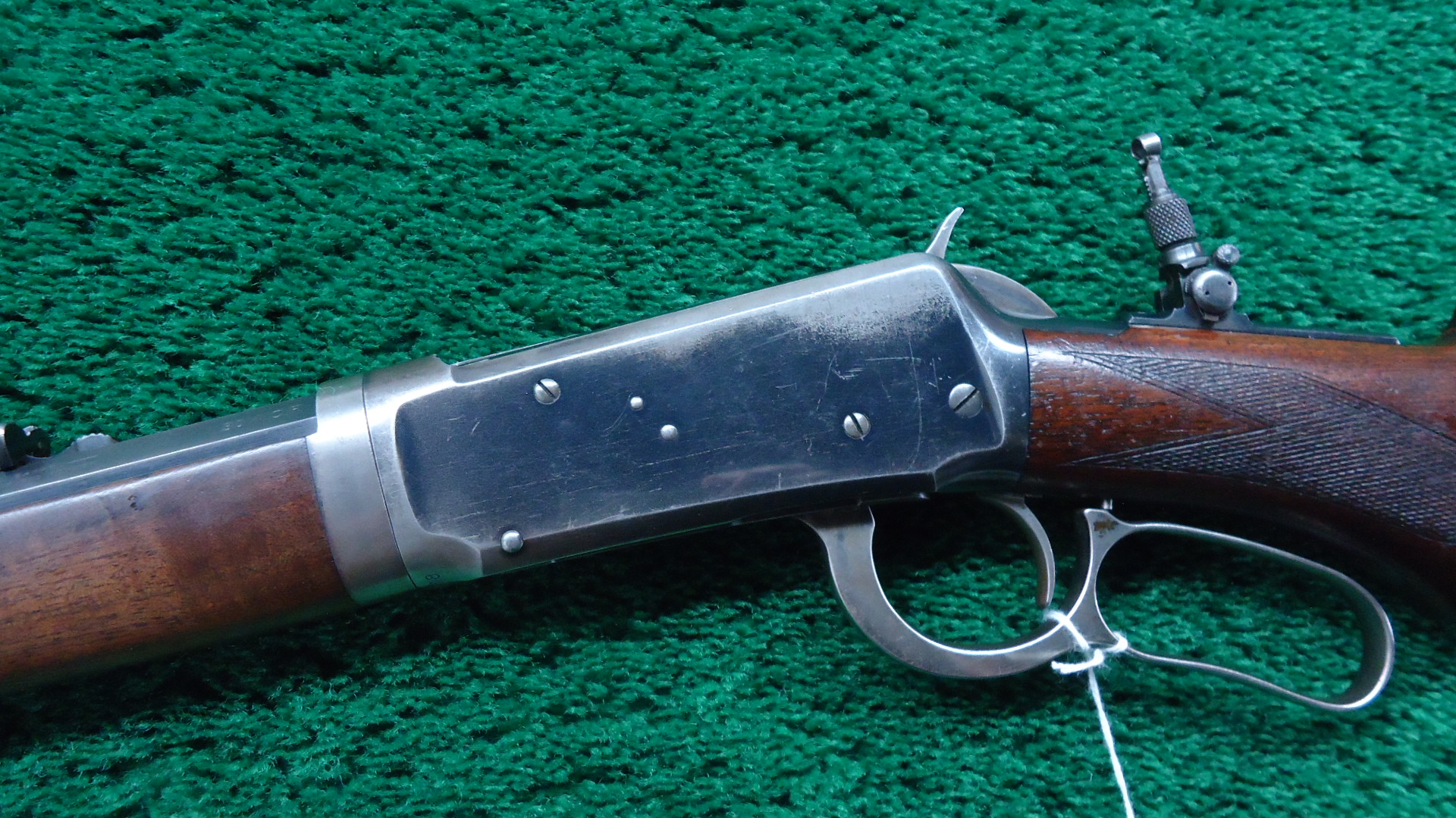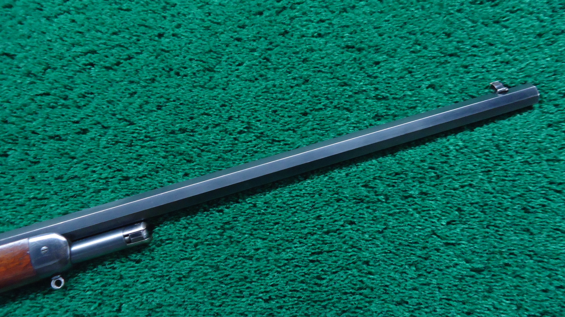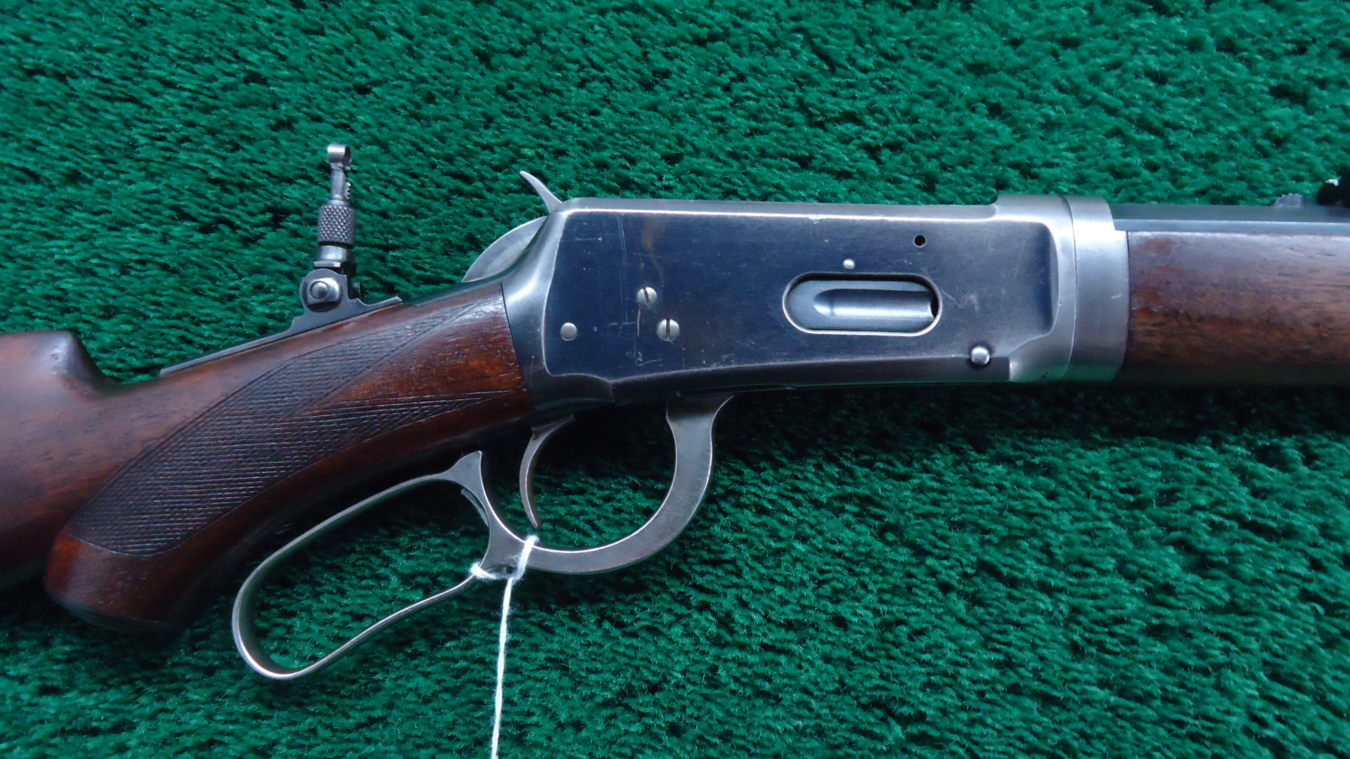 W4435 WINCHESTER MODEL 1894 SEMI-DELUXE RIFLE IN 30 WCF; 26 inch full octagon barrel chambered in 30 WCF caliber with a bright shiny excellent bore. Most all thinning barrel blue remains. Sights include a Marble’s beaded globe “Improved” front with a No. 24 notch rear and a Lyman combination peep folding tang sight. Special order half length magazine with Takedown. Receiver also retains most of it’s bright glossy blue finish with some wear to the upper left side and around the Takedown collar. Real good traces of case color on the hammer and lever. Crisp functioning action. Checkered forearm and pistolgrip stock with hard rubber grip cap look good with only minor handling mars and checkered steel shotgun buttplate. Sling swivels present. These “Semi-Deluxe” Model 1894’s are scarce and hard to find in fine condition. This one was manufactured in 1909.