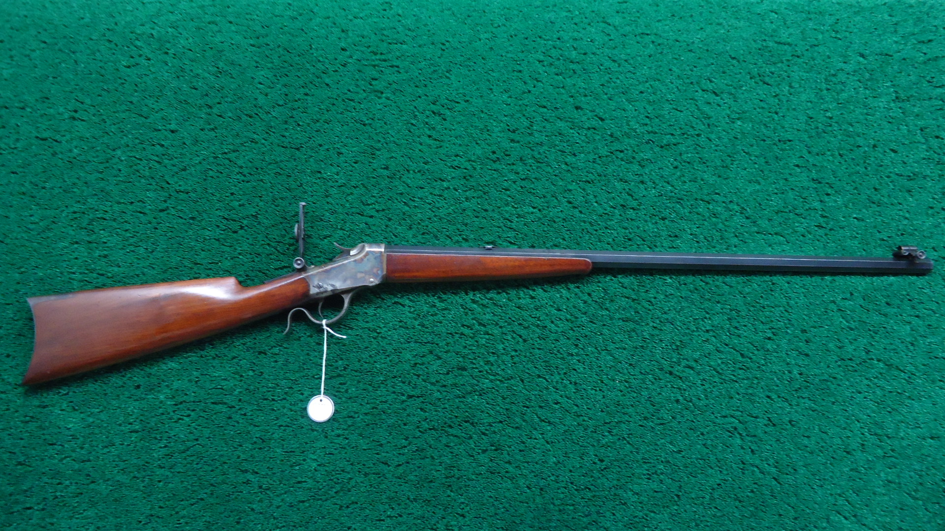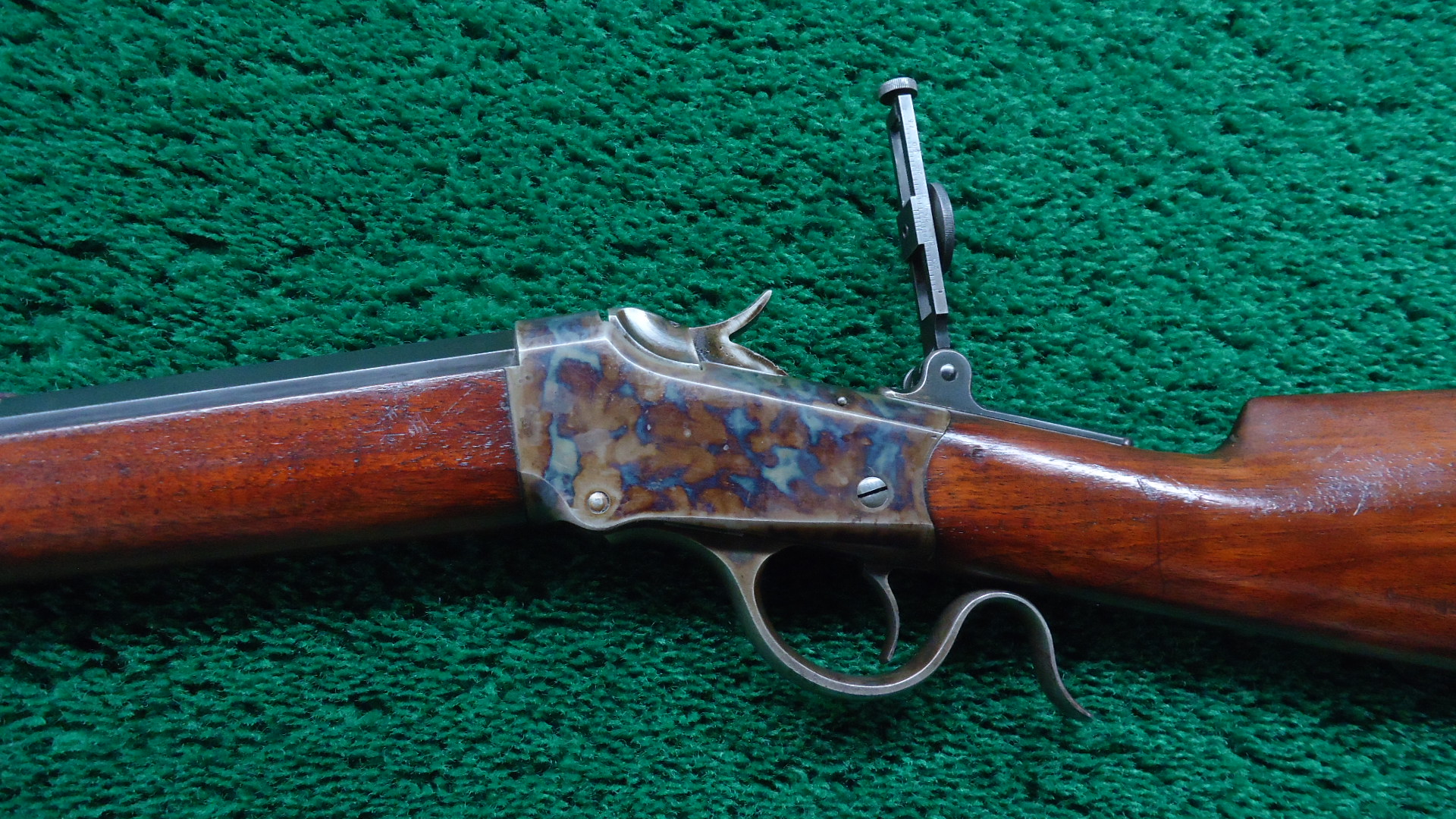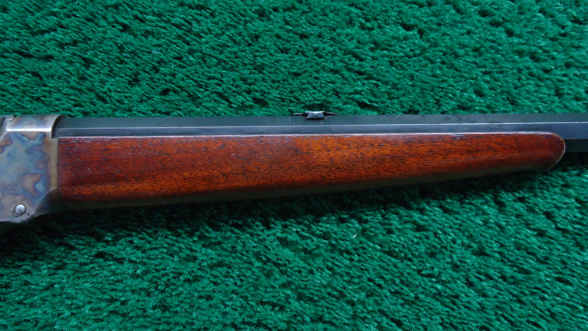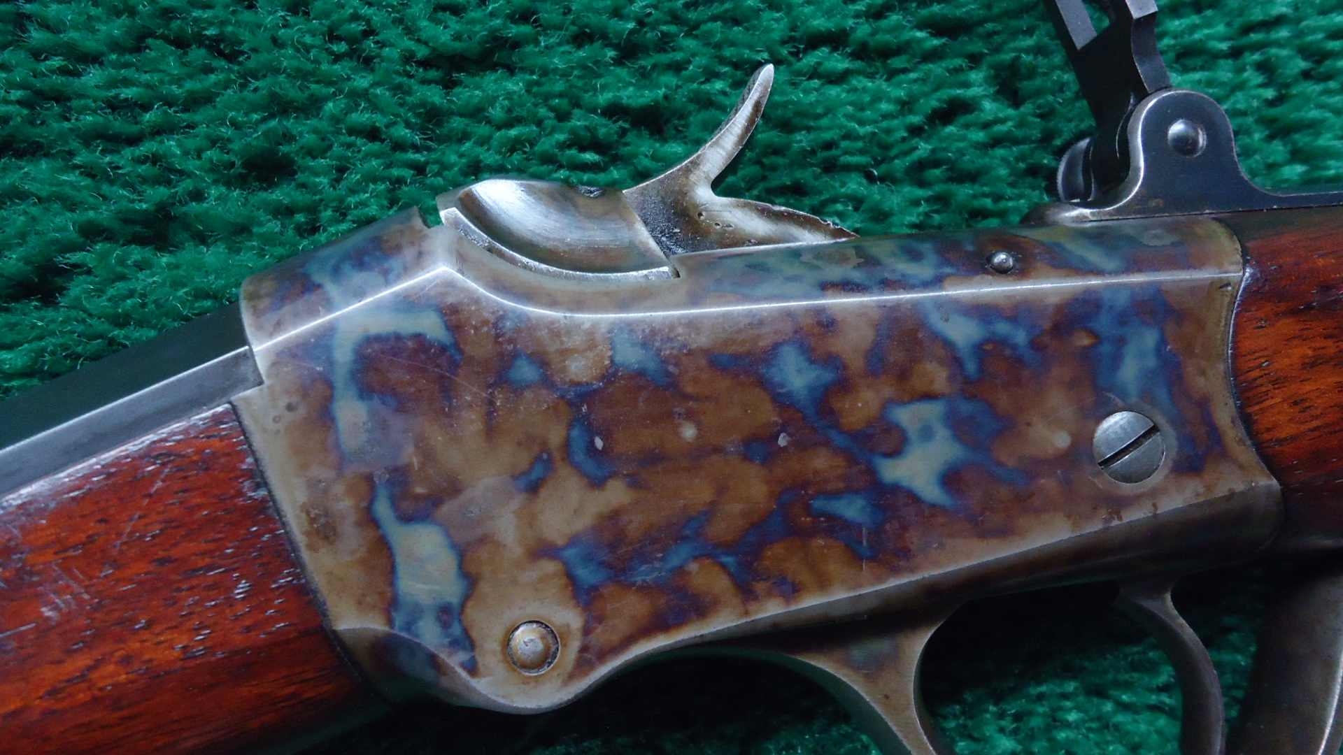 W4443 WINCHESTER MODEL 1885 LOW WALL RIFLE CHAMBERED IN 25 WCF; 28 inch octagon No. 1 weight barrel. Sights include a wind gauge globe front with spirit level, a filler in the rear dovetail and a Mid range vernier peep sight on the tang. Plain walnut forearm with matching straight grip buttstock fitted with a crescent rifle butt plate. Near excellent condition overall with the barrel showing 70% lightly freckled finish with some light pitting at the grip point. Very good bore has a few small patches of light pitting ahead of the chamber and is otherwise bright and shiny with strong rifling. The action shows 70% original case colors with a couple of patches of pitting on the right side. The stocks are solid and full fitting with very little wear and only light handling marks. Manufactured in 1892.
