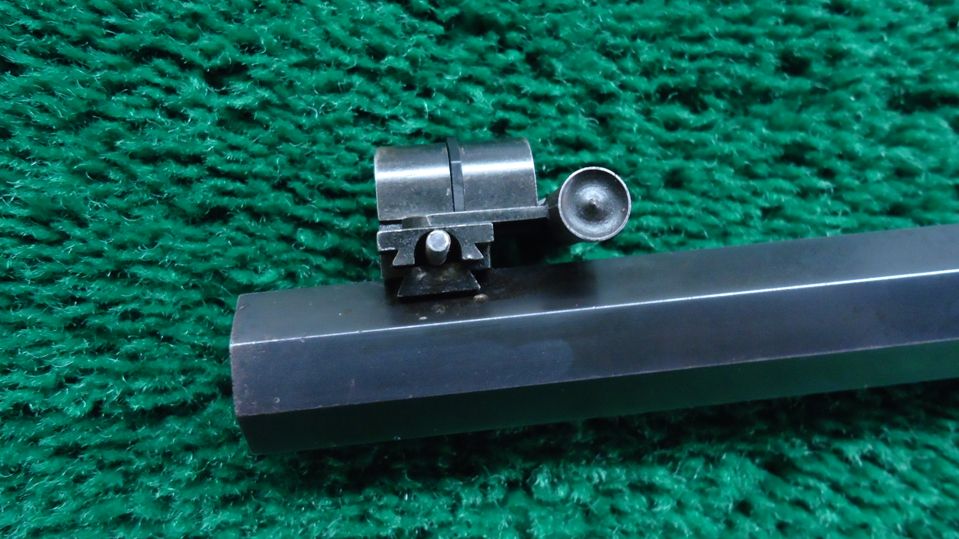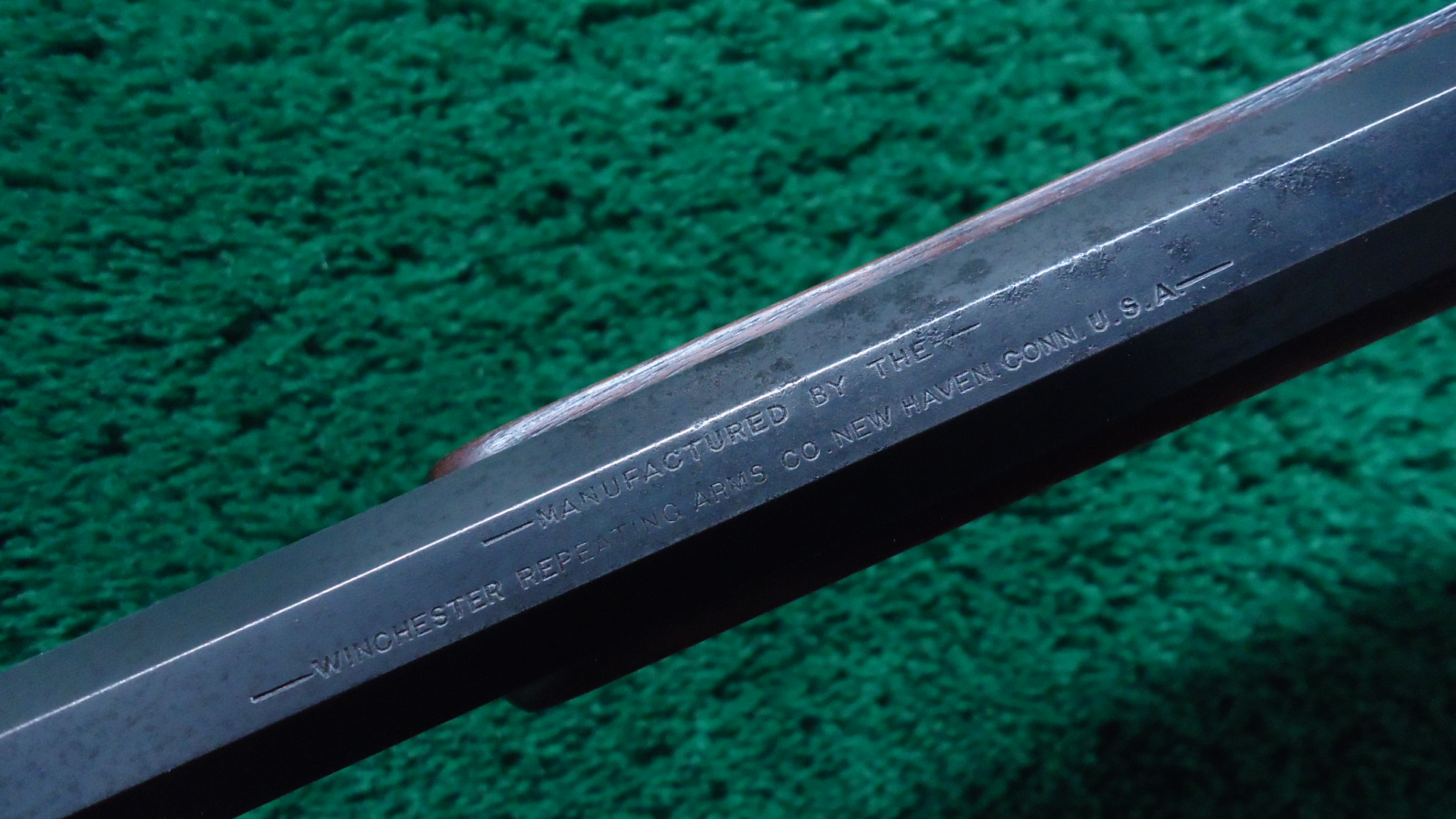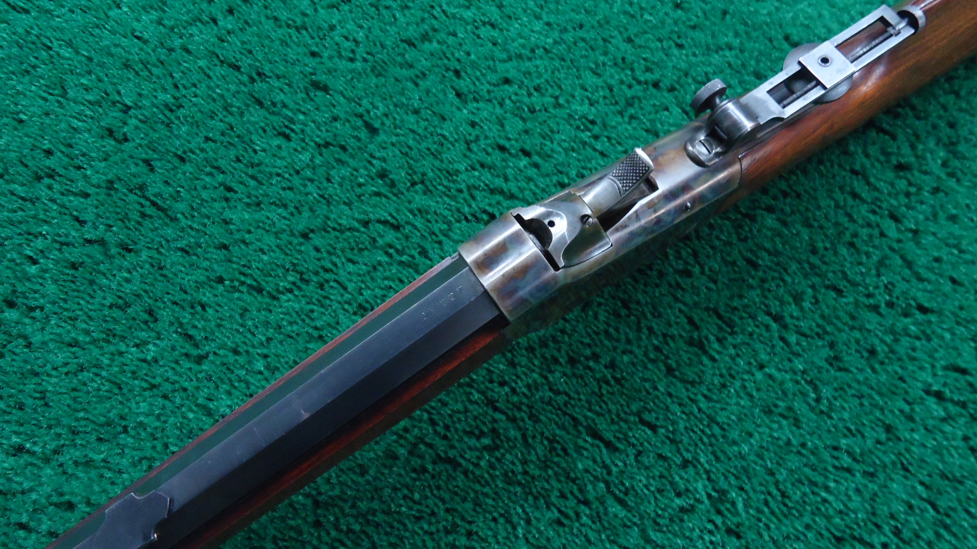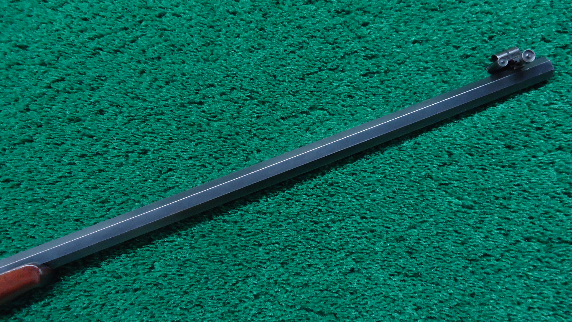 W4443 WINCHESTER MODEL 1885 LOW WALL RIFLE CHAMBERED IN 25 WCF; 28 inch octagon No. 1 weight barrel. Sights include a wind gauge globe front with spirit level, a filler in the rear dovetail and a Mid range vernier peep sight on the tang. Plain walnut forearm with matching straight grip buttstock fitted with a crescent rifle butt plate. Near excellent condition overall with the barrel showing 70% lightly freckled finish with some light pitting at the grip point. Very good bore has a few small patches of light pitting ahead of the chamber and is otherwise bright and shiny with strong rifling. The action shows 70% original case colors with a couple of patches of pitting on the right side. The stocks are solid and full fitting with very little wear and only light handling marks. Manufactured in 1892.