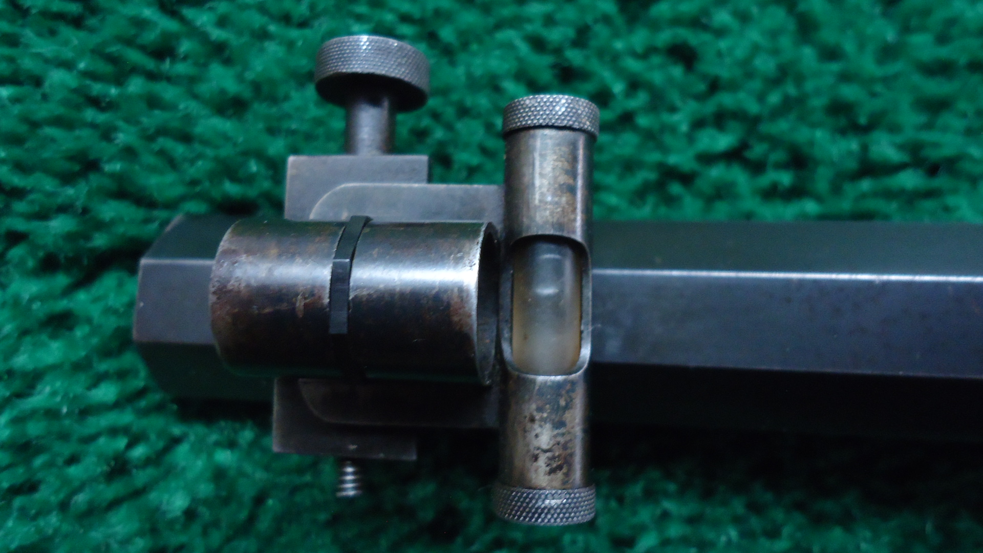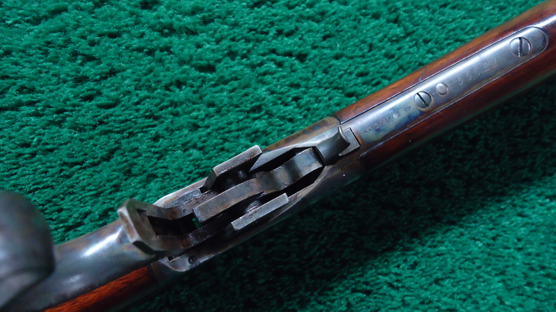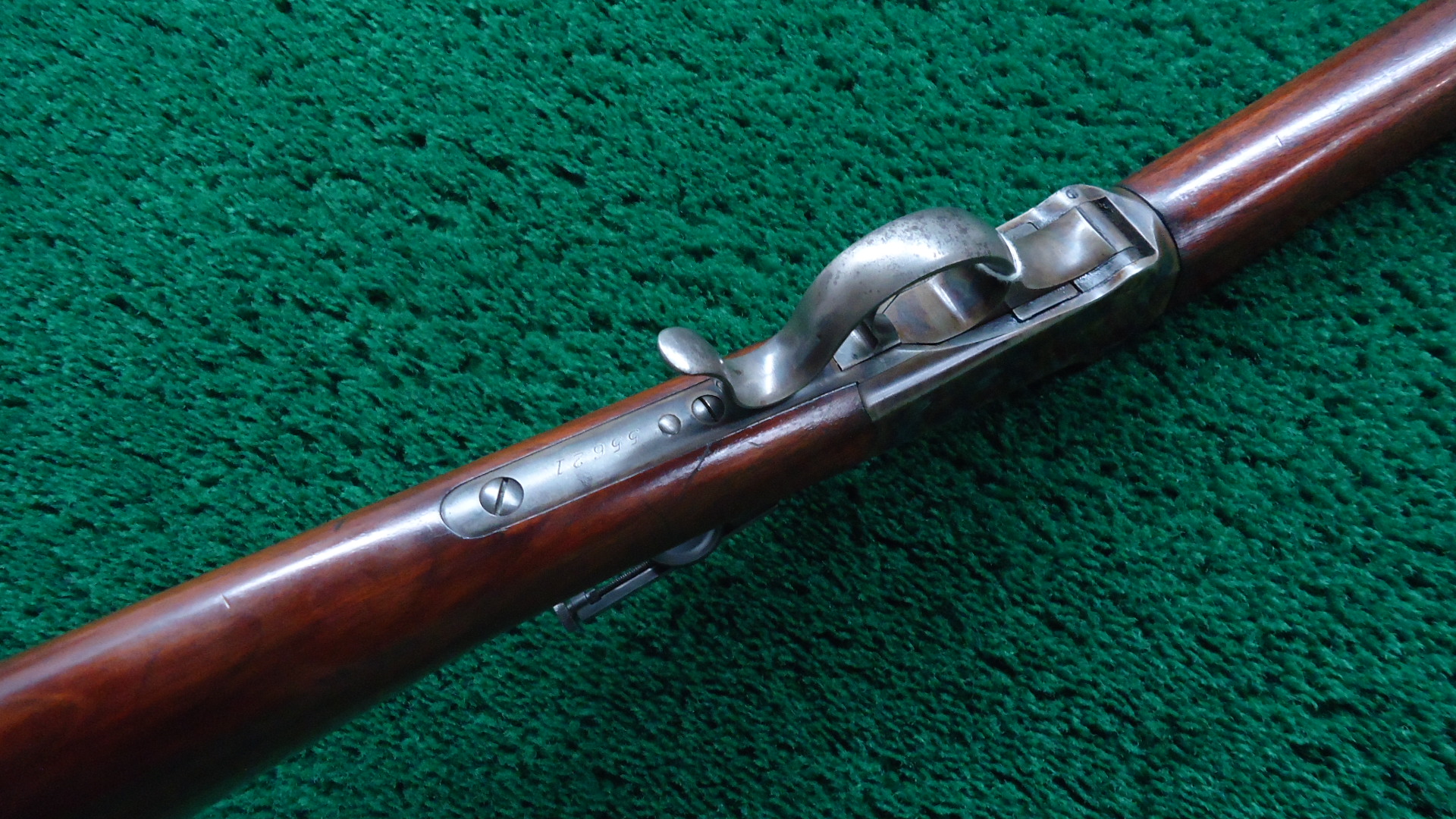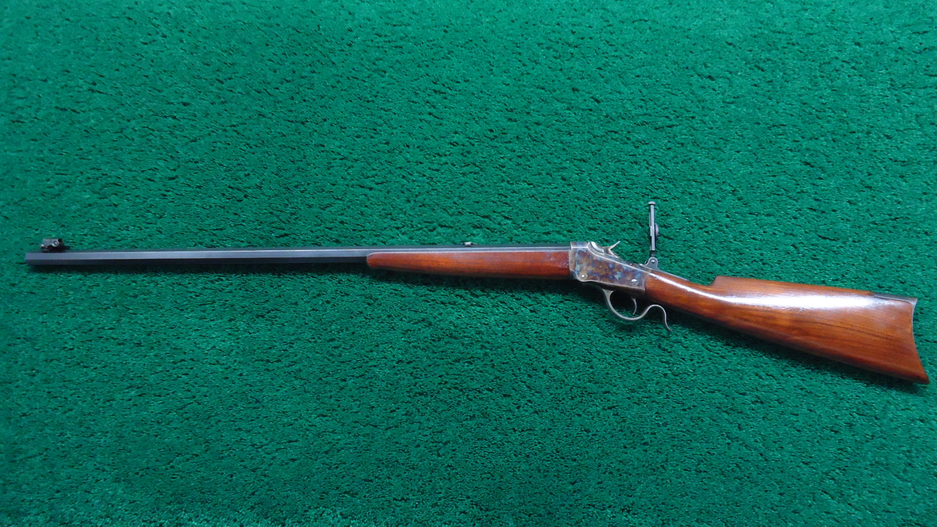 W4443 WINCHESTER MODEL 1885 LOW WALL RIFLE CHAMBERED IN 25 WCF; 28 inch octagon No. 1 weight barrel. Sights include a wind gauge globe front with spirit level, a filler in the rear dovetail and a Mid range vernier peep sight on the tang. Plain walnut forearm with matching straight grip buttstock fitted with a crescent rifle butt plate. Near excellent condition overall with the barrel showing 70% lightly freckled finish with some light pitting at the grip point. Very good bore has a few small patches of light pitting ahead of the chamber and is otherwise bright and shiny with strong rifling. The action shows 70% original case colors with a couple of patches of pitting on the right side. The stocks are solid and full fitting with very little wear and only light handling marks. Manufactured in 1892.
