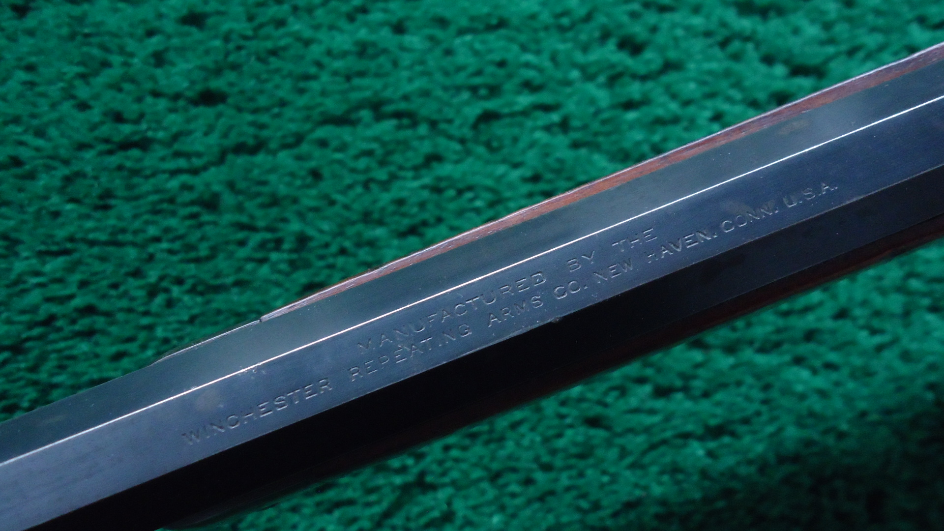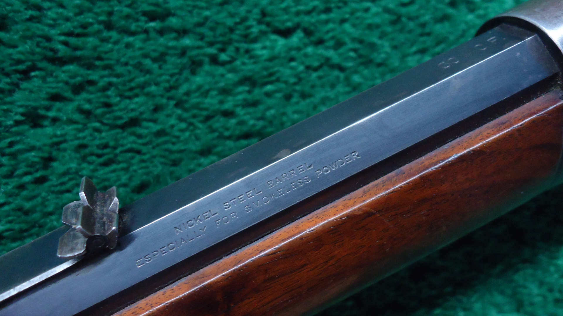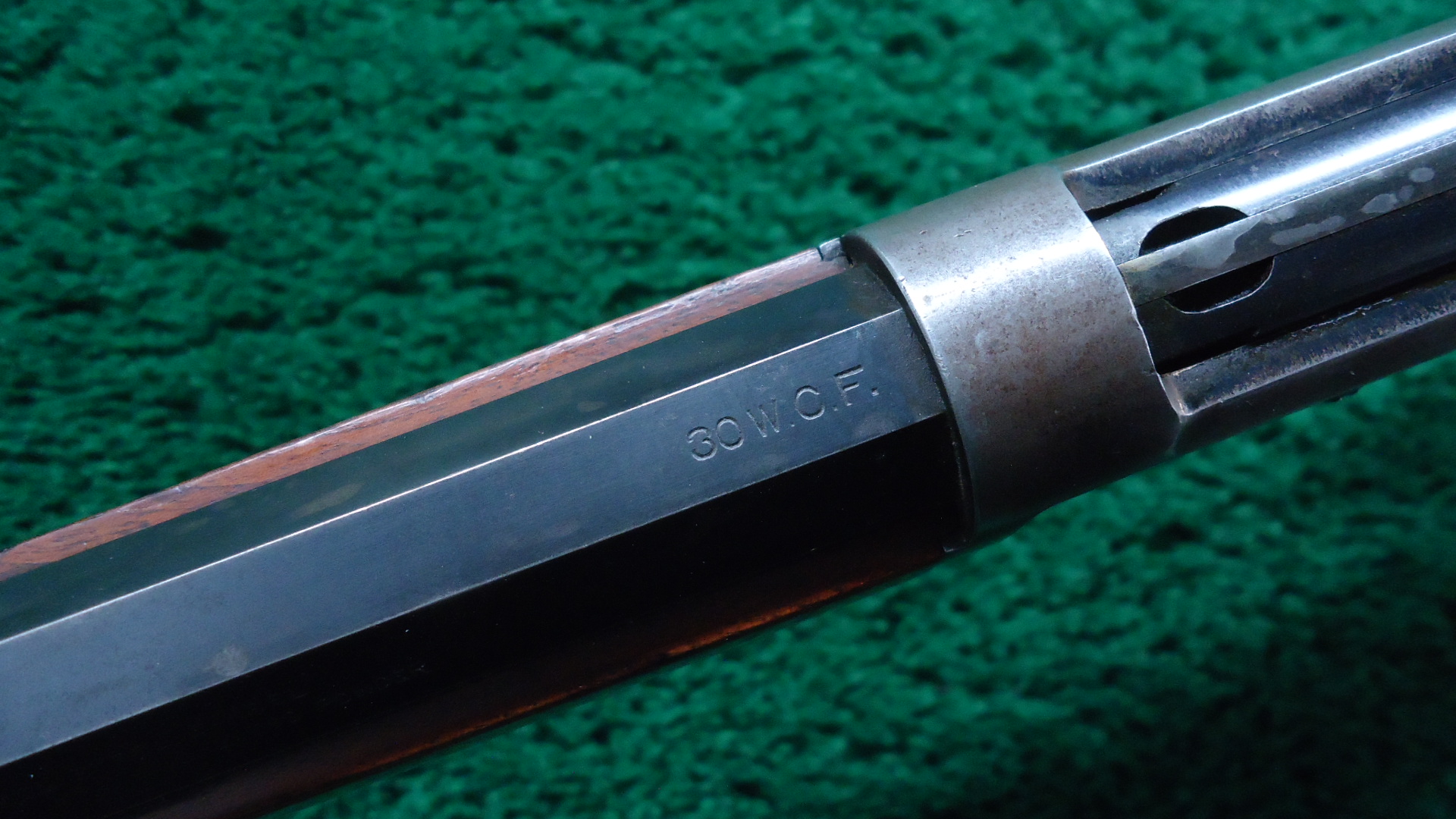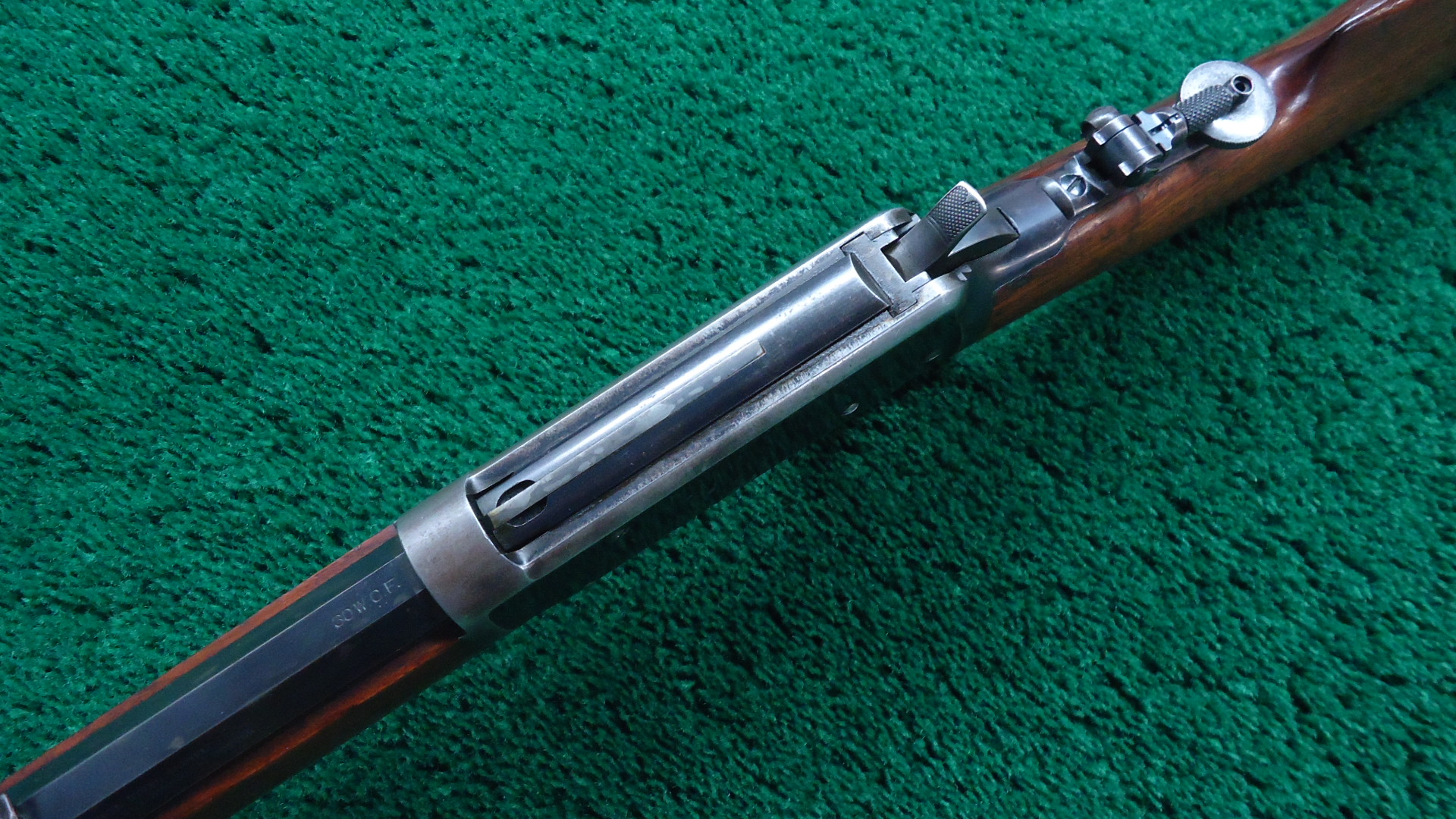 W4454 WINCHESTER MODEL 1894 RIFLE IN 30 WCF; Special order 26 inch half octagon barrel chambered in 30 WCF caliber with a bright shiny bore and good rifling. Most all blue remains on the barrel and full length magazine tube. Sights include a German silver blade front and 3 Leaf Express rear with a folding tang. Receiver retains most thinning blue with the balance toning to gray. Several light scratches. Hammer and lever have a fair amount of case colors present. Crisp tight action. Walnut stock set is in good condition with a number of dings and scratches. Crescent rifle style buttplate. Nice looking Winchester that has been taken care of with good honest wear. Manufactured in 1902.