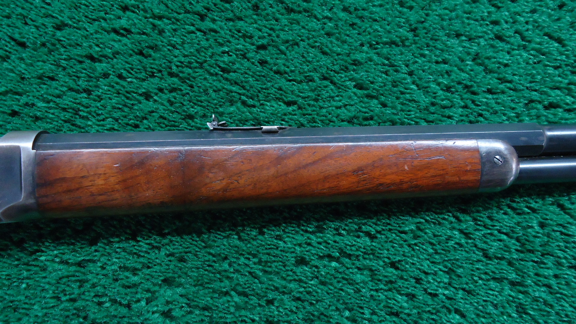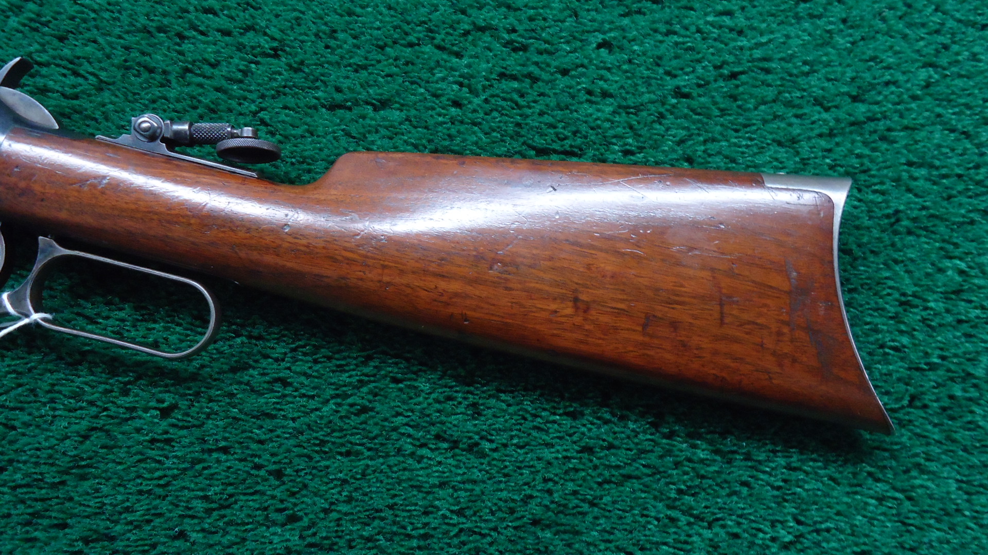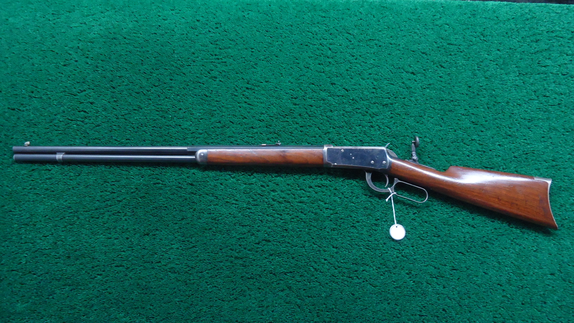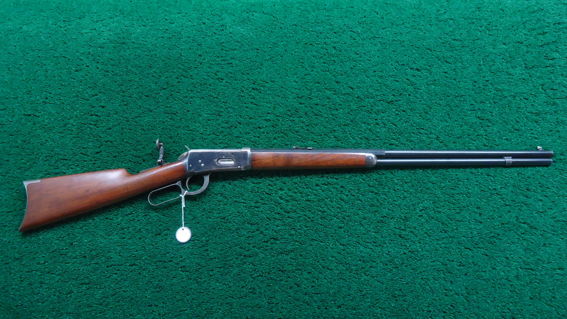 W4454 WINCHESTER MODEL 1894 RIFLE IN 30 WCF; Special order 26 inch half octagon barrel chambered in 30 WCF caliber with a bright shiny bore and good rifling. Most all blue remains on the barrel and full length magazine tube. Sights include a German silver blade front and 3 Leaf Express rear with a folding tang. Receiver retains most thinning blue with the balance toning to gray. Several light scratches. Hammer and lever have a fair amount of case colors present. Crisp tight action. Walnut stock set is in good condition with a number of dings and scratches. Crescent rifle style buttplate. Nice looking Winchester that has been taken care of with good honest wear. Manufactured in 1902.