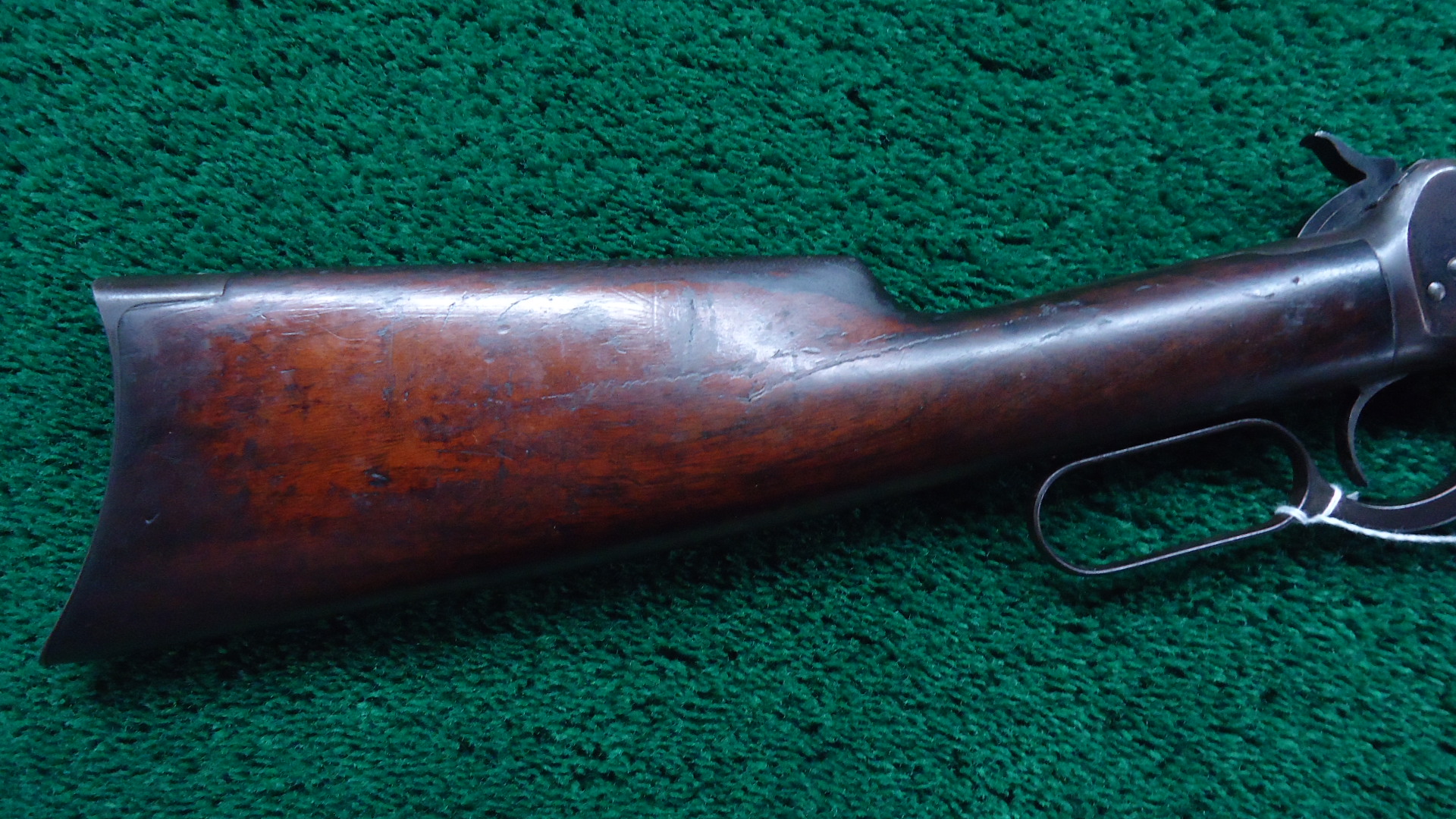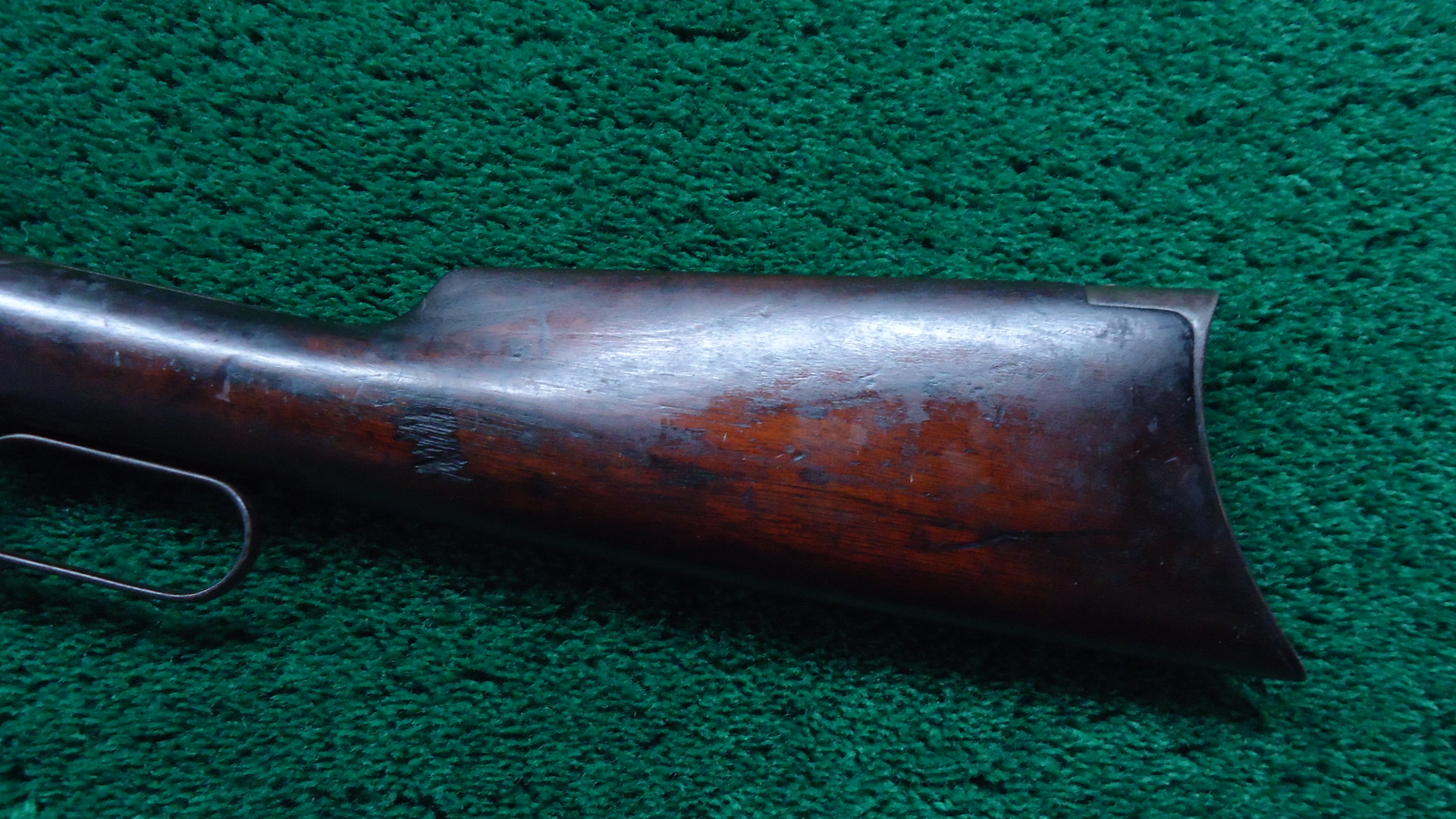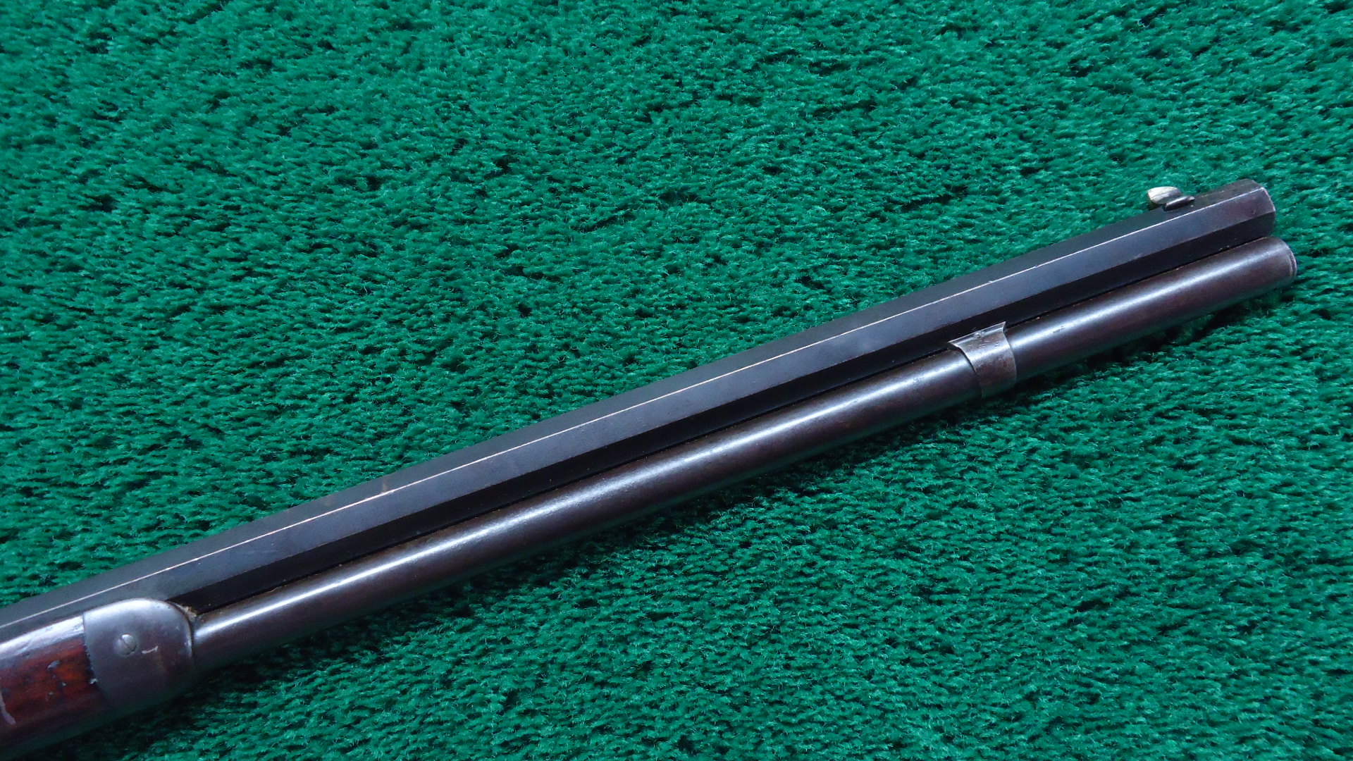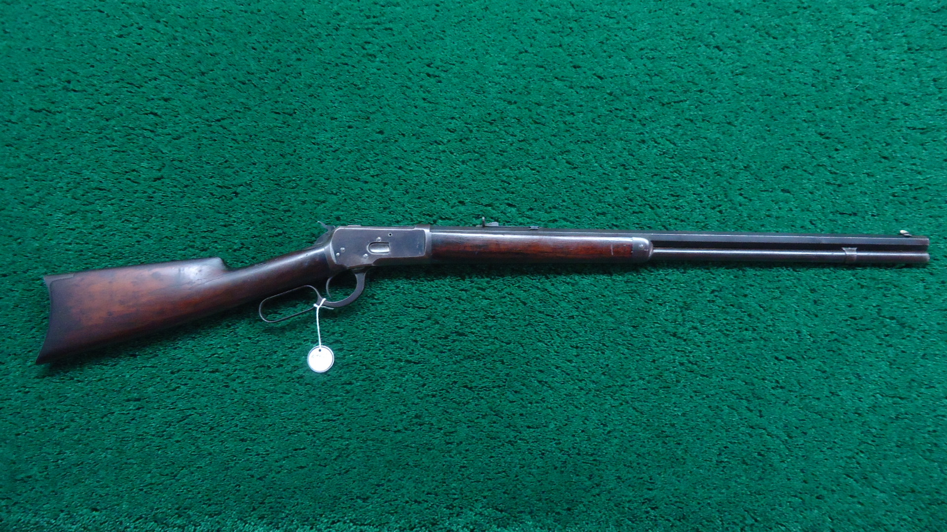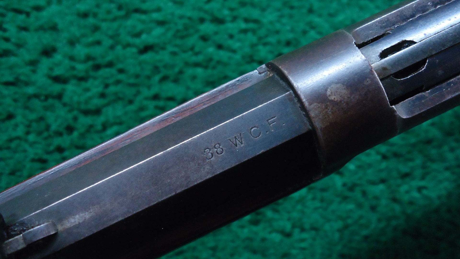 W4455 WINCHESTER MODEL 1892 RIFLE IN CALIBER 38 WCF; 24 inch octagon barrel with full length magazine. Sights include original sporting front and rear sights. Good bore with visible rifling. Gun is in good condition overall with some of the original finish and some scattered patches of light pitting/surface freckling and some scattered light dings. Hammer has been replaced with a newer style one. Wood has minor dings, scratches and a spot of surface chipping. Crescent buttplate. Mechanically excellent.