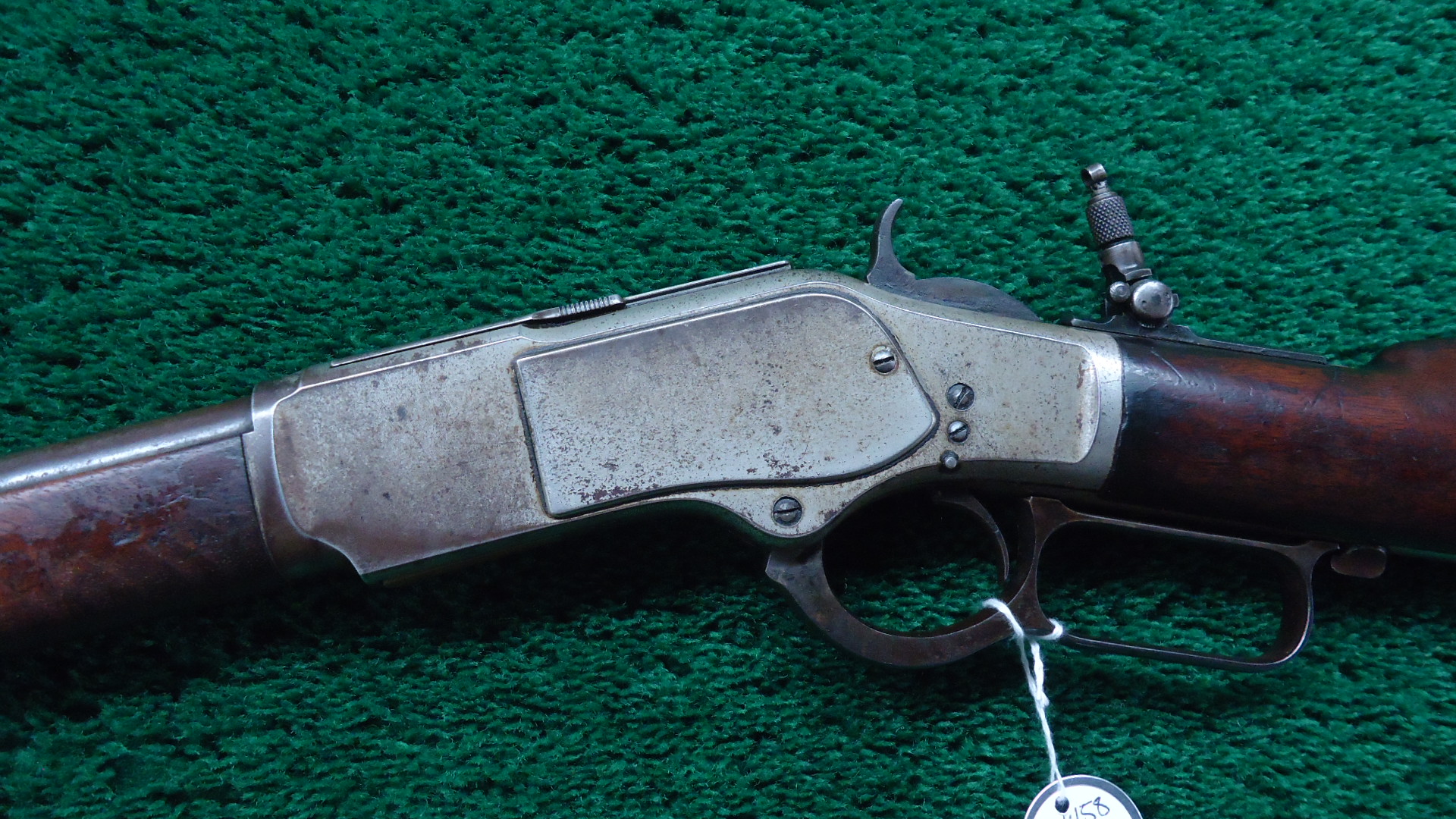 W4458 SPECIAL ORDER NICKLE TRIM WINCHESTER MODEL 1873 RIFLE IN 38 WCF; Special order Second Model with 24 inch round barrel chambered in 38 WCF caliber with a very good bore that shows strong rifling and good shine. Barrel and full length magazine tube are a brown color with blue in the protected areas as well as scattered traces of blue. Sights include a Beaches combination front and typical sporting rear with a Lyman folding tang. Receiver, forend cap and buttplate have thinning and flaking nickle plated finish. Loading gate has traces of fire blue. Hammer and lever have traces of case colors. Has the improved dust cover which slides on a center rail on top of the frame which is held in place by two screws. A set trigger that needs adjustment. Crisp action. Walnut stock set have a little extra figure and minor handling marks with a rifle style buttplate. A decent looking example of a Winchester that was special ordered by a customer who knew what they wanted. Manufactured in 1881.