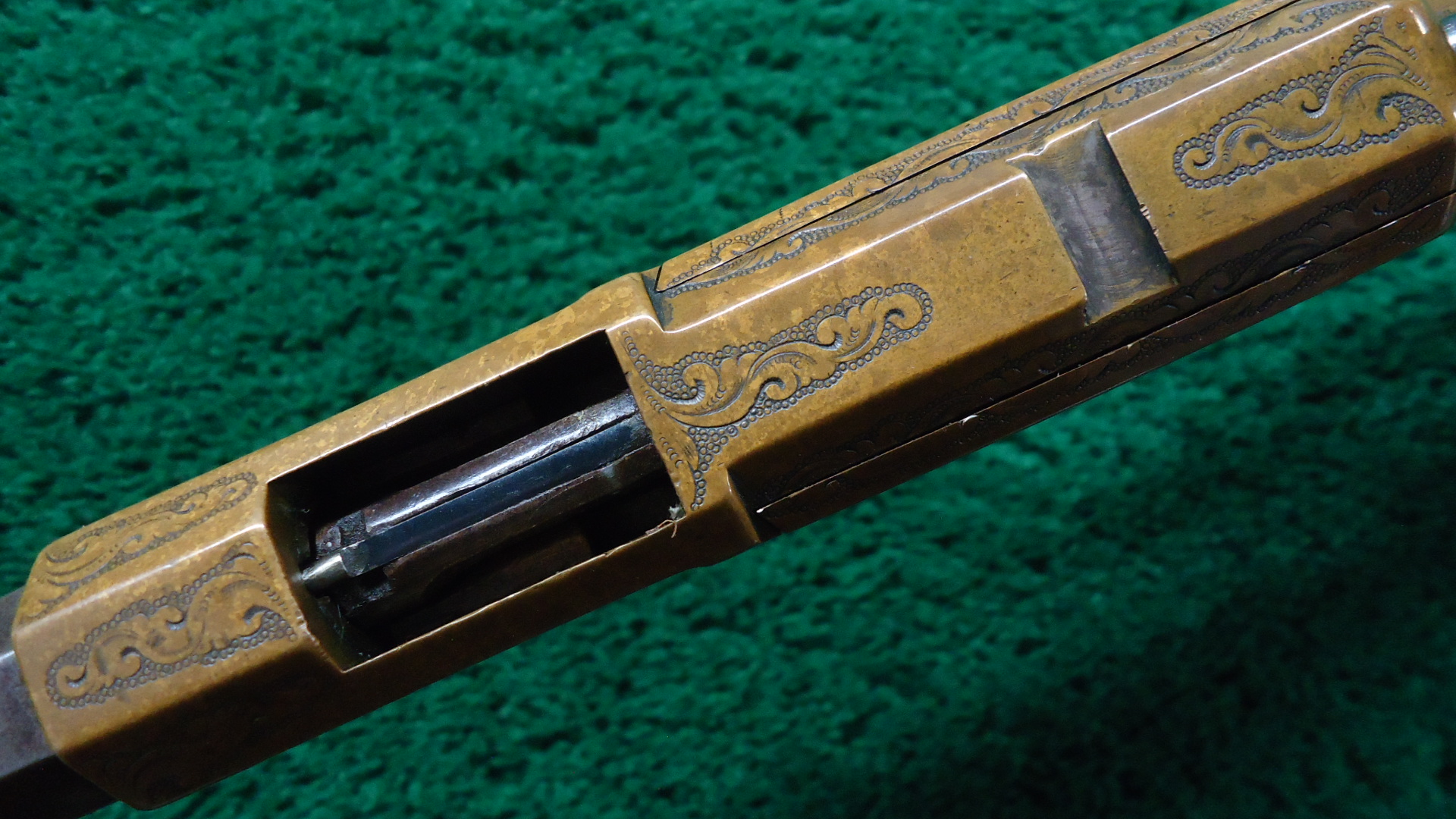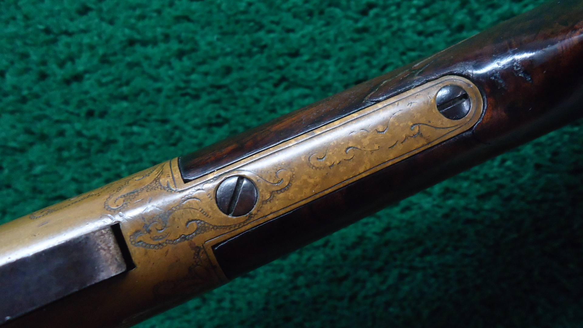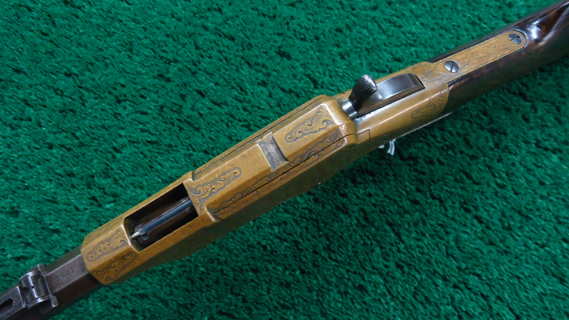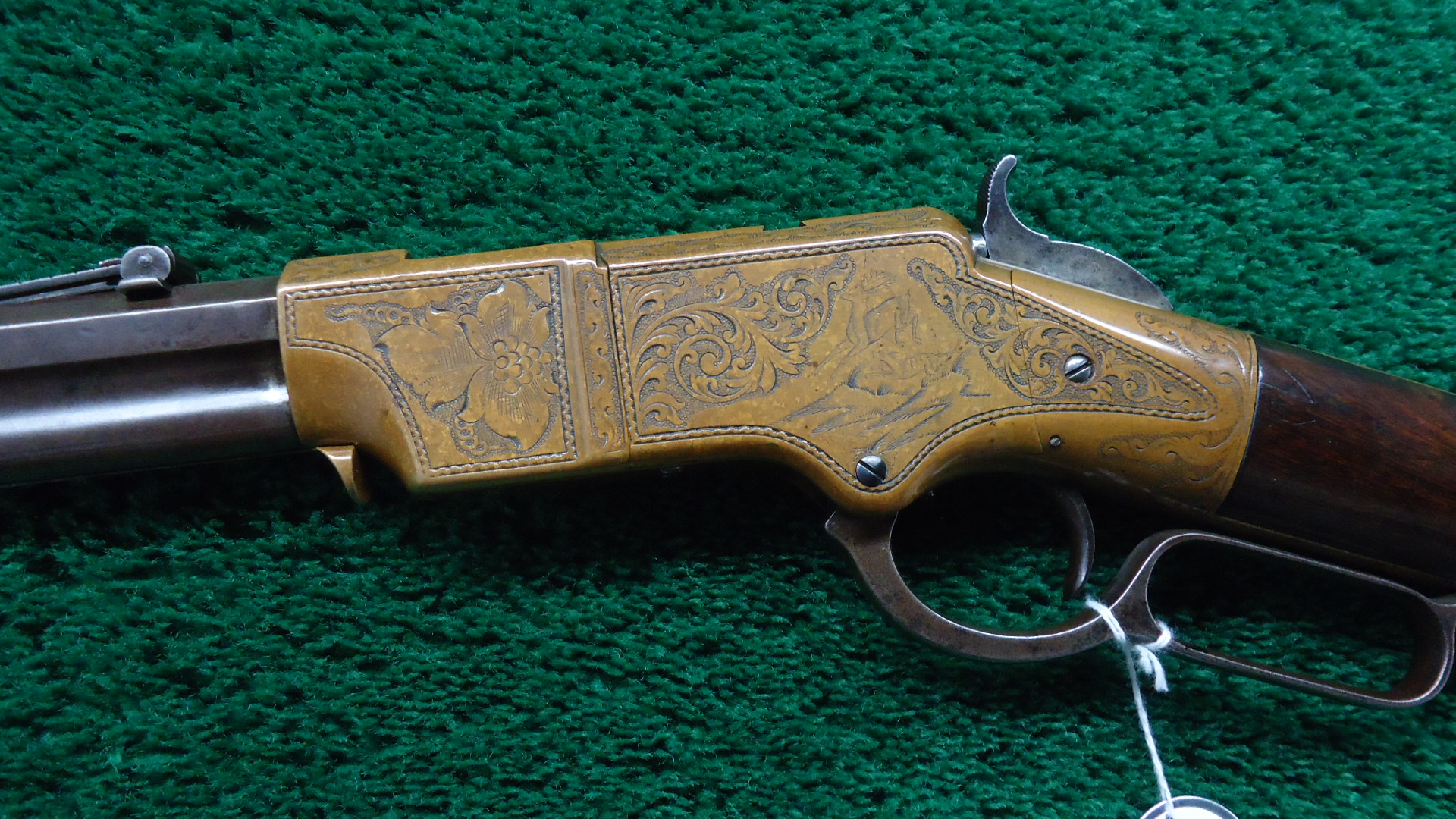 W4459 RARE FACTORY ENGRAVED CIVIL WAR HENRY RIFLE; 24 inch octagon barrel chambered in 44 RF caliber. Bore has visible six groove rifling. Original sights include the later style front blade with the high square back and a rear with a sliding bar and the number “900” stamped at the top of the folding leaf. Barrel and magazine tube are a gray/brown patina with a few small dents and dings. Brass receiver has a nice attractively aged patina and features beautiful factory engraving from Samuel Hoggson. Fine scrollwork and wavy line borders with a scene of a dog pursuing a stag on the left side plate. Hammer and lever are a brown color with hints of case colors present. Nice functioning action. Refinished deluxe American walnut stock with attractive figure has a repair in the wrist and a crack coming off the butt with some light handling mars and a coat of finish added. Also has the early style rounded heel brass buttplate. 4 piece Hickory cleaning rod is present. There are sling swivels on the left side of the rifle but no visible Henry “Bump”. A good looking example of an engraved Henry rifle that was made during the middle of the Civil War in August of 1863.