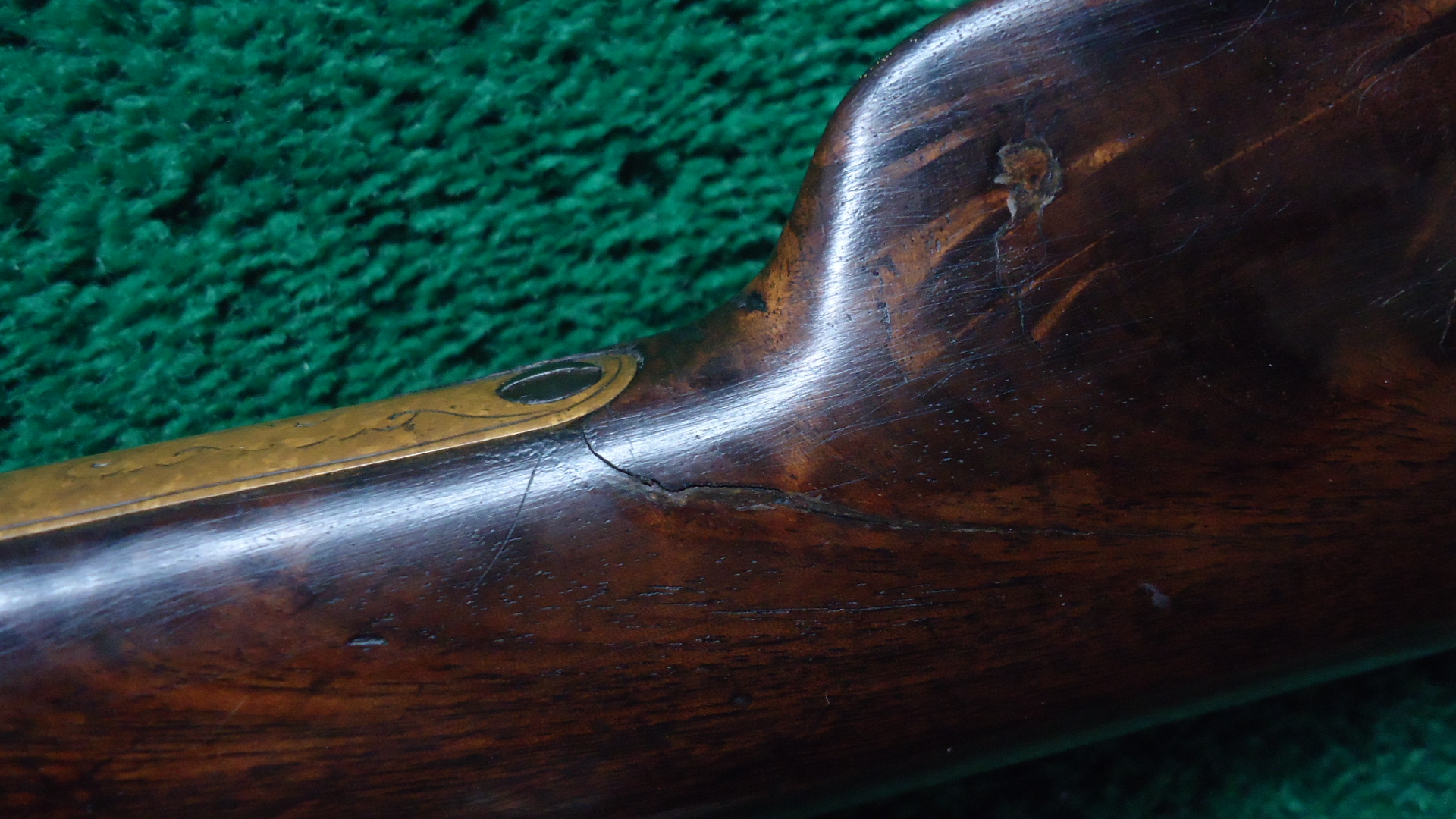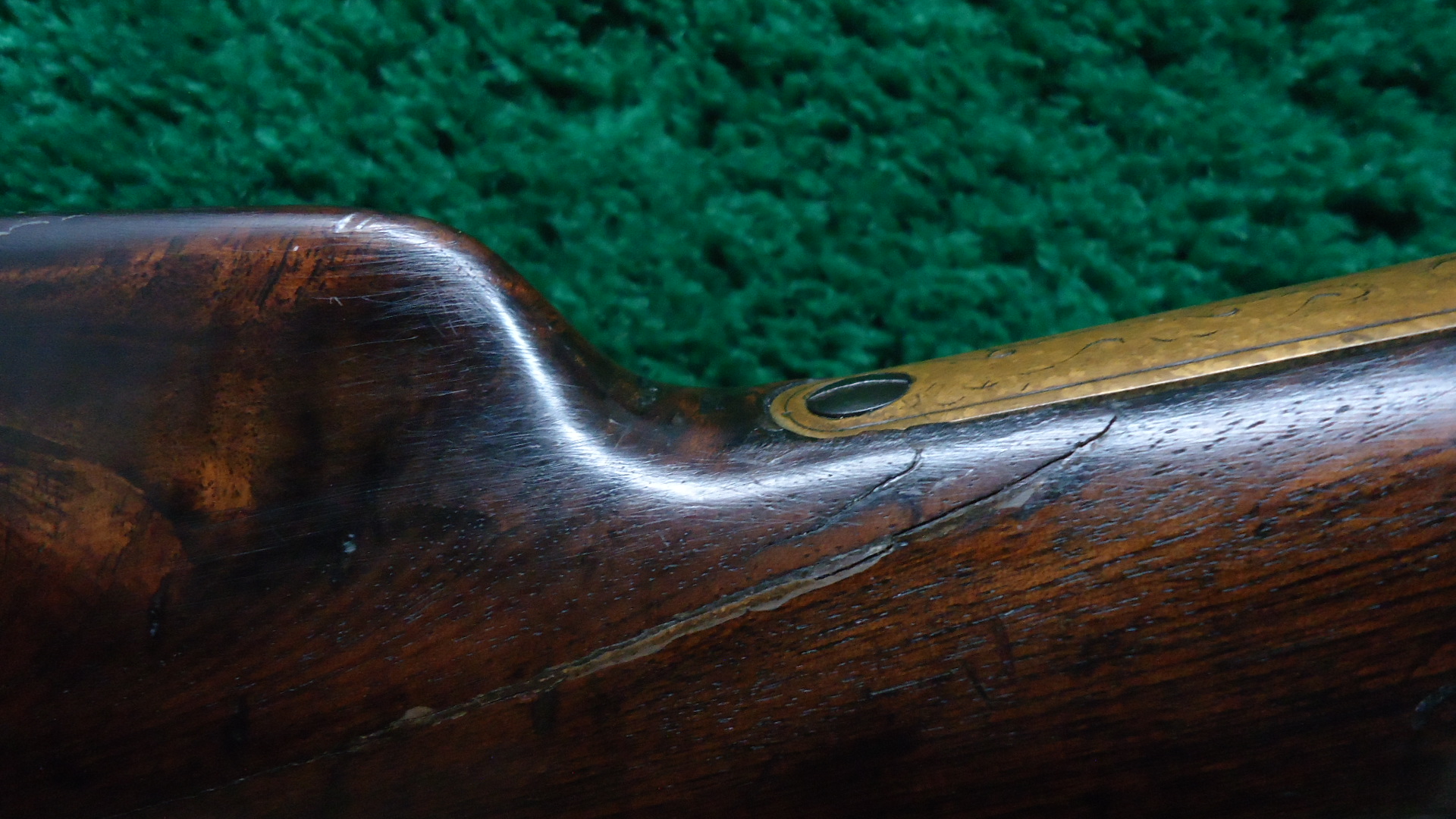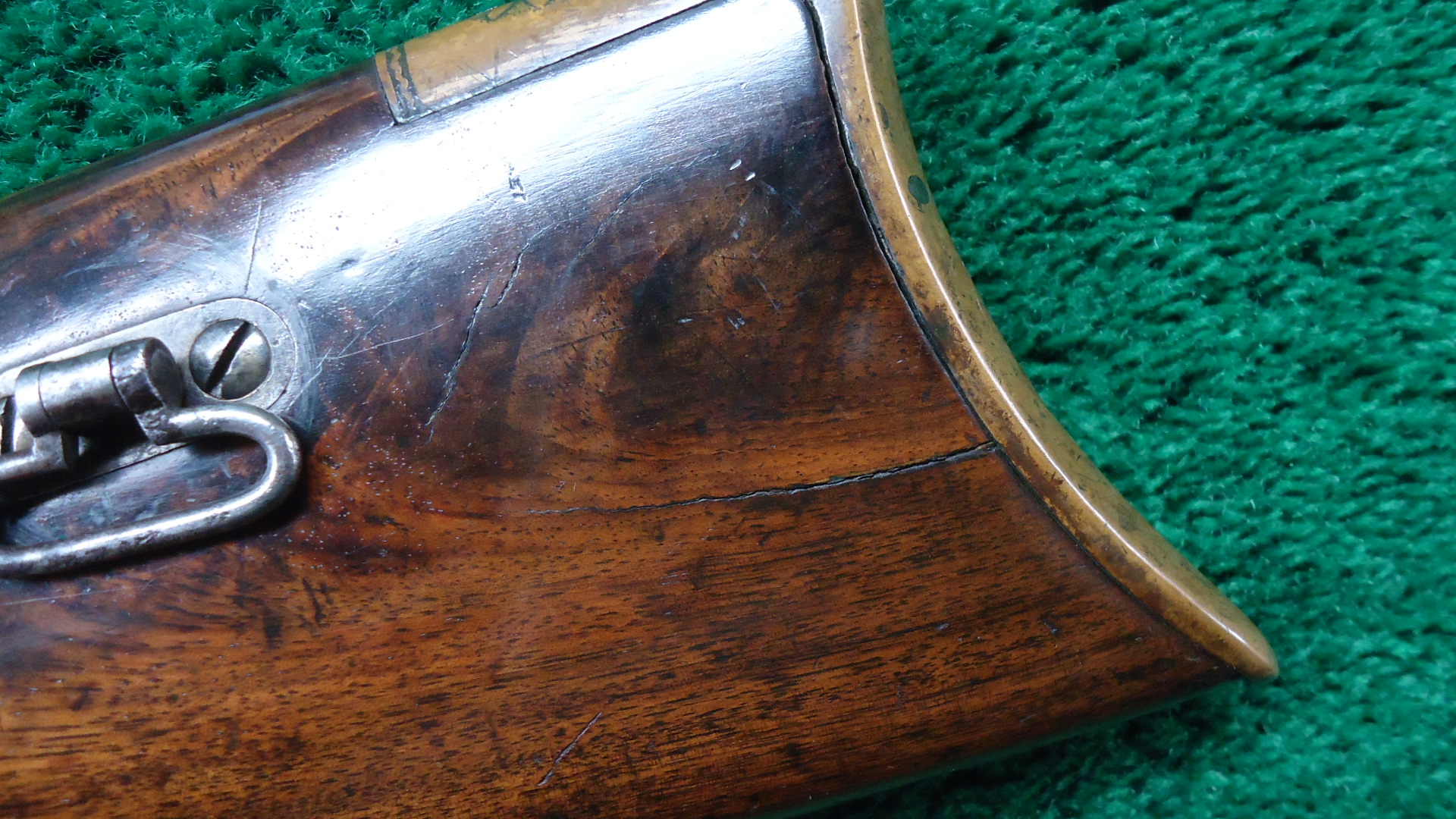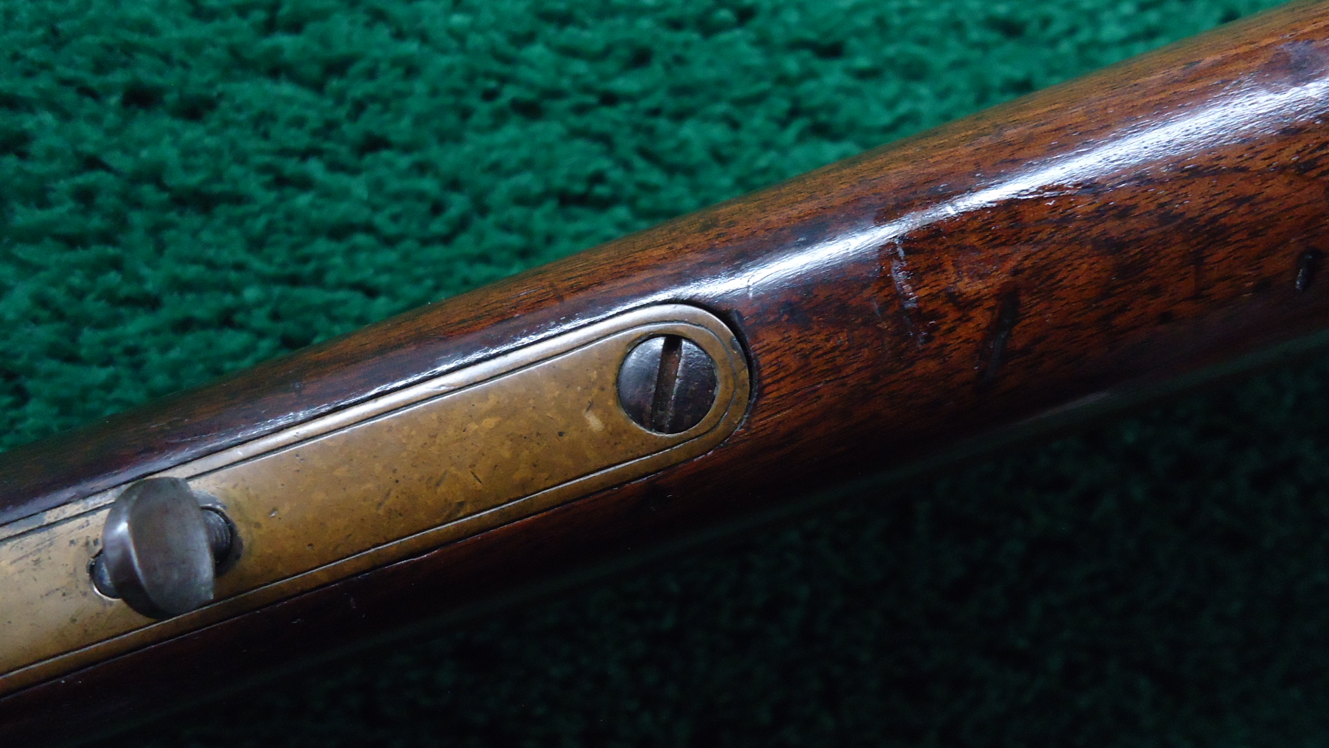 W4459 RARE FACTORY ENGRAVED CIVIL WAR HENRY RIFLE; 24 inch octagon barrel chambered in 44 RF caliber. Bore has visible six groove rifling. Original sights include the later style front blade with the high square back and a rear with a sliding bar and the number “900” stamped at the top of the folding leaf. Barrel and magazine tube are a gray/brown patina with a few small dents and dings. Brass receiver has a nice attractively aged patina and features beautiful factory engraving from Samuel Hoggson. Fine scrollwork and wavy line borders with a scene of a dog pursuing a stag on the left side plate. Hammer and lever are a brown color with hints of case colors present. Nice functioning action. Refinished deluxe American walnut stock with attractive figure has a repair in the wrist and a crack coming off the butt with some light handling mars and a coat of finish added. Also has the early style rounded heel brass buttplate. 4 piece Hickory cleaning rod is present. There are sling swivels on the left side of the rifle but no visible Henry “Bump”. A good looking example of an engraved Henry rifle that was made during the middle of the Civil War in August of 1863.