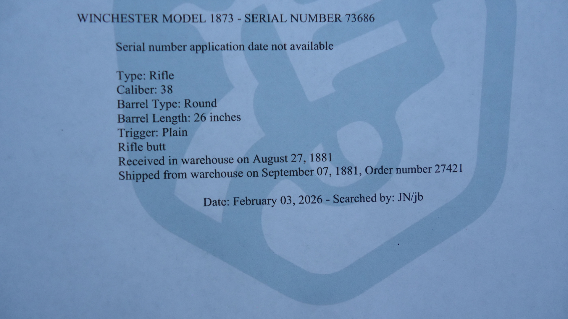 ![W4465 SPECIAL ORDER WINCHESTER MODEL 1873 RIFLE WITH 26 INCH BARREL IN 38 WCF [A] - Image 24](https://www.merzantiques.com/wp-content/uploads/2025/12/DSC00405.jpg)