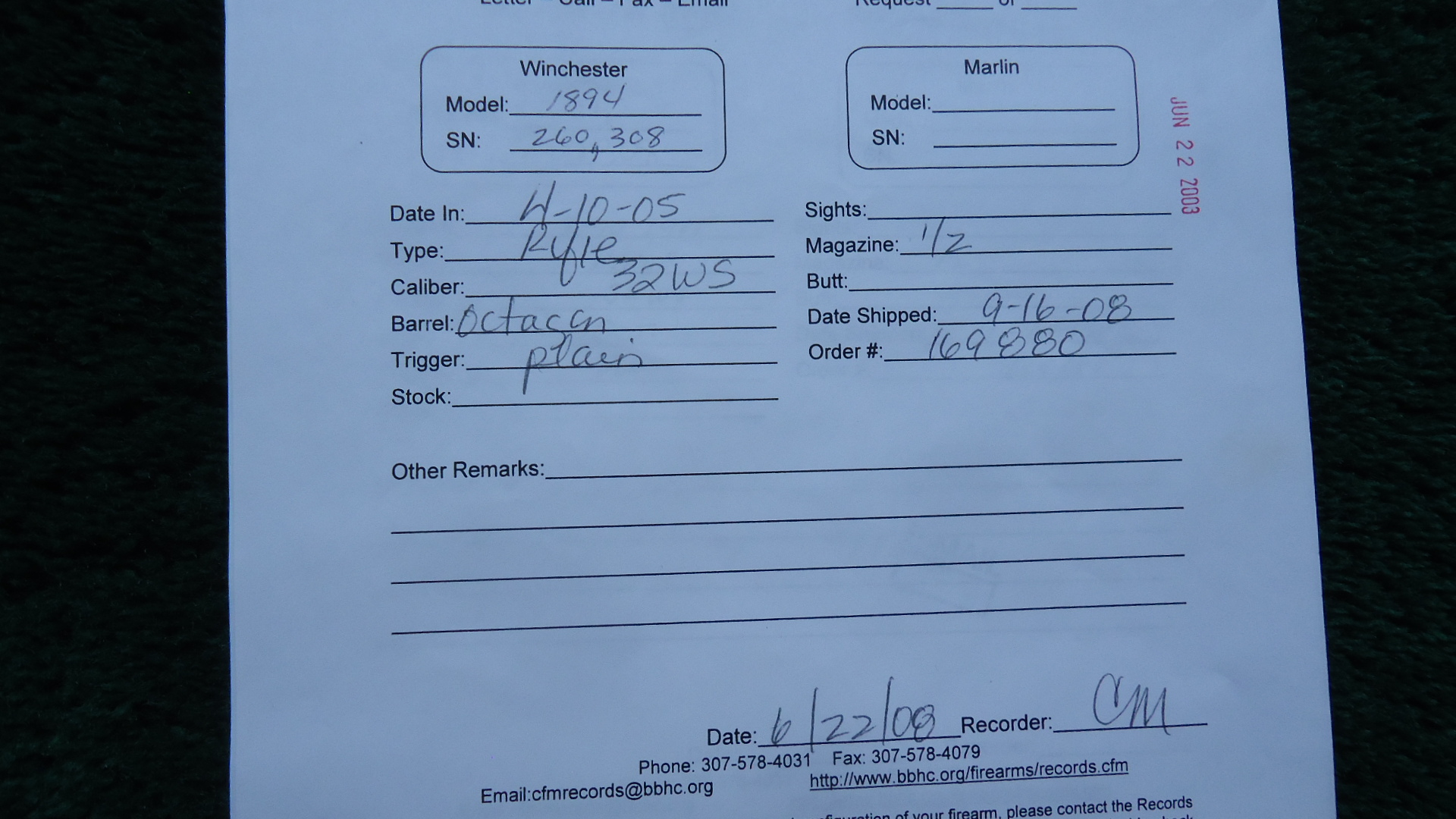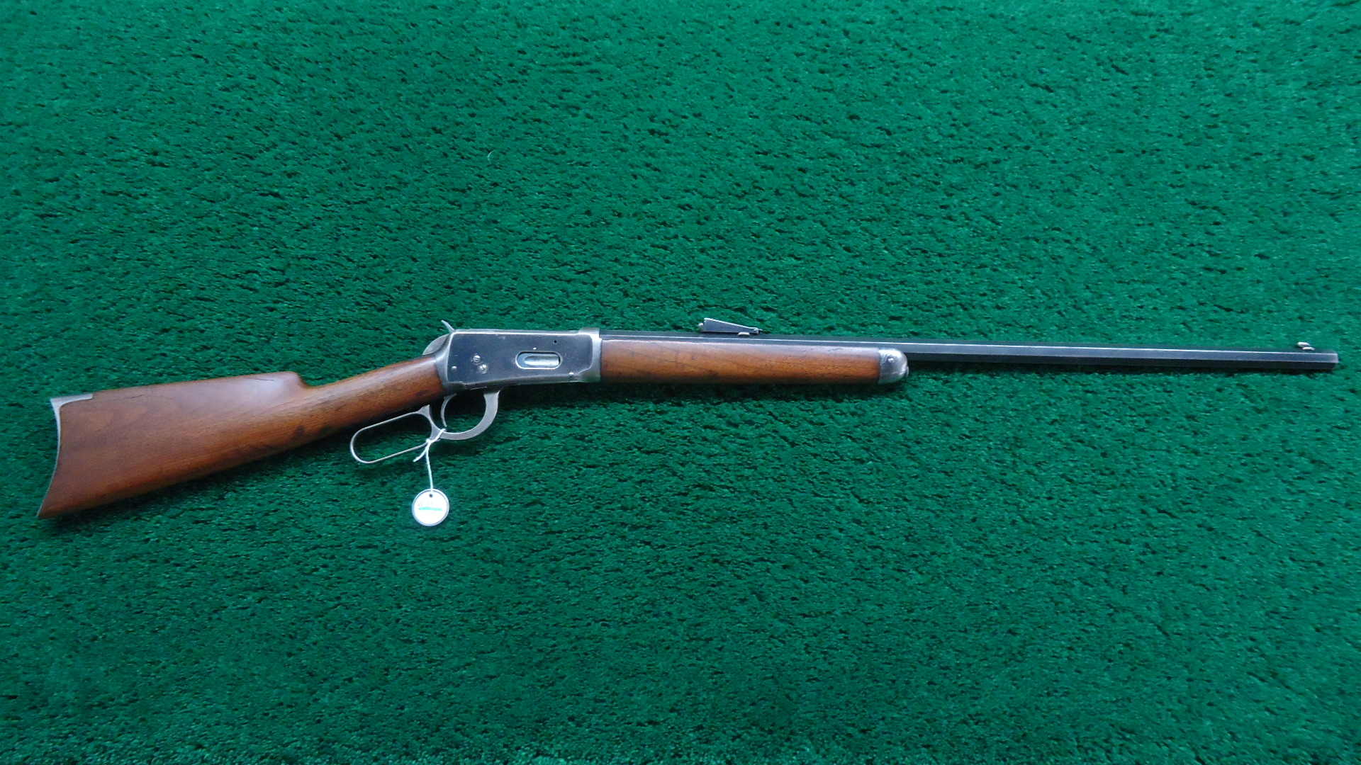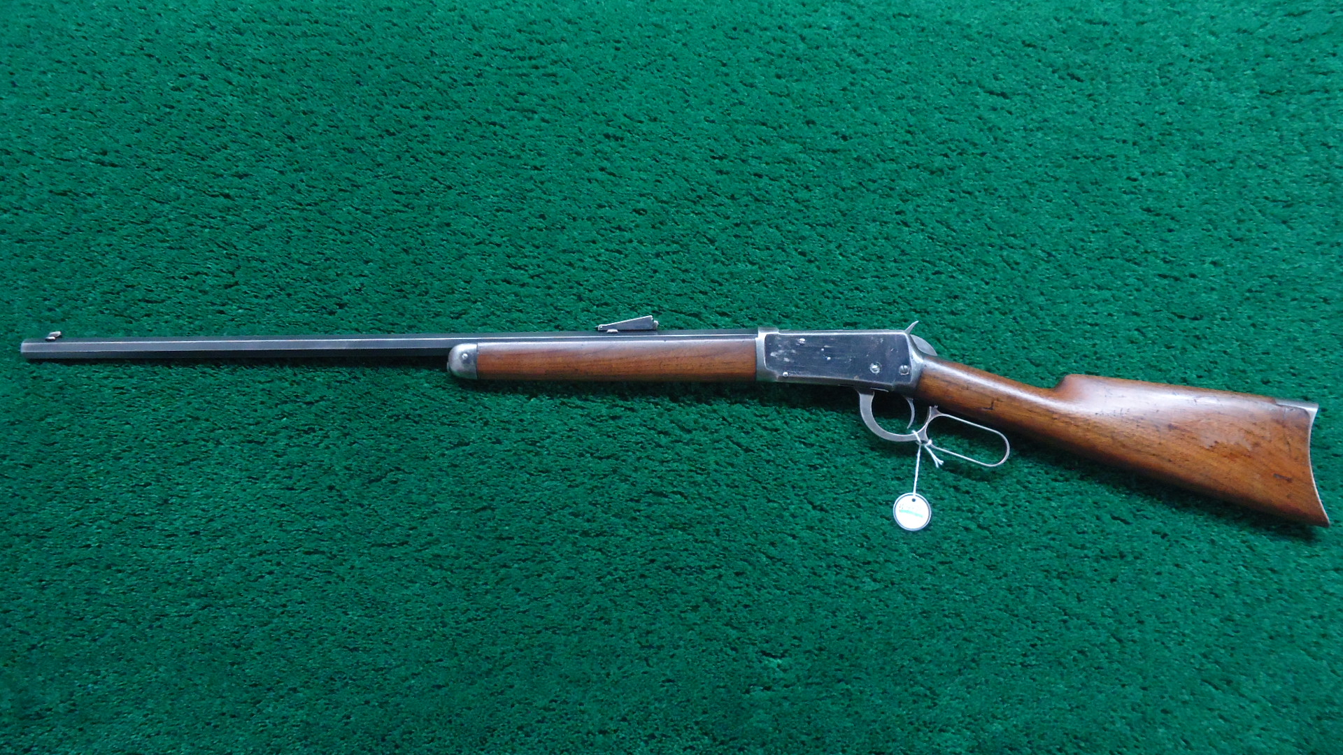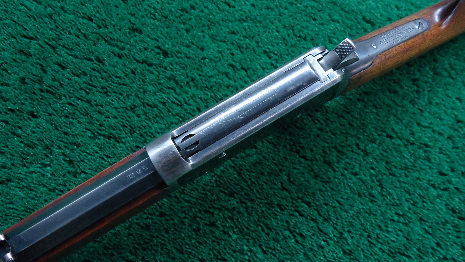 W4471 WINCHESTER MODEL 1894 RIFLE IN 32 WS CALIBER; 26 inch octagon barrel chambered in 32 WS (Winchester Special) caliber with a bright shiny excellent bore. Sights include a German silver blade front and the Smokeless 32 WS M’94 rear. Most thinning barrel blue remains with slight edge wear to the corners. Clear markings. Half length magazine. Receiver also retains most thinning blue with the high points turning gray with some light scratches. Several buggered screws. Loading gate has some nitre blue remaining. Hammer and lever have some traces of case colors. Crisp functioning action. Straight grain walnut stocks are in good condition with the usual handling and usage mars with a rifle style crescent buttplate. Comes with an old Cody research form stating the configuration and 1905 manufacture date.